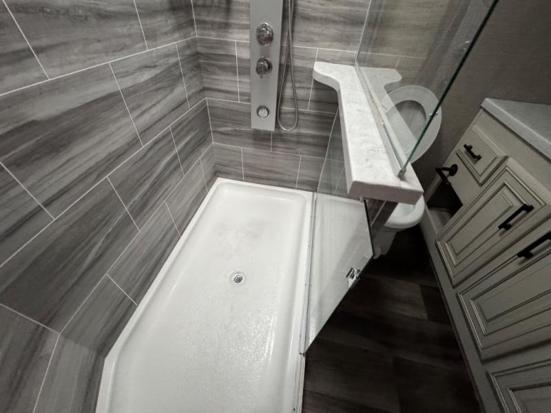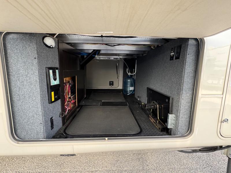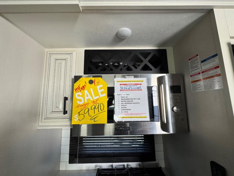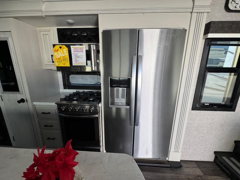 Take your camping trips up a notch in this luxurious fifth wheel! Your family will love to visit in the rear living area on the tri-fold sofa or theater seat, plus there is a free-standing table here to dine at together. The TV lift and fireplace will make it feel more like home, along with the kitchen island and residential refrigerator. Head up the steps to find cabinets for the optional washer and dryer, a full bath with a large bath vanity, plus a private bedroom up front you are sure to love. When you aren't resting on the king bed slide out, read a book on the front window seat, or watch a movie with the bedroom TV provided. There is even a bedroom fireplace for added comfort. And check out the exterior with two power awnings with LED lights and a 32" TV!