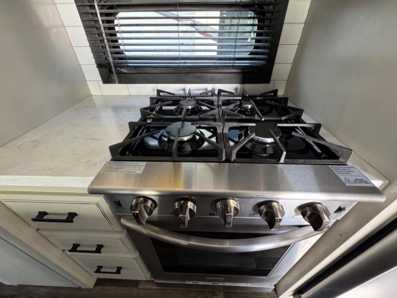 Each Pinnacle fifth wheel features Stronghold VBL lamination for the lightest, yet strongest construction in the RV industry. Add that to the Magnum Truss XL6 roof system and Climate Shield zero-degree tested weather protection and you'll be enjoying your fifth wheel for years to come. Some of the exterior conveniences you will appreciate are the Keyed-Alike lock system, the fully enclosed, universal docking center, and the 6-point hydraulic auto-leveling system for quick and easy set up. The 5 Star Handling Package will make towing a fifth wheel a walk in the park, and the two Whisper Quiet A/C units will keep you comfortable during the hot summer months. Inside, you'll enjoy the farmhouse stainless steel sink, the handcrafted hardwood glazed cabinetry, the vinyl flooring throughout, plus many more comforts. There is even a central vacuum system, a wireless remote control system, USB ports throughout, plus many more conveniences to make each trip enjoyable.