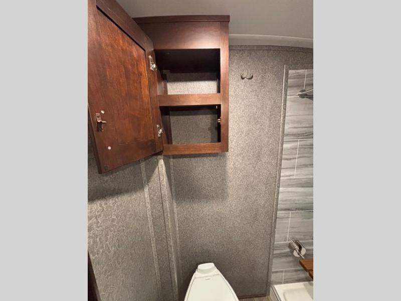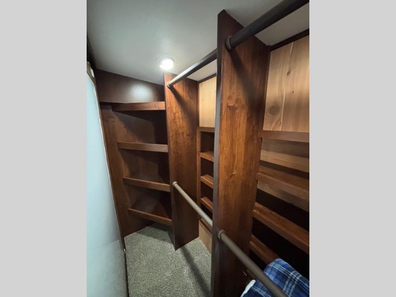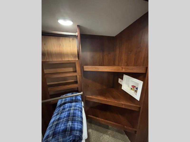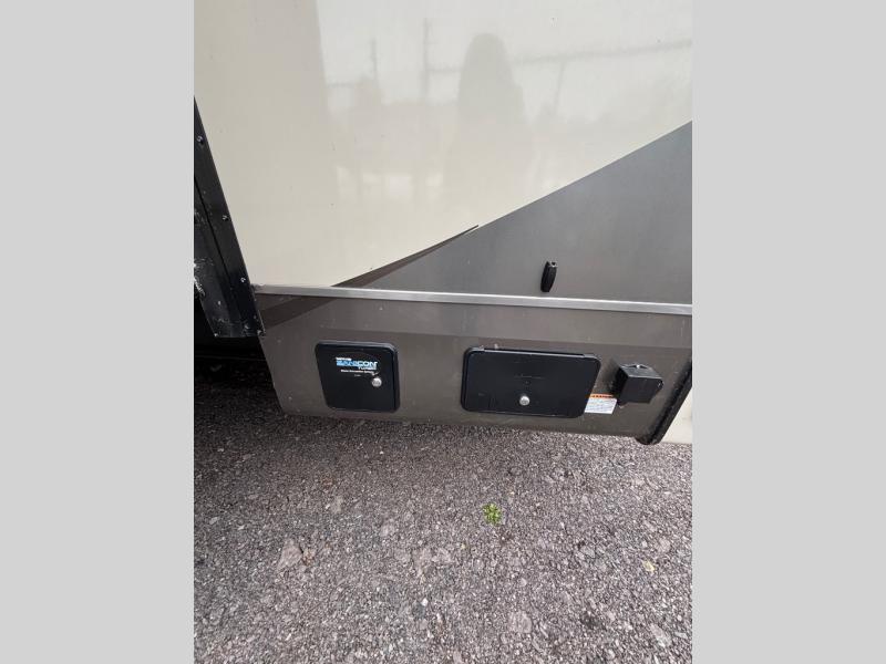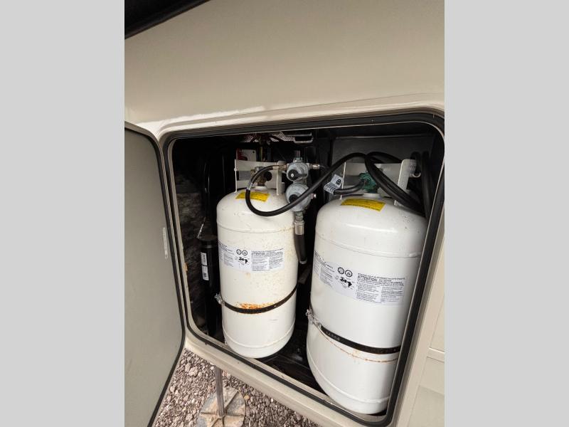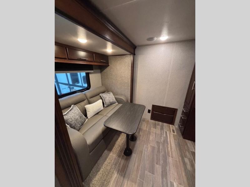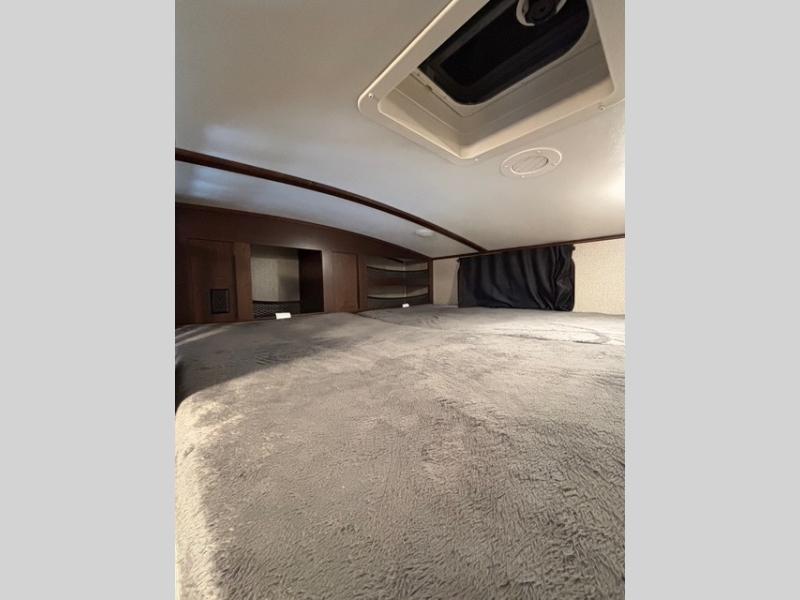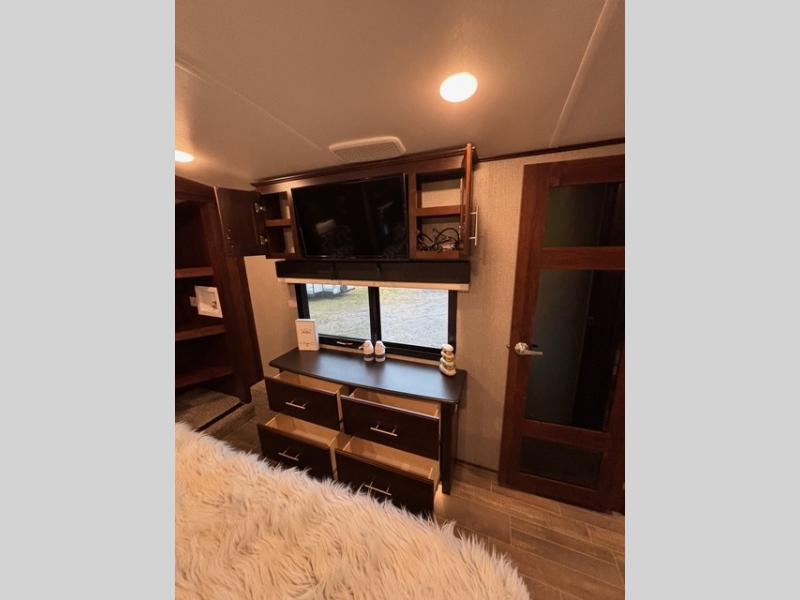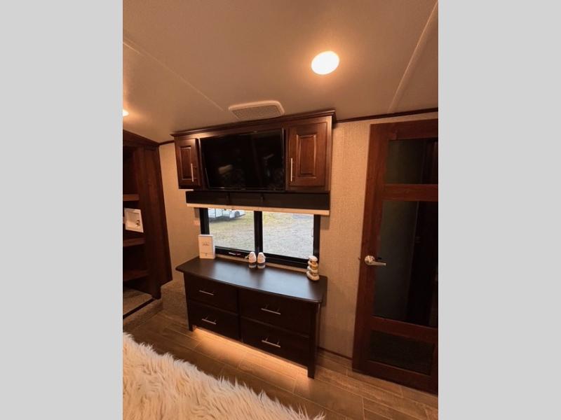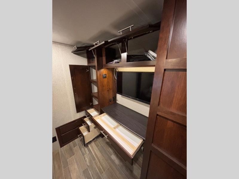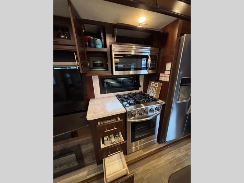 Wow! Check out this fifth wheel packed with luxury features for your crew of eight. The middle den/office includes a sofa with a table, a desk with a TV above it, plus a loft for the little ones or extra storage space. You will have the front private bedroom all to yourselves with a king bed, a 32" TV, plus a walk-in closet with tons of storage space. The chef of your group will have a kitchen island with a countertop extension for extra prep space, plus this model includes an outside kitchen they are sure to enjoy. Put out the dual power awnings and turn the game on the exterior 32" TV to let the party begin! You can wind down the night by relaxing on the theater seat across from the TV and fireplace, or play a game of cards at the free-standing table!