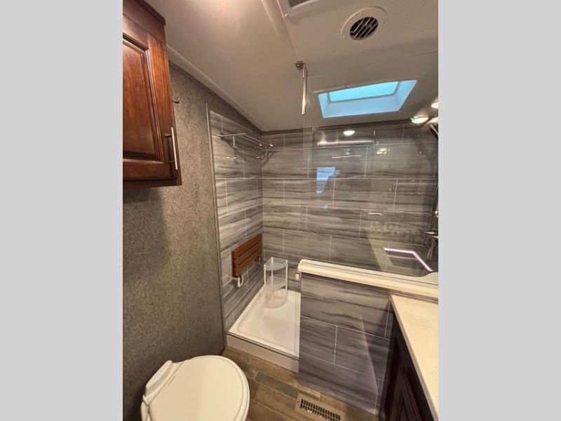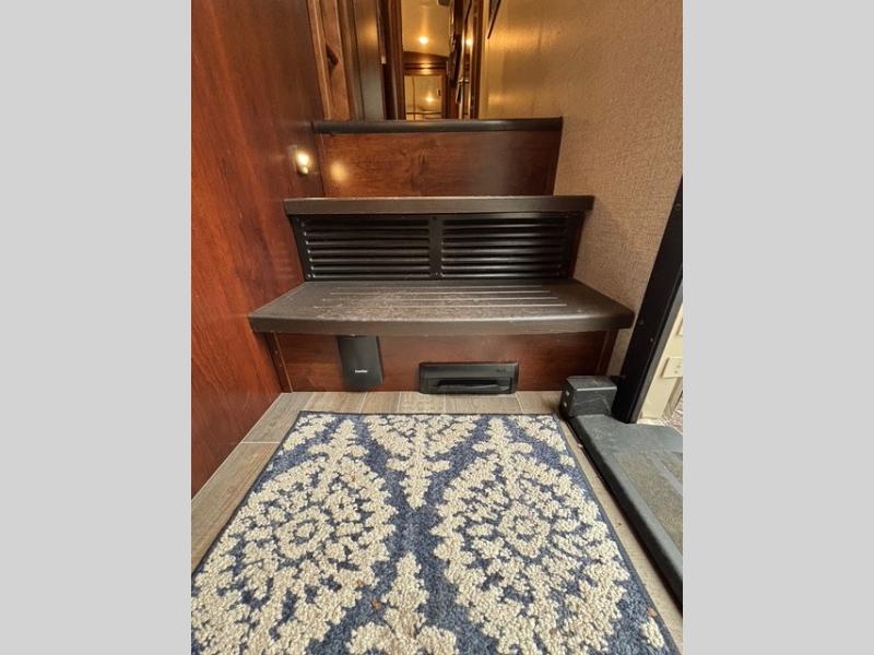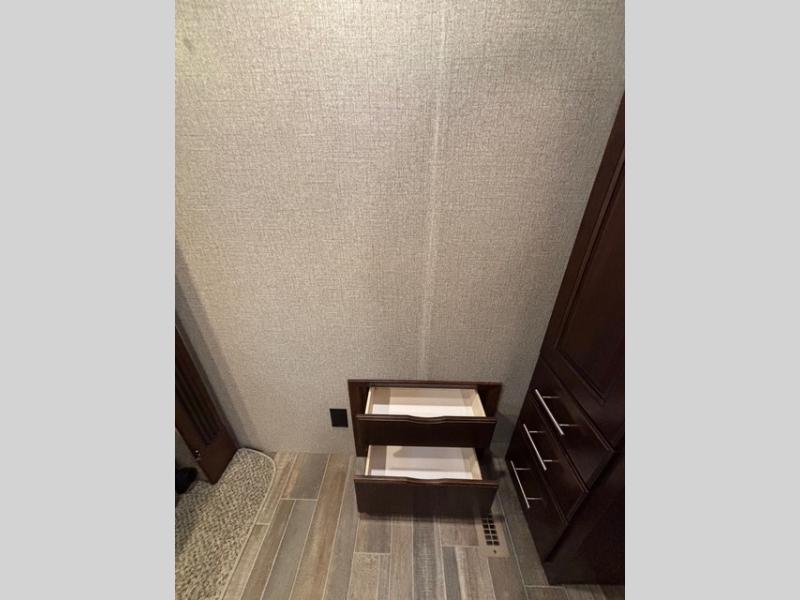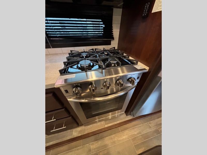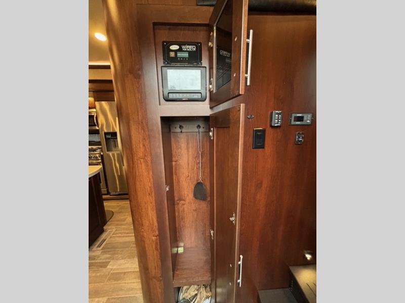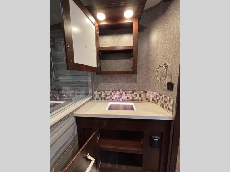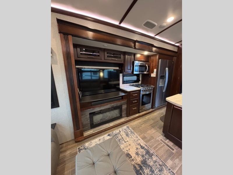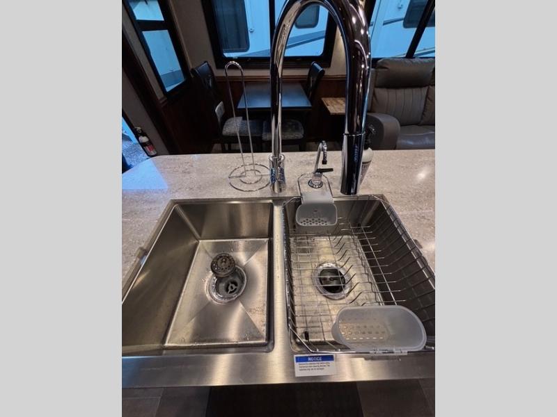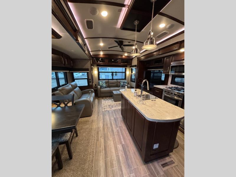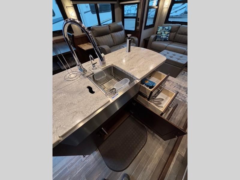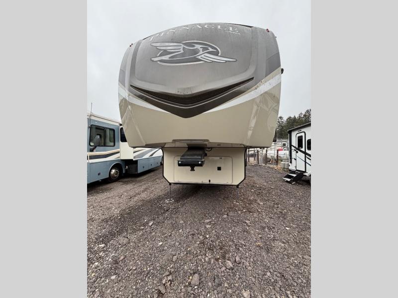 Each Pinnacle fifth wheel features Stronghold VBL lamination for the lightest, yet strongest construction in the RV industry. Add that to the Magnum Truss XL6 roof system and Climate Shield zero-degree tested weather protection and you'll be enjoying your fifth wheel for years to come. Some of the exterior conveniences you will appreciate are the Keyed-Alike lock system, the fully enclosed, universal docking center, and the 6-point hydraulic auto-leveling system for quick and easy set up. The 5 Star Handling Package will make towing a fifth wheel a walk in the park, and the two Whisper Quiet A/C units will keep you comfortable during the hot summer months. Inside, you'll enjoy the farmhouse stainless steel sink, the handcrafted hardwood glazed cabinetry, the vinyl flooring throughout, plus many more comforts. There is even a central vacuum system, a wireless remote control system, USB ports throughout, plus many more conveniences to make each trip enjoyable.