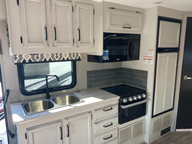 Easily load up and head out for adventure in this Redhawk with sleeping space for five, a full bathroom, and kitchen amenities to stay fed the whole trip. Once at your campsite, easily let out the slide and the 16' electric awning and plan your next activity. You an use the full bath, make a meal in the kitchen with the Furrion all-in-one cooktop and oven, plus the residential-size microwave, and grab your beverage from the 8 cu. ft. refrigerator. The driver and passenger seats swivel for more interior seating, and if you like choose the theater seating option in place of the U-shaped dinette. And at night retire to your queen bed.