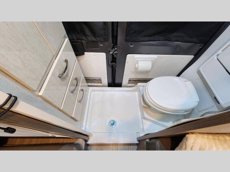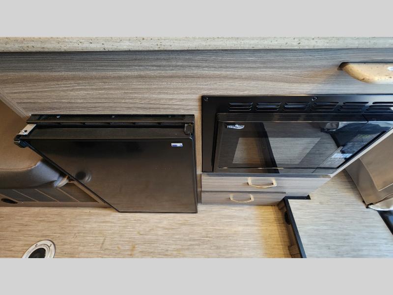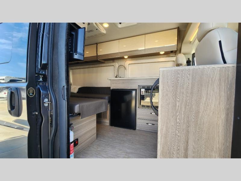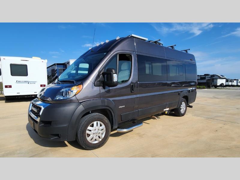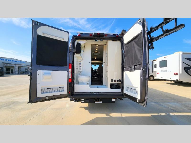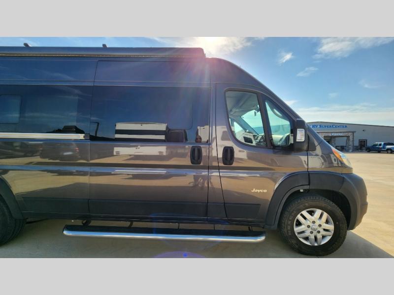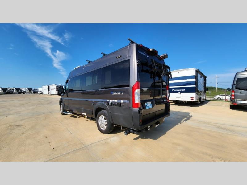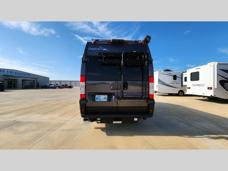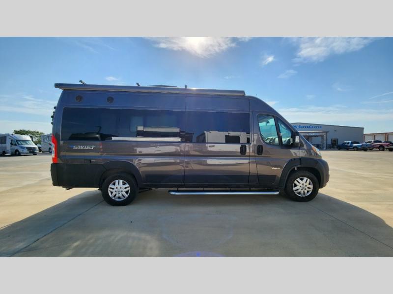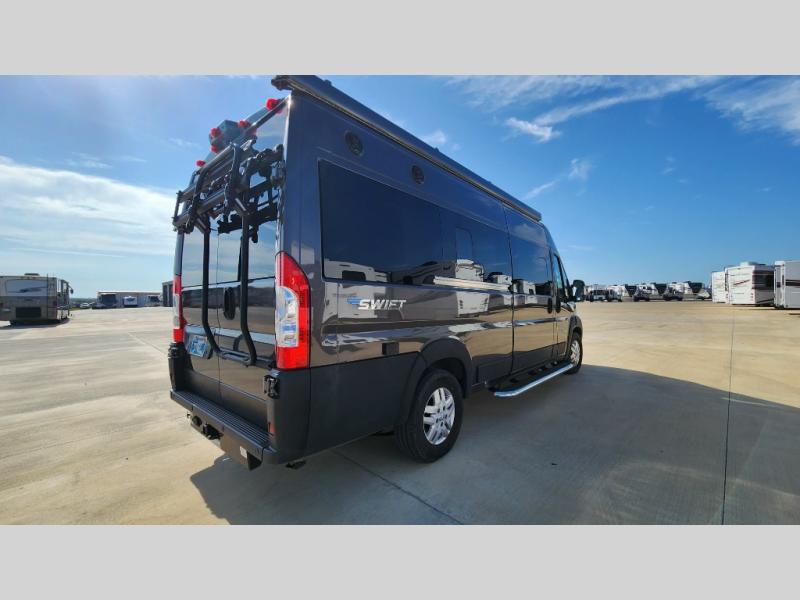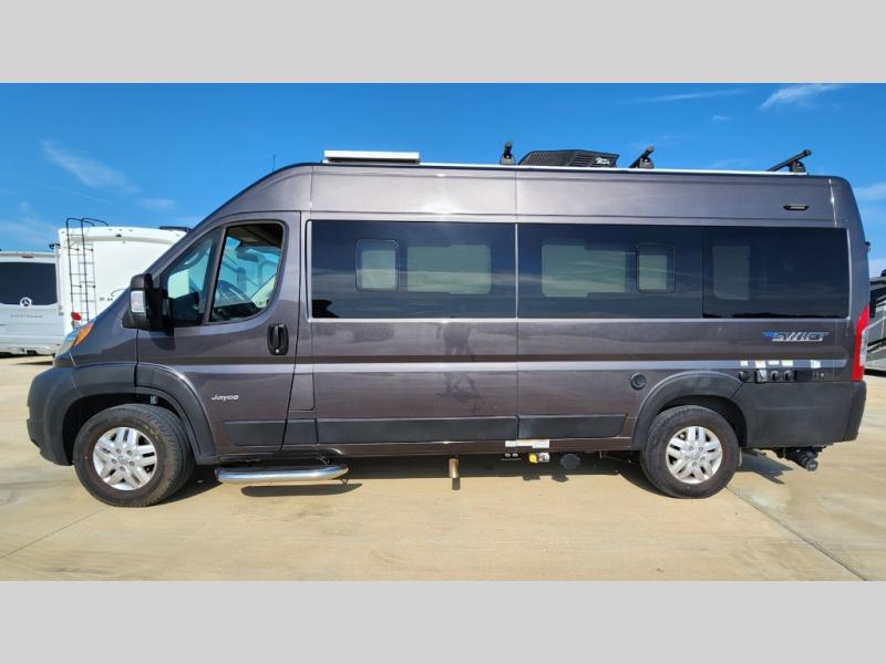 The Swift Class B gas motorhome by Jayco starts with a RAM ProMaster 3500 window van chassis with a 3.6L V6 VVT engine to power your adventures near and far. Off-grid camping is made hassle-free with the 190-watt roof-mounted GoPower solar panel, plus there is a Thule bike rack and three Thule roof racks for all your gear. Each model includes the JRide system with Hellwig helper springs and a heavy-duty rear stabilizer bar for smooth handling, and the Thule armless patio awning with LED lights will create an outdoor living space you are sure to love. Head inside to find a solid surface kitchen countertop with a pull-out extension, four sliding vented windows, a soft-touch vinyl ceiling, plus many more comforts.