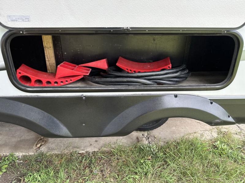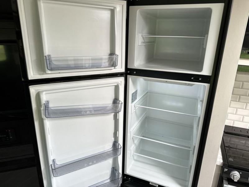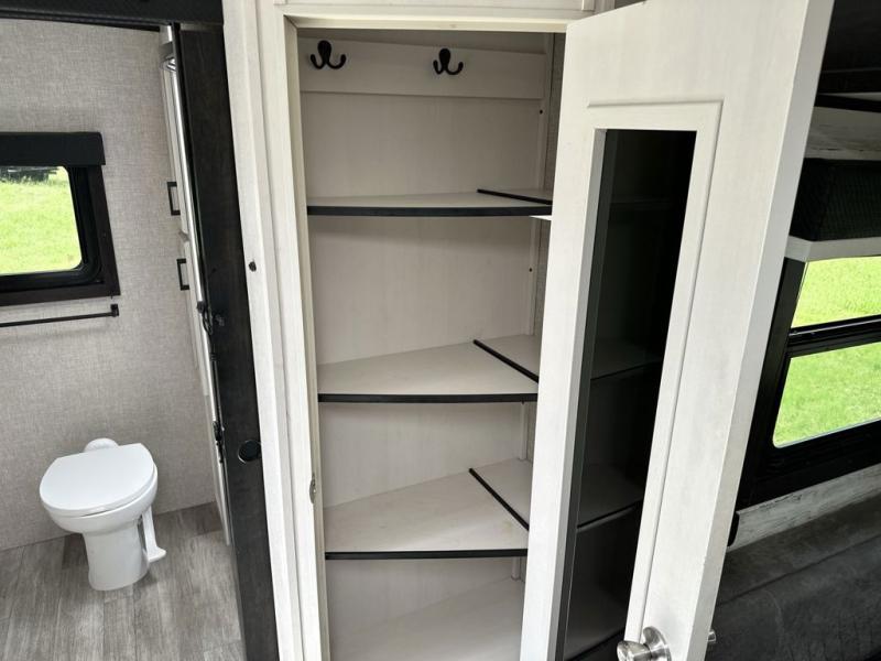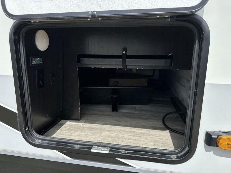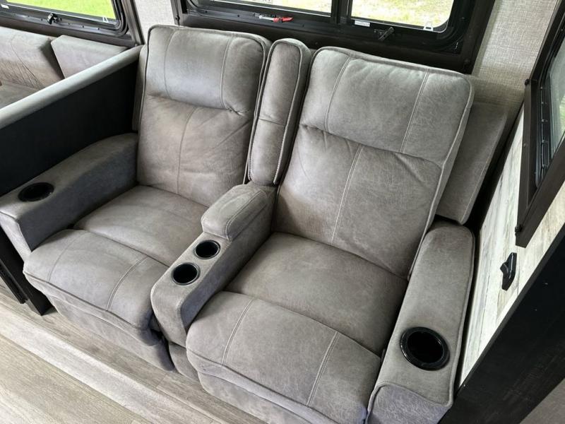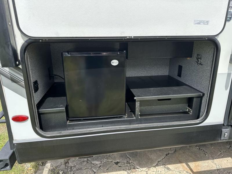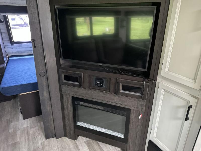 Your family will love camping every other weekend in this spacious travel trailer. The full rear bath is tucked away in the back for privacy, and there are dual entry doors for convenience. When you're not outside cooking on the outdoor kitchen, gather around the U-shaped dinette for game night. You'll find the LED TV and fireplace will make this area feel more like home, and there are two pantries to store snacks and dry goods. When it comes time to call it a night, head to the front private bedroom for a great night's rest on the queen bed, and you'll find two wardrobes plus a closet to keep your clothes tidy.