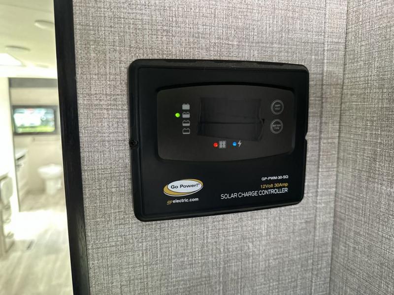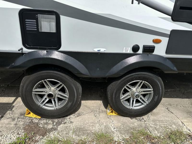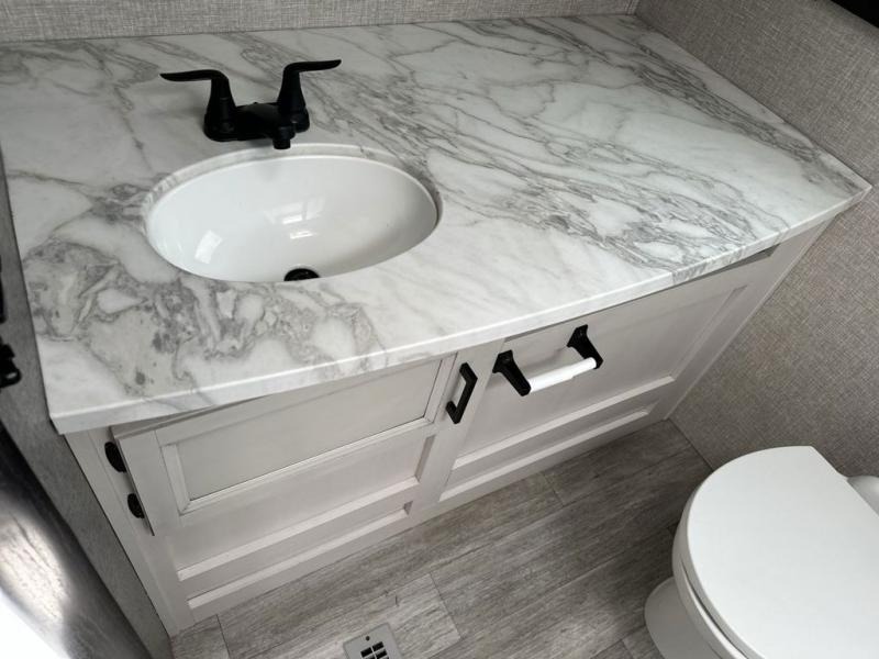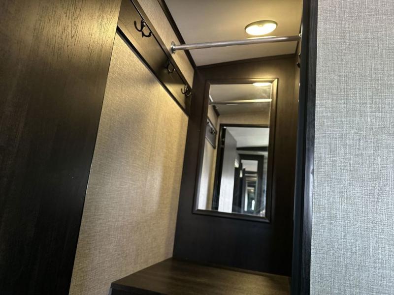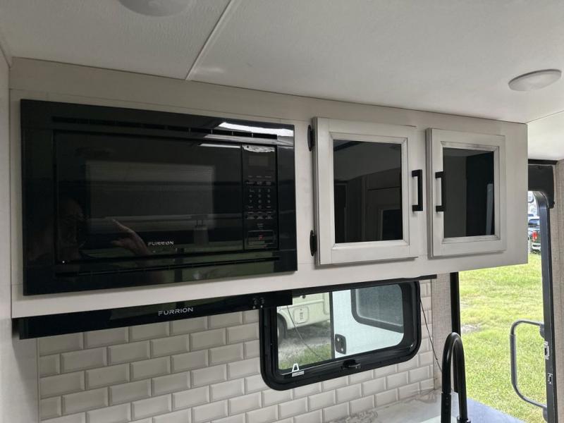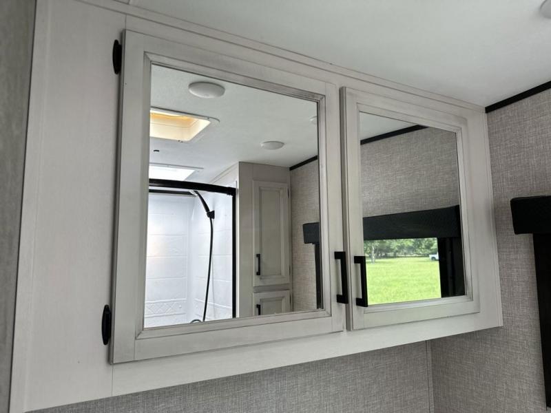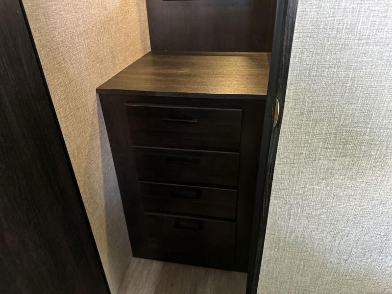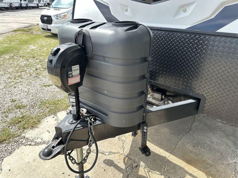Your family will love camping every other weekend in this spacious travel trailer. The full rear bath is tucked away in the back for privacy, and there are dual entry doors for convenience. When you're not outside cooking on the outdoor kitchen, gather around the U-shaped dinette for game night. You'll find the LED TV and fireplace will make this area feel more like home, and there are two pantries to store snacks and dry goods. When it comes time to call it a night, head to the front private bedroom for a great night's rest on the queen bed, and you'll find two wardrobes plus a closet to keep your clothes tidy.