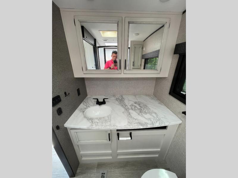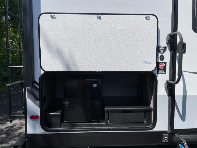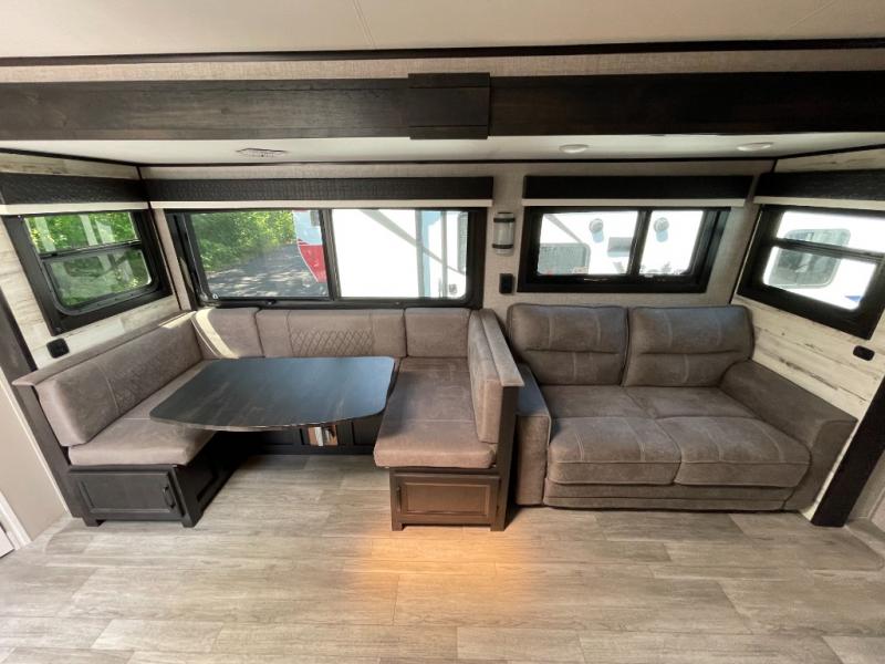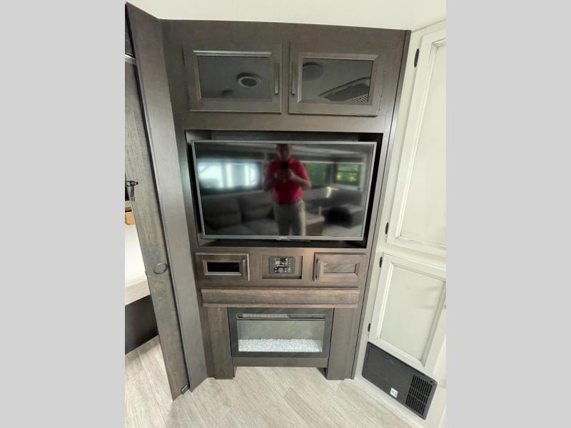 Your family will love camping every other weekend in this spacious travel trailer. The full rear bath is tucked away in the back for privacy, and there are dual entry doors for convenience. When you're not outside cooking on the outdoor kitchen, gather around the U-shaped dinette for game night. You'll find the LED TV and fireplace will make this area feel more like home, and there are two pantries to store snacks and dry goods. When it comes time to call it a night, head to the front private bedroom for a great night's rest on the queen bed, and you'll find two wardrobes plus a closet to keep your clothes tidy.