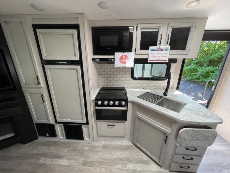 The lightweight White Hawk travel trailers by Jayco will blow you away with their roomy interiors, luxurious amenities, and durable construction. The Magnum Truss Roof System can withstand 50% more weight than the competition, and the Stronghold VBL lamination is the lightest, yet strongest in the industry. Each model includes the JAYCOMMAND "Smart RV" system with a tire pressure monitor system, plus American-made Goodyear tires for maximum durability and carrying capacity. You will love the sleek look of the front molded fiberglass cap with an automotive windshield and blue LED accent lighting, along with the frameless windows and automotive-style aluminum rims. The White Hawk travel trailers also include an arched interior ceiling, a kitchen skylight with a shade, residential vinyl flooring with cold crack resistance, and an electric fireplace.