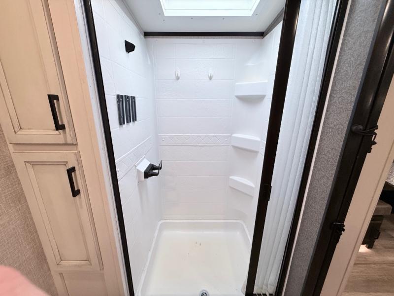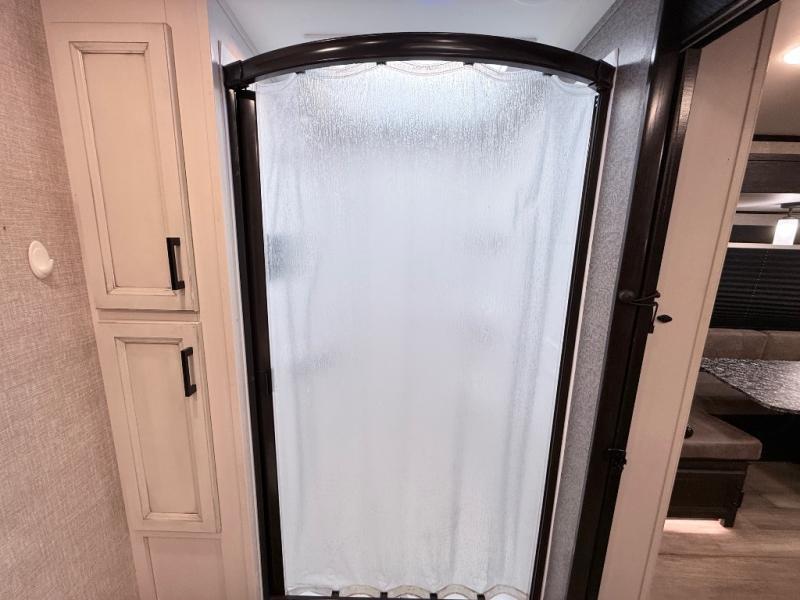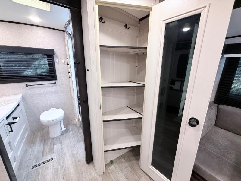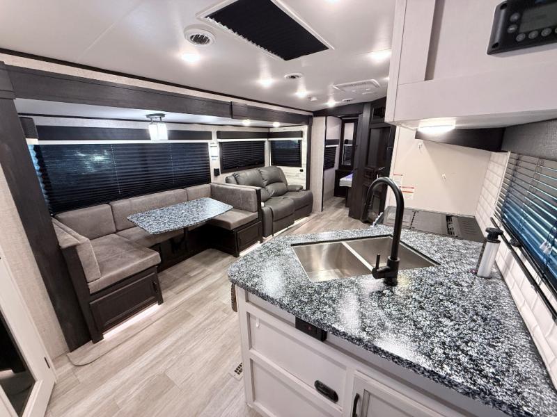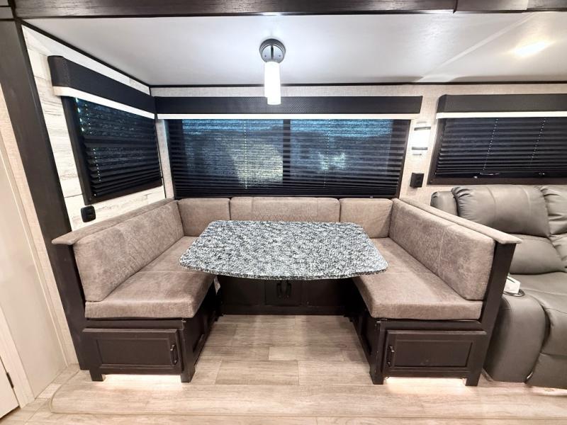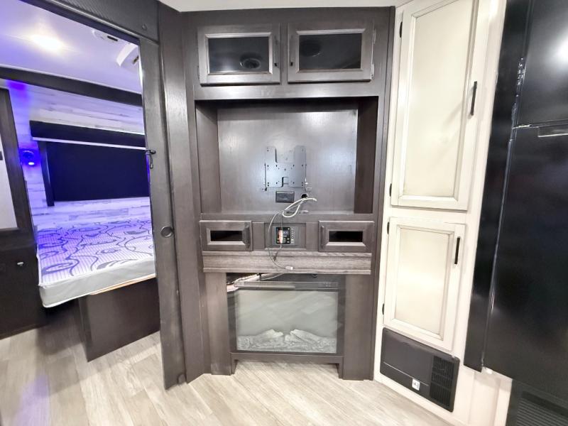 Your family will love camping every other weekend in this spacious travel trailer. The full rear bath is tucked away in the back for privacy, and there are dual entry doors for convenience. When you're not outside cooking on the outdoor kitchen, gather around the U-shaped dinette for game night. You'll find the LED TV and fireplace will make this area feel more like home, and there are two pantries to store snacks and dry goods. When it comes time to call it a night, head to the front private bedroom for a great night's rest on the queen bed, and you'll find two wardrobes plus a closet to keep your clothes tidy.