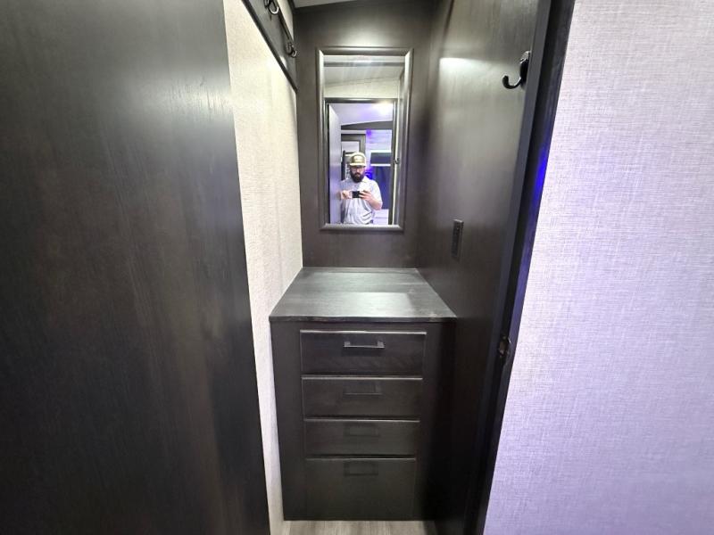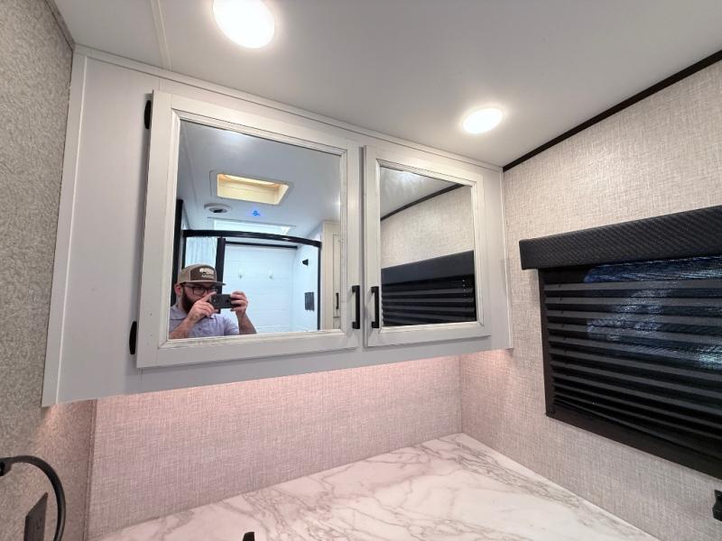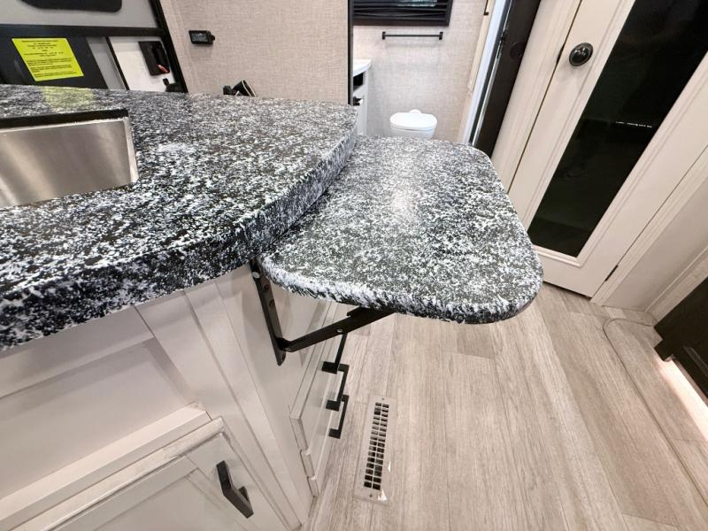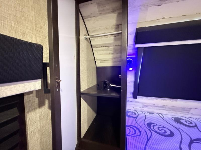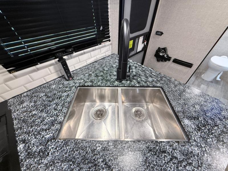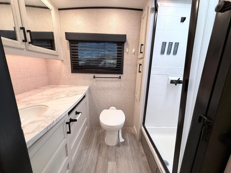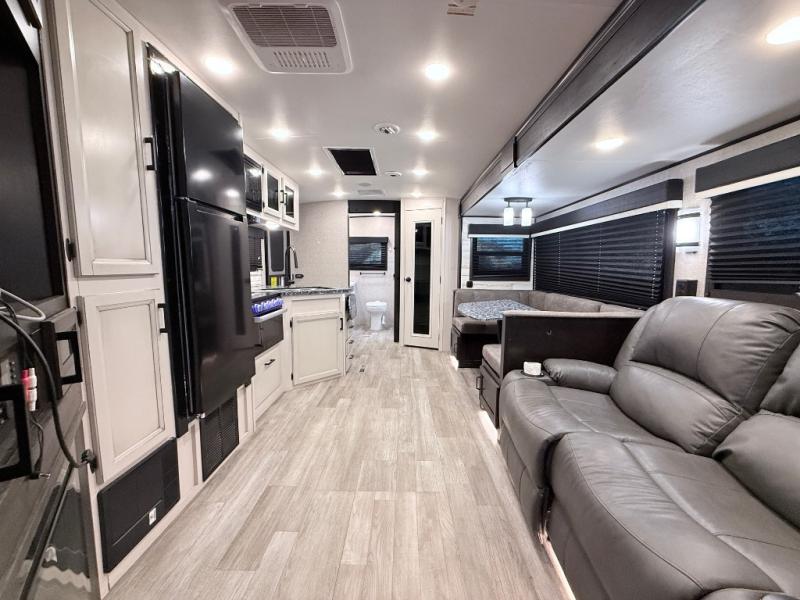 Your family will love camping every other weekend in this spacious travel trailer. The full rear bath is tucked away in the back for privacy, and there are dual entry doors for convenience. When you're not outside cooking on the outdoor kitchen, gather around the U-shaped dinette for game night. You'll find the LED TV and fireplace will make this area feel more like home, and there are two pantries to store snacks and dry goods. When it comes time to call it a night, head to the front private bedroom for a great night's rest on the queen bed, and you'll find two wardrobes plus a closet to keep your clothes tidy.