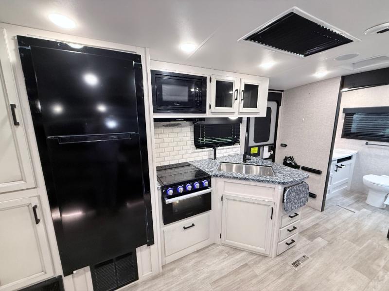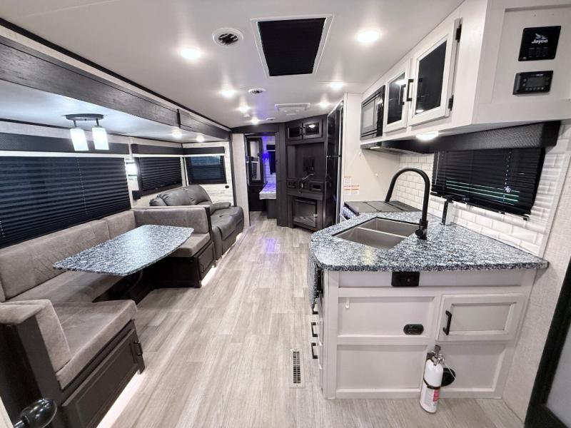 The lightweight White Hawk travel trailers by Jayco will blow you away with their roomy interiors, luxurious amenities, and durable construction. The Magnum Truss Roof System can withstand 50% more weight than the competition, and the Stronghold VBL lamination is the lightest, yet strongest in the industry. Each model includes the JAYCOMMAND "Smart RV" system with a tire pressure monitor system, plus American-made Goodyear tires for maximum durability and carrying capacity. You will love the sleek look of the front molded fiberglass cap with an automotive windshield and blue LED accent lighting, along with the frameless windows and automotive-style aluminum rims. The White Hawk travel trailers also include an arched interior ceiling, a kitchen skylight with a shade, residential vinyl flooring with cold crack resistance, and an electric fireplace.