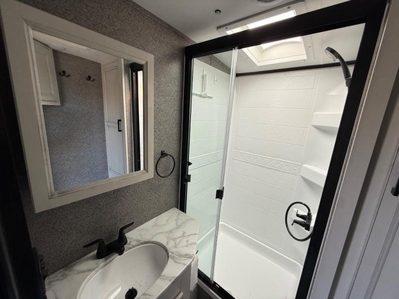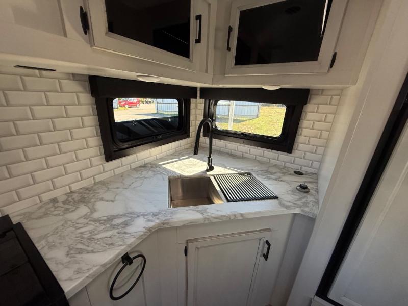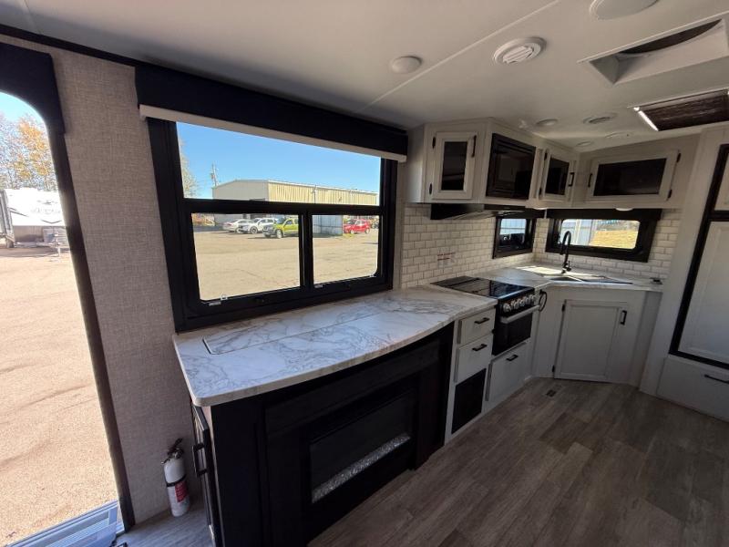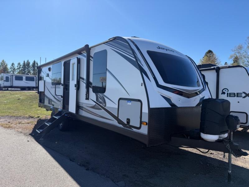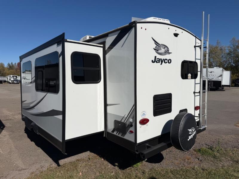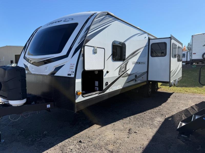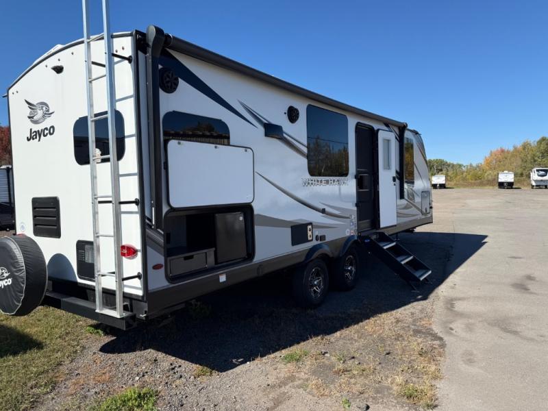 The lightweight White Hawk travel trailers by Jayco will blow you away with their roomy interiors, luxurious amenities, and durable construction. The Magnum Truss Roof System can withstand 50% more weight than the competition, and the Stronghold VBL lamination is the lightest, yet strongest in the industry. Each model includes the JAYCOMMAND "Smart RV" system with a tire pressure monitor system, plus American-made Goodyear tires for maximum durability and carrying capacity. You will love the sleek look of the front molded fiberglass cap with an automotive windshield and blue LED accent lighting, along with the frameless windows and automotive-style aluminum rims. The White Hawk travel trailers also include an arched interior ceiling, a kitchen skylight with a shade, residential vinyl flooring with cold crack resistance, and an electric fireplace.