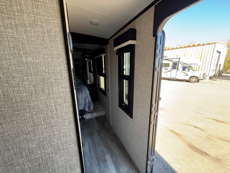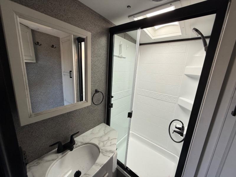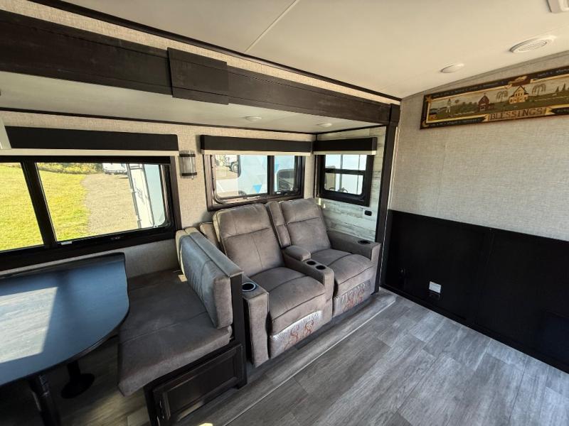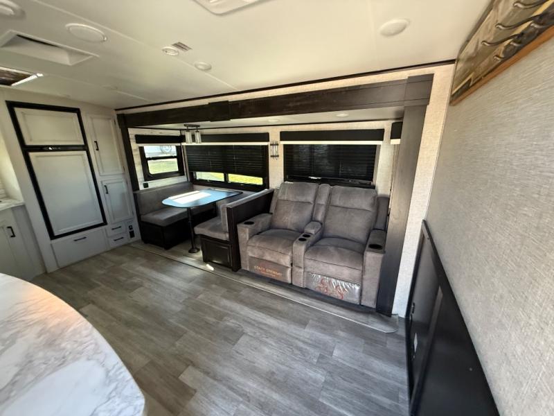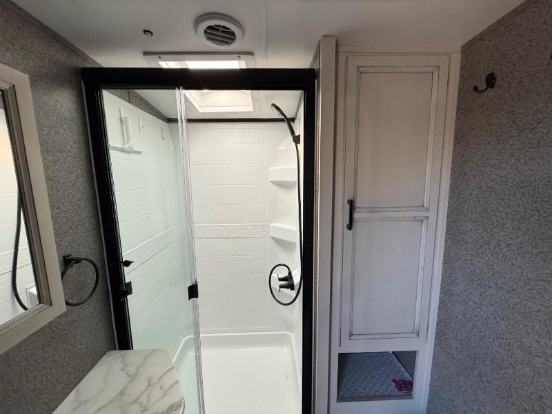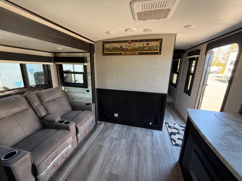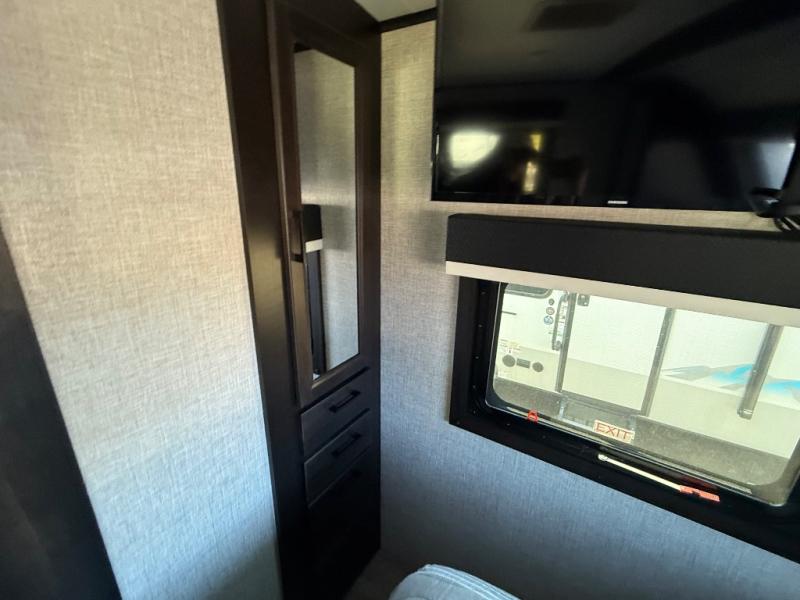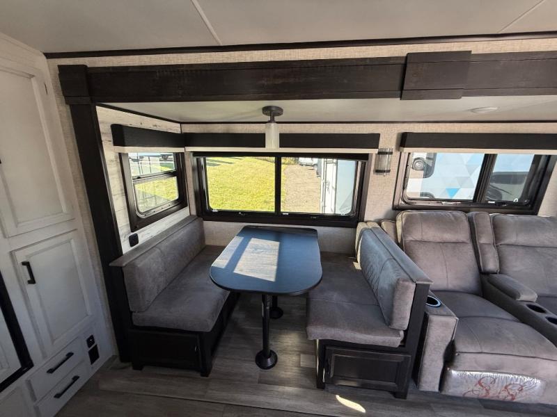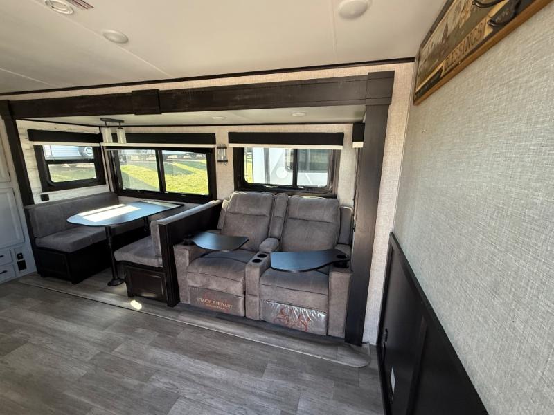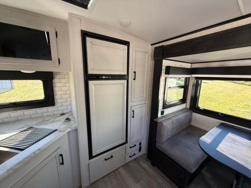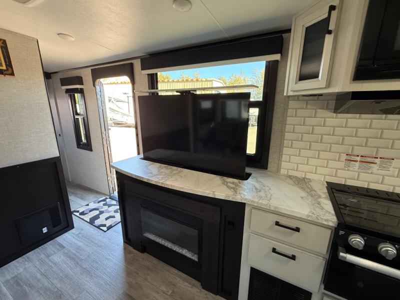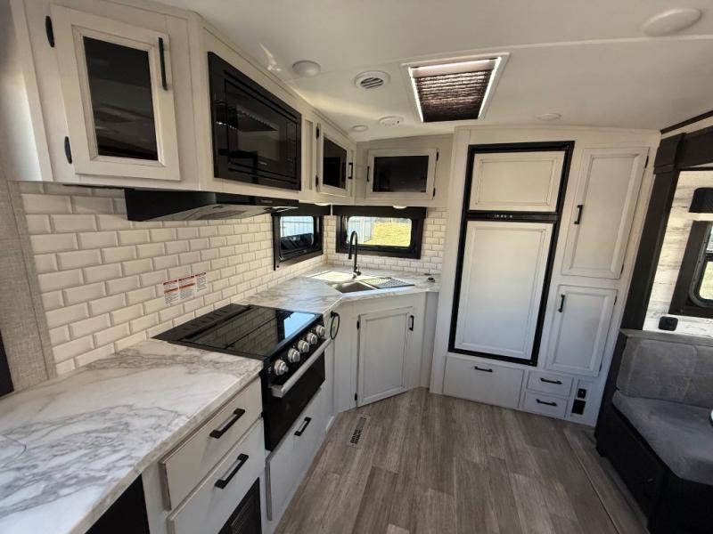 Step inside this rear kitchen travel trailer for fun family vacations. The large slide will provide the chef space to cook, while the kids watch a movie on the TV on lift. If the weather is just right, you will probably want to cook on the outside kitchen while the kids ride their bikes around the campsite. This model includes a tri-fold sofa and a booth dinette that will be perfect for meal times, relaxing, and sleeping space at night. You and your spouse can take the front private bedroom with a queen bed and dual wardrobes for your things, and the full bath is centrally located for easy access!