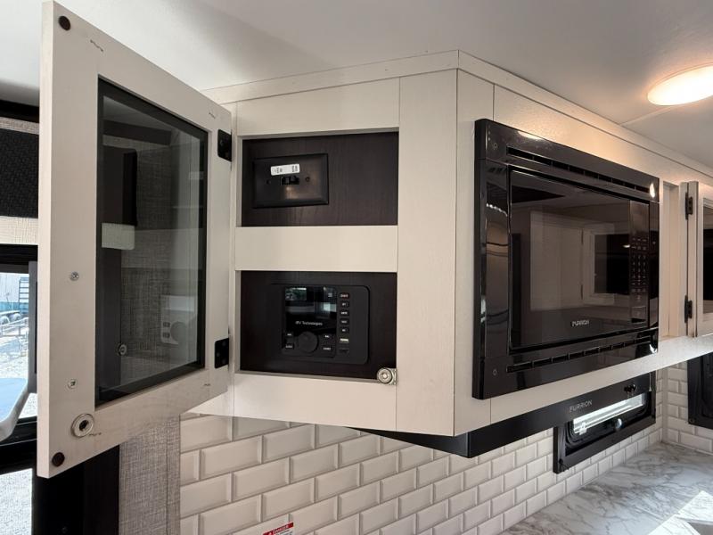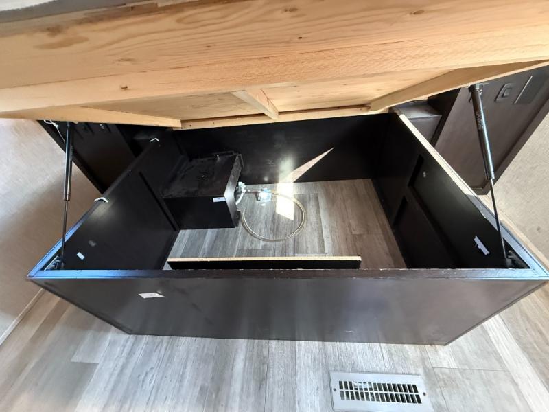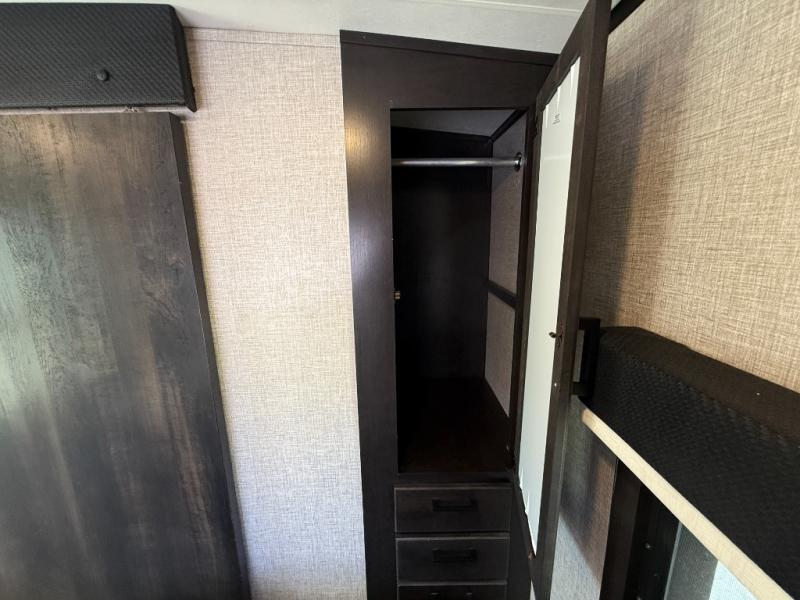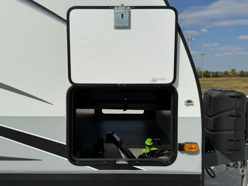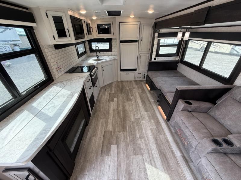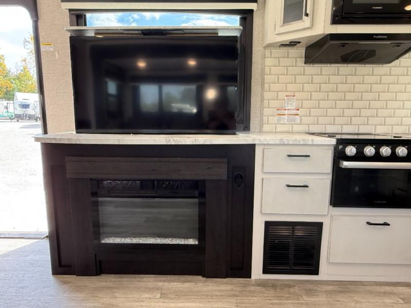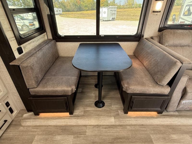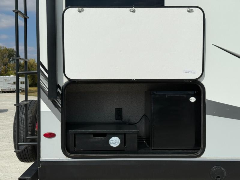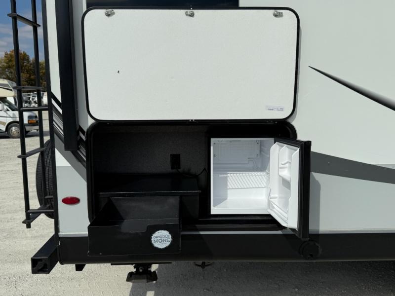 Step inside this rear kitchen travel trailer for fun family vacations. The large slide will provide the chef space to cook, while the kids watch a movie on the TV on lift. If the weather is just right, you will probably want to cook on the outside kitchen while the kids ride their bikes around the campsite. This model includes a tri-fold sofa and a booth dinette that will be perfect for meal times, relaxing, and sleeping space at night. You and your spouse can take the front private bedroom with a queen bed and dual wardrobes for your things, and the full bath is centrally located for easy access!