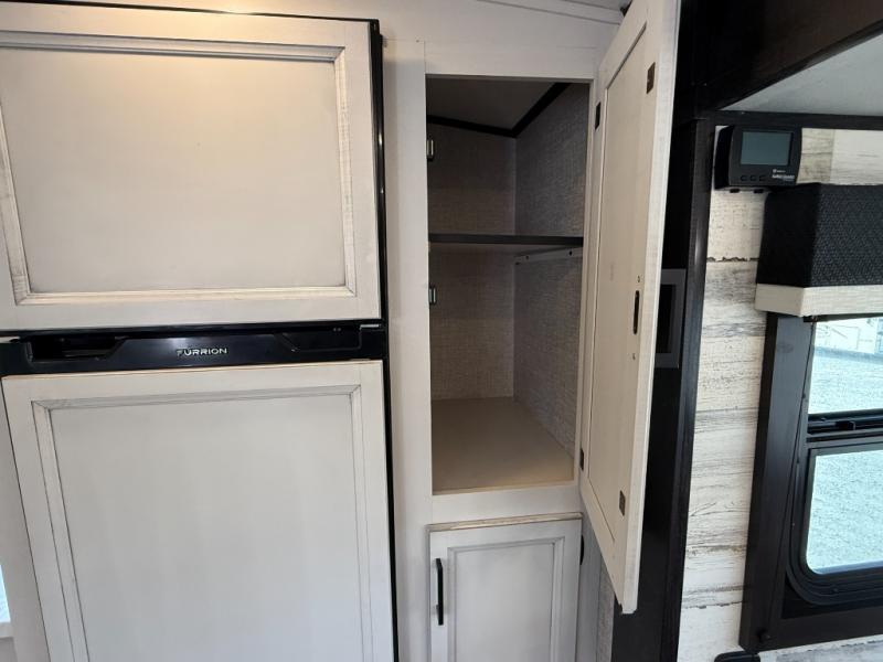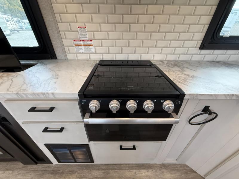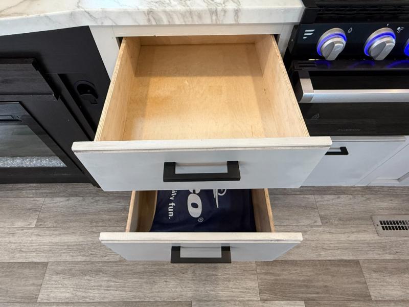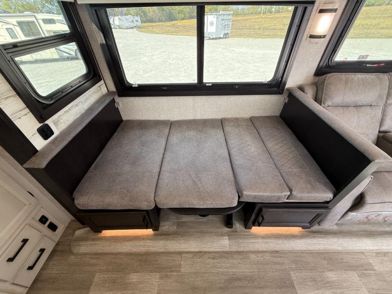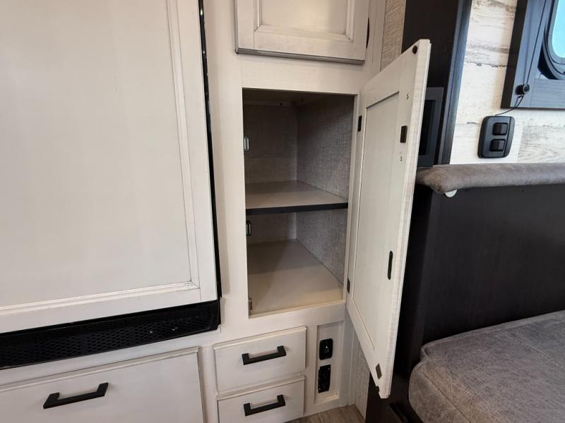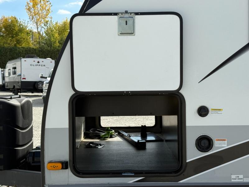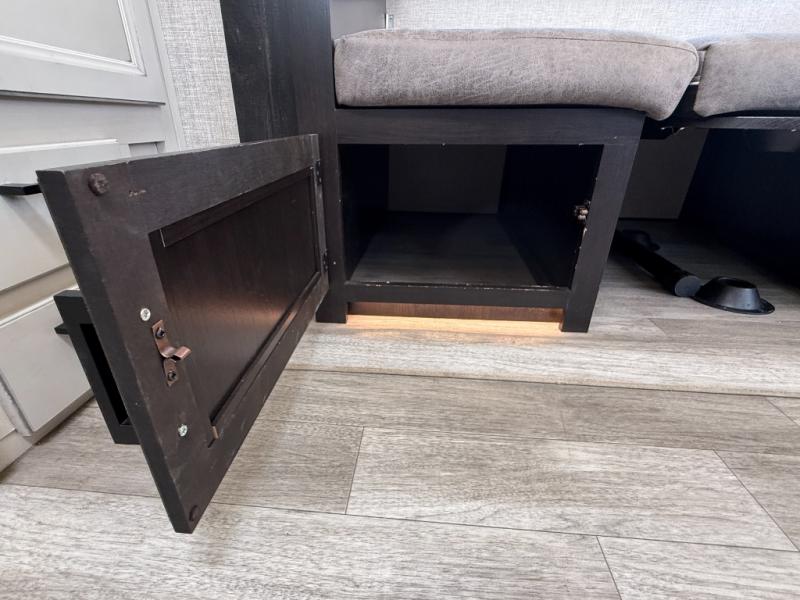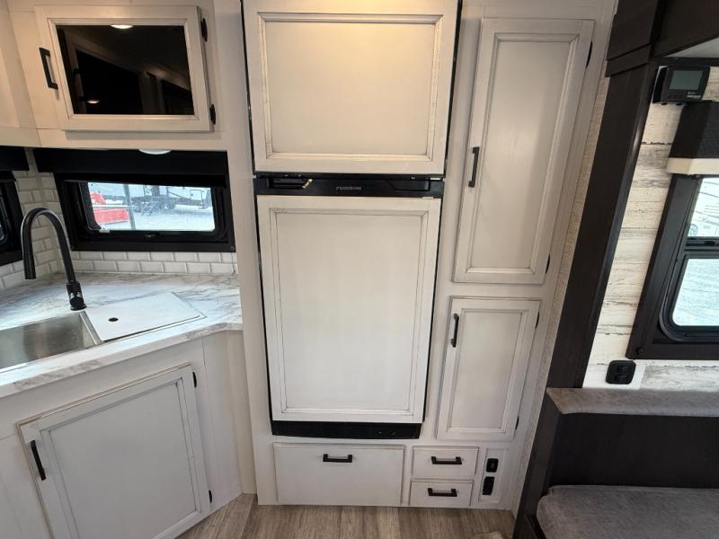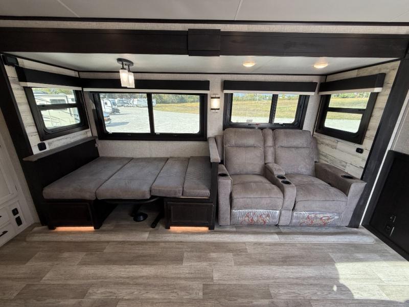 Step inside this rear kitchen travel trailer for fun family vacations. The large slide will provide the chef space to cook, while the kids watch a movie on the TV on lift. If the weather is just right, you will probably want to cook on the outside kitchen while the kids ride their bikes around the campsite. This model includes a tri-fold sofa and a booth dinette that will be perfect for meal times, relaxing, and sleeping space at night. You and your spouse can take the front private bedroom with a queen bed and dual wardrobes for your things, and the full bath is centrally located for easy access!