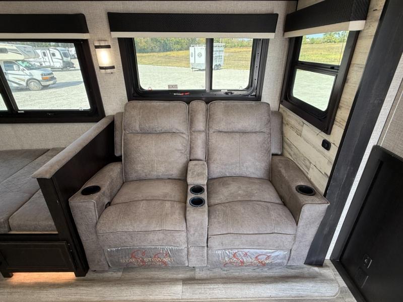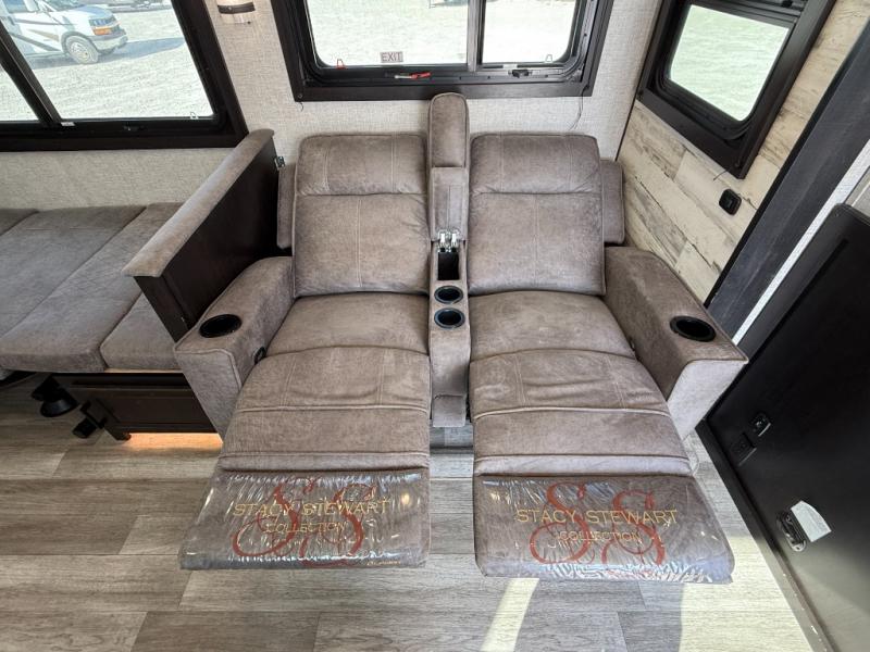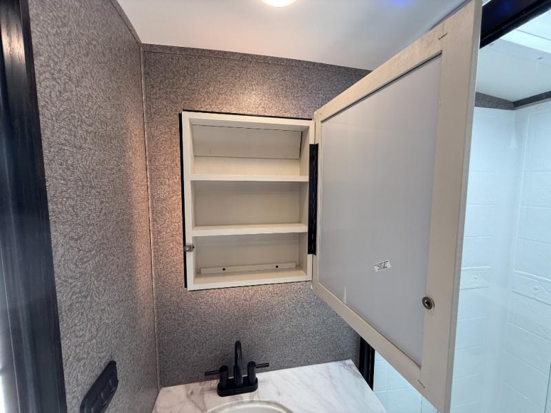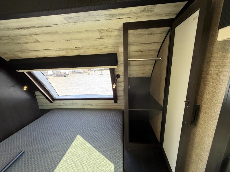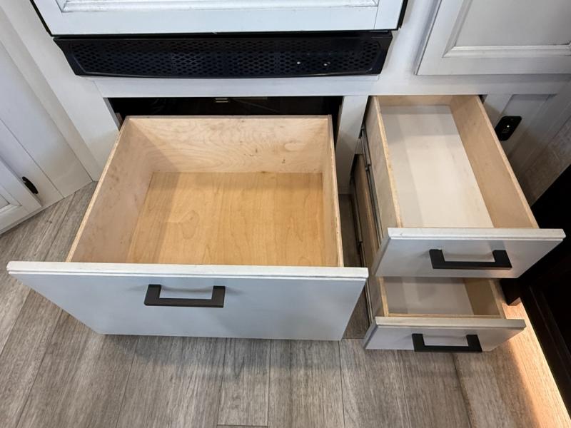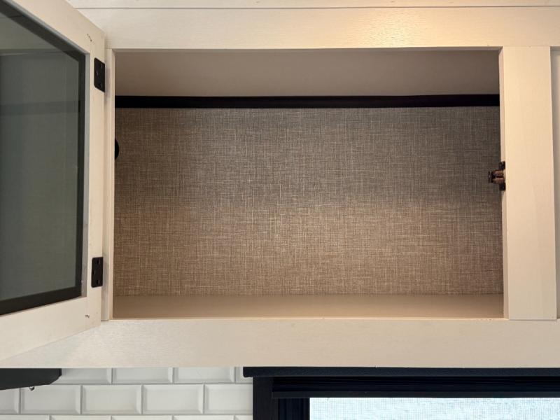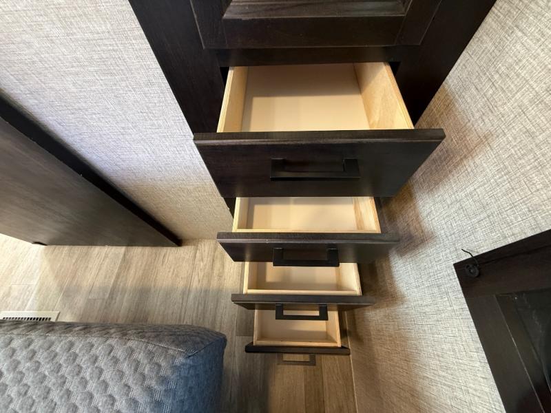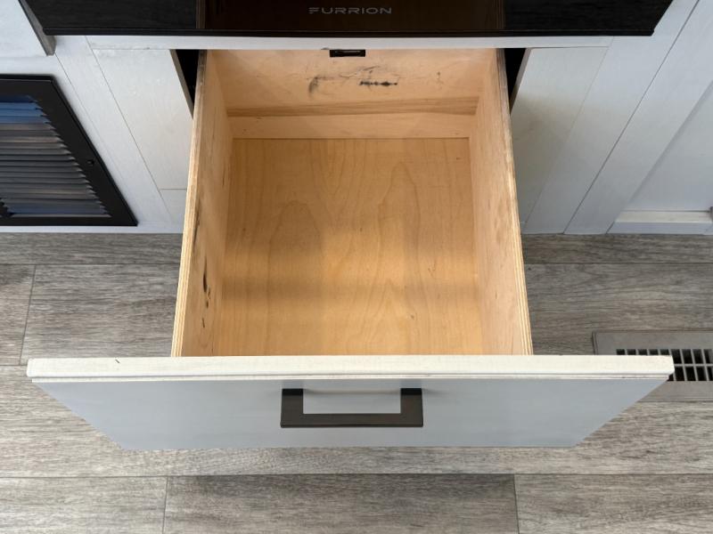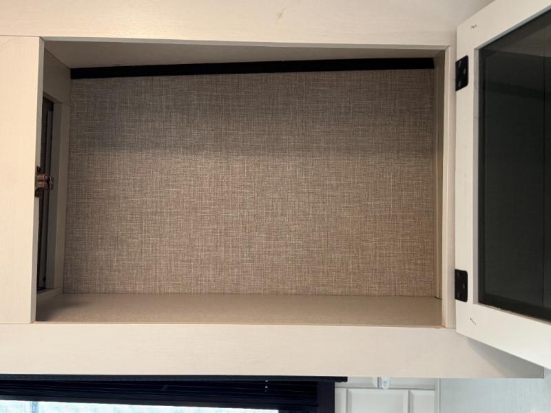 Step inside this rear kitchen travel trailer for fun family vacations. The large slide will provide the chef space to cook, while the kids watch a movie on the TV on lift. If the weather is just right, you will probably want to cook on the outside kitchen while the kids ride their bikes around the campsite. This model includes a tri-fold sofa and a booth dinette that will be perfect for meal times, relaxing, and sleeping space at night. You and your spouse can take the front private bedroom with a queen bed and dual wardrobes for your things, and the full bath is centrally located for easy access!