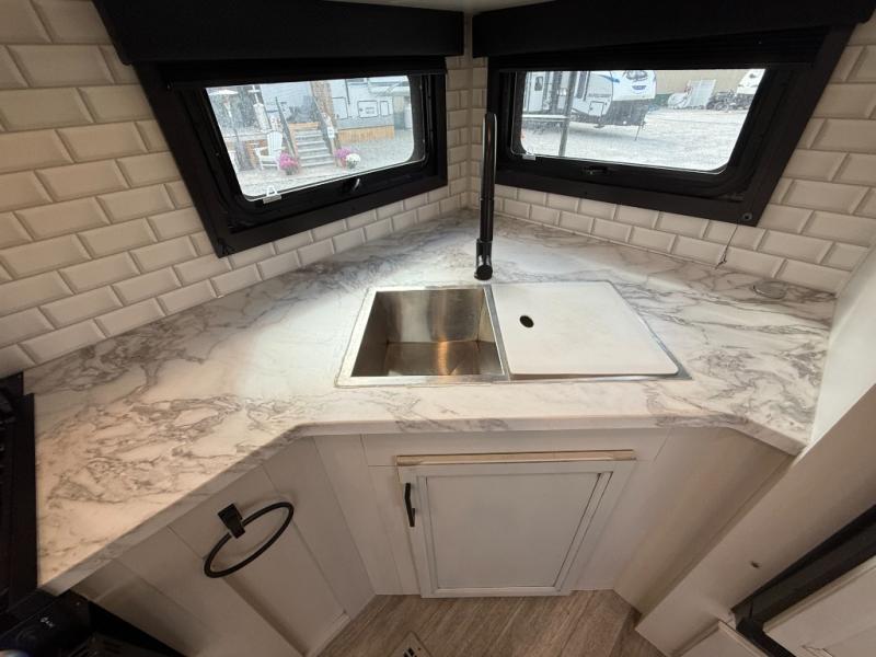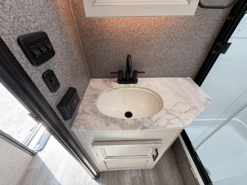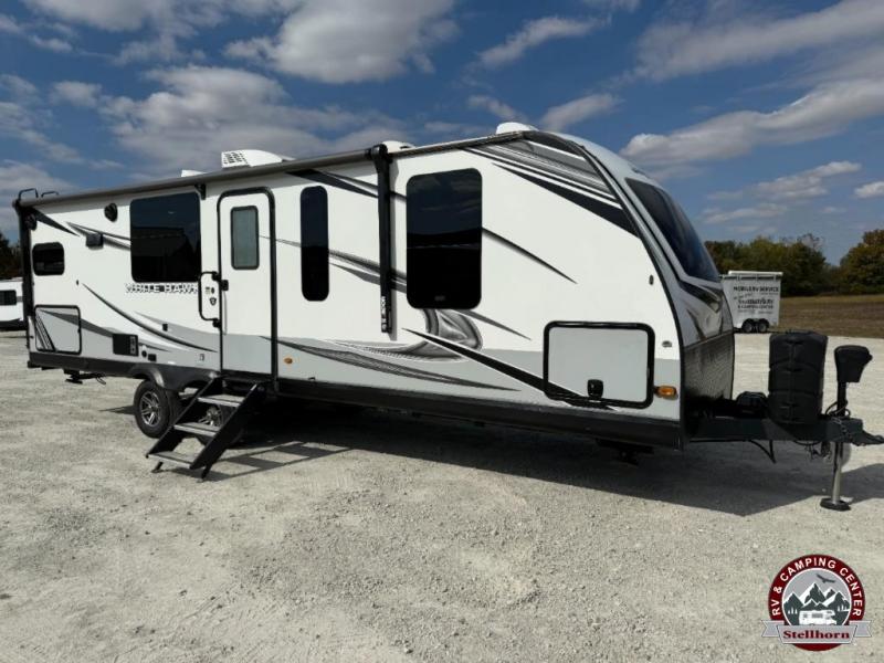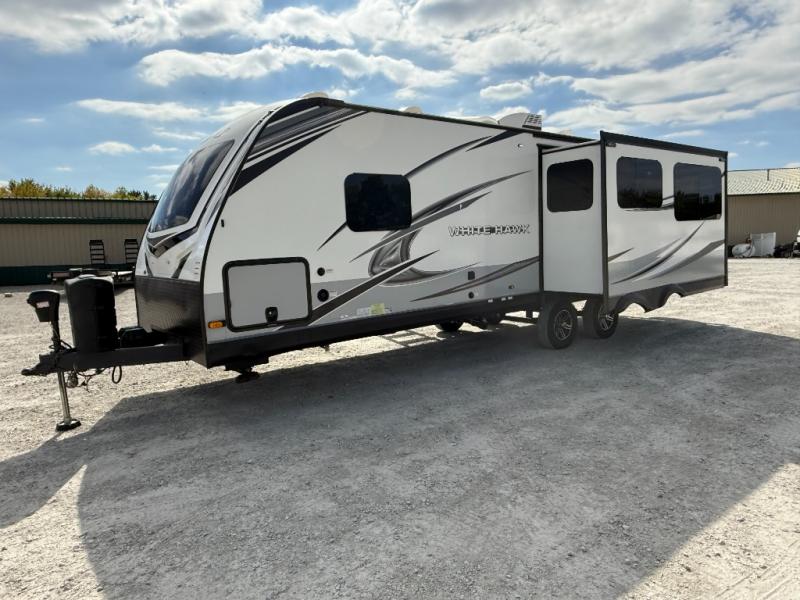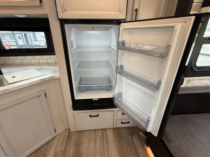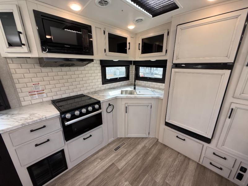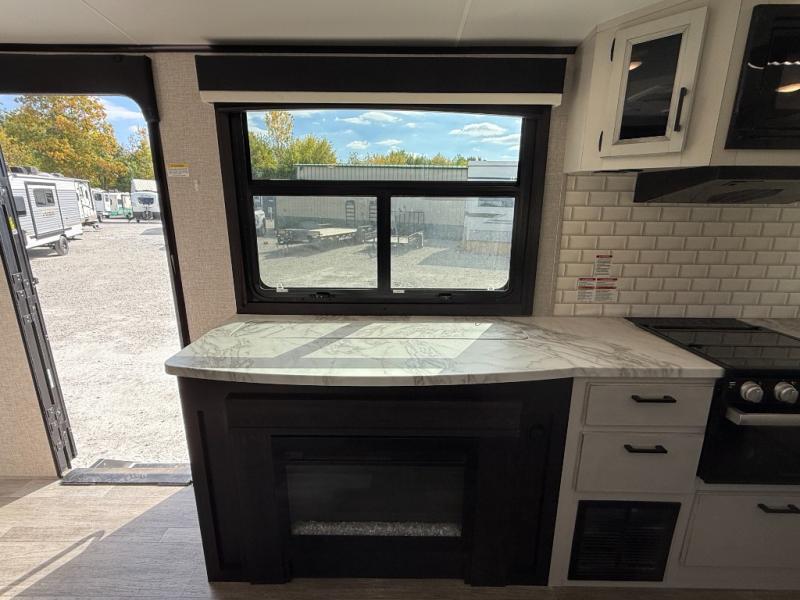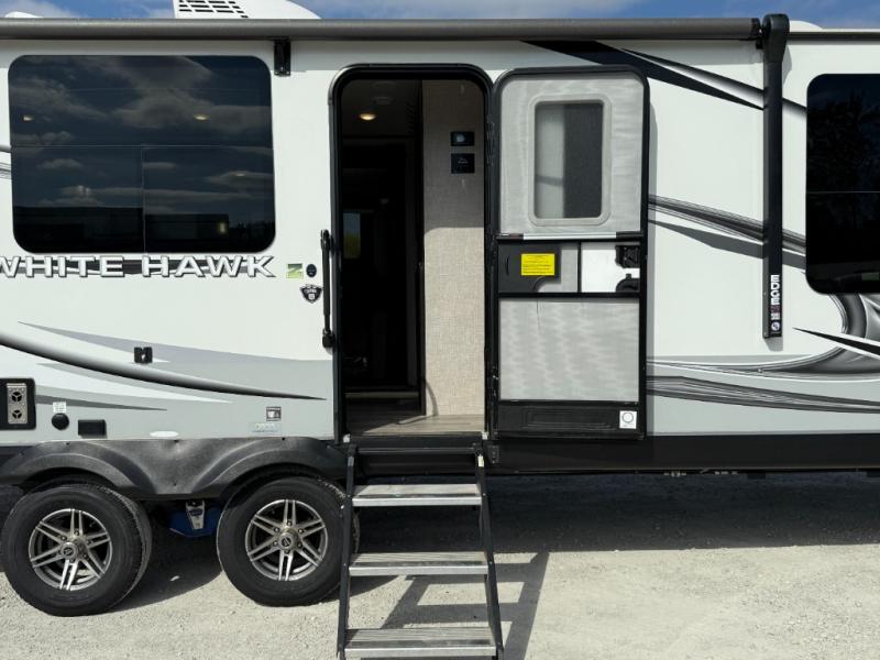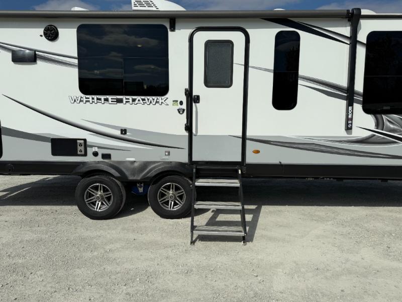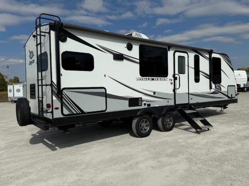 The lightweight White Hawk travel trailers by Jayco will blow you away with their roomy interiors, luxurious amenities, and durable construction. The Magnum Truss Roof System can withstand 50% more weight than the competition, and the Stronghold VBL lamination is the lightest, yet strongest in the industry. Each model includes the JAYCOMMAND "Smart RV" system with a tire pressure monitor system, plus American-made Goodyear tires for maximum durability and carrying capacity. You will love the sleek look of the front molded fiberglass cap with an automotive windshield and blue LED accent lighting, along with the frameless windows and automotive-style aluminum rims. The White Hawk travel trailers also include an arched interior ceiling, a kitchen skylight with a shade, residential vinyl flooring with cold crack resistance, and an electric fireplace.