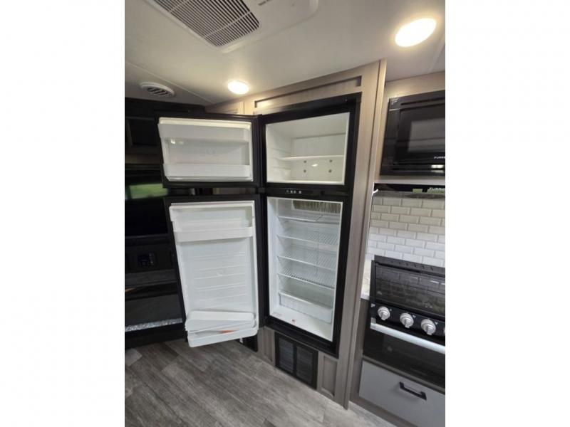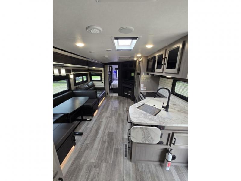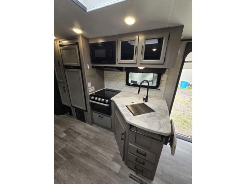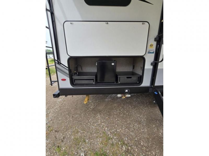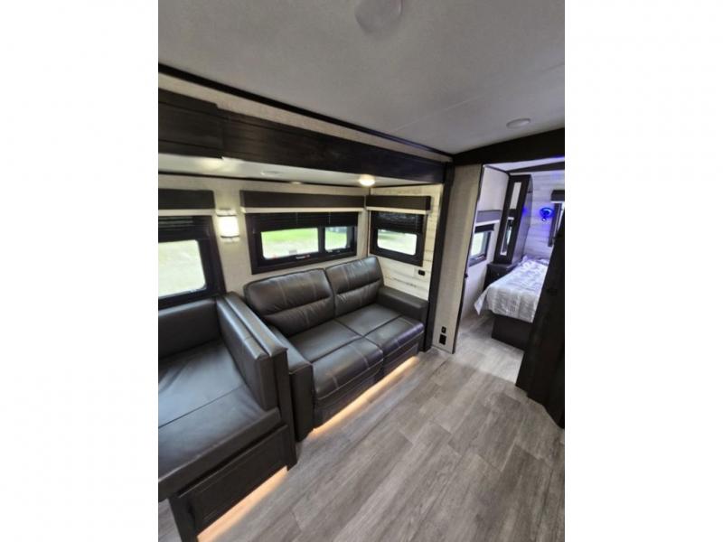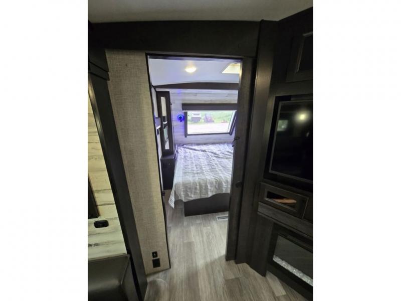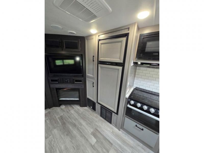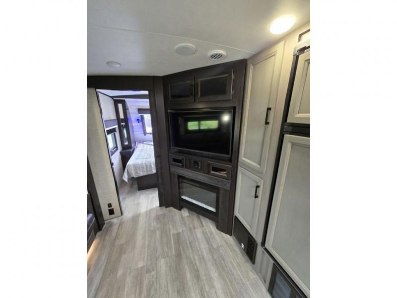Bring the whole family along in this spacious travel trailer. You will love visiting outside while the chef of your group prepares breakfast on the outdoor kitchen, plus there is a 21' power awning to shade you from the sun. If the weather isn't cooperating, head inside and dine around the U-shaped dinette. There is also a tri-fold sofa here, a fireplace, and an LED TV for movies. This model conveniently has dual entry doors so you can enter in through the main living area, or into the front private bedroom. The bedroom also features a queen bed, dual wardrobes, and a closet to keep your items organized. Start camping today!