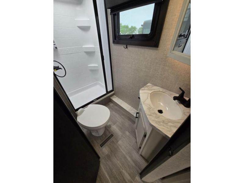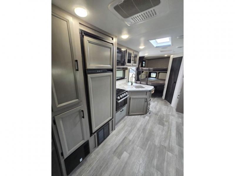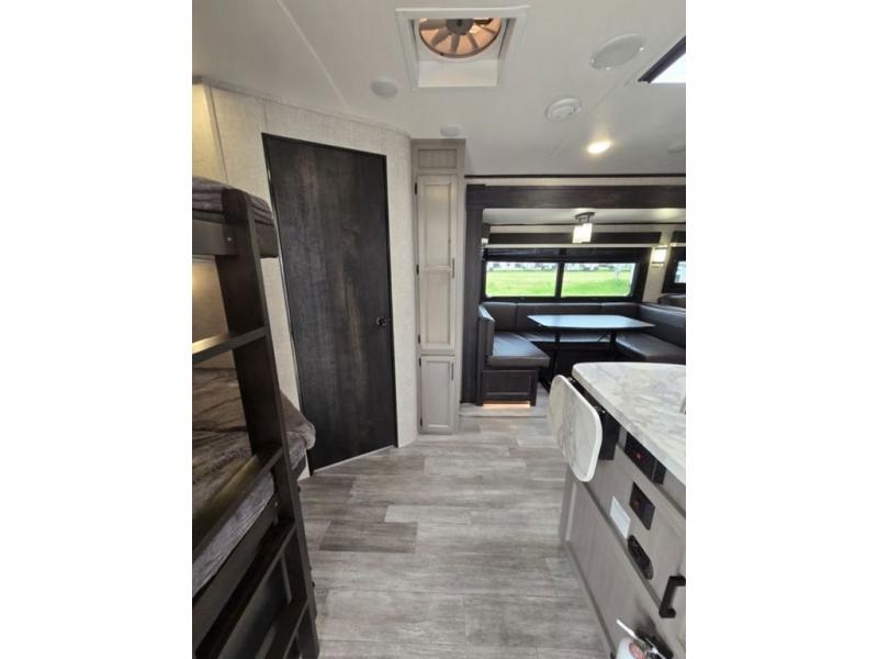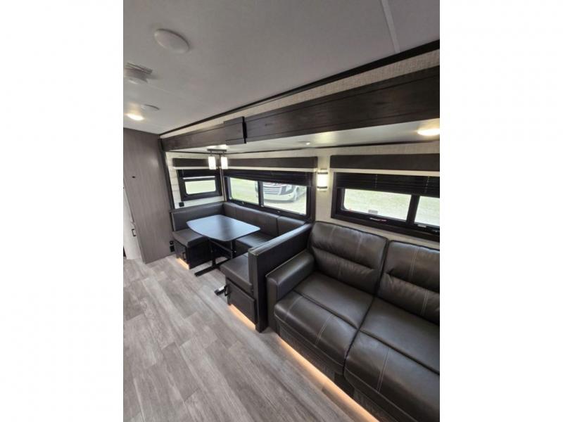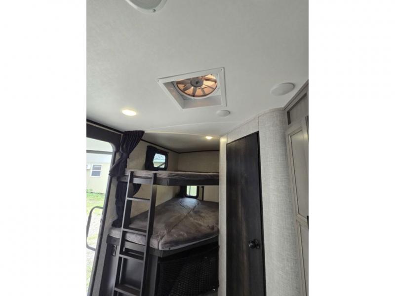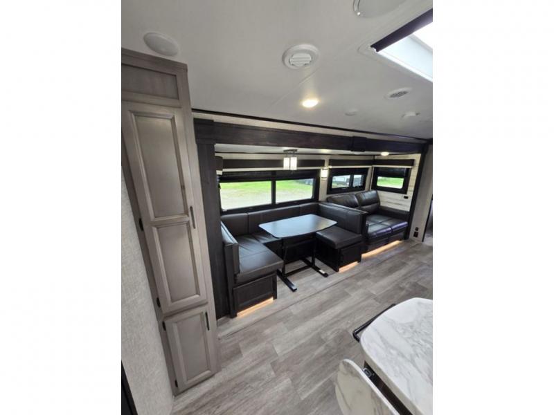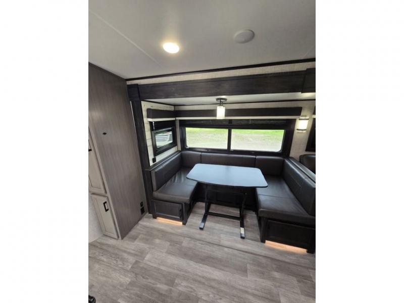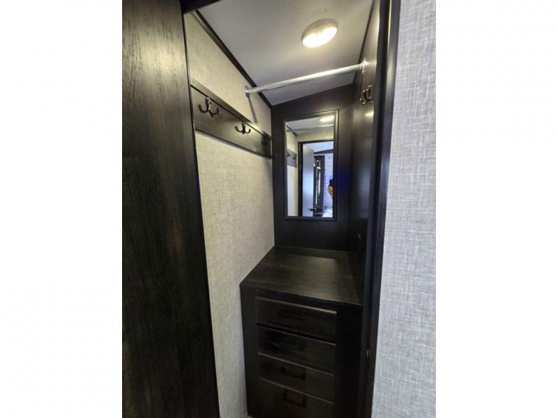 Bring the whole family along in this spacious travel trailer. You will love visiting outside while the chef of your group prepares breakfast on the outdoor kitchen, plus there is a 21' power awning to shade you from the sun. If the weather isn't cooperating, head inside and dine around the U-shaped dinette. There is also a tri-fold sofa here, a fireplace, and an LED TV for movies. This model conveniently has dual entry doors so you can enter in through the main living area, or into the front private bedroom. The bedroom also features a queen bed, dual wardrobes, and a closet to keep your items organized. Start camping today!