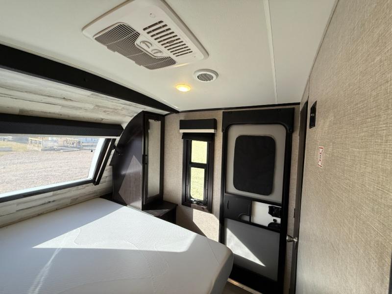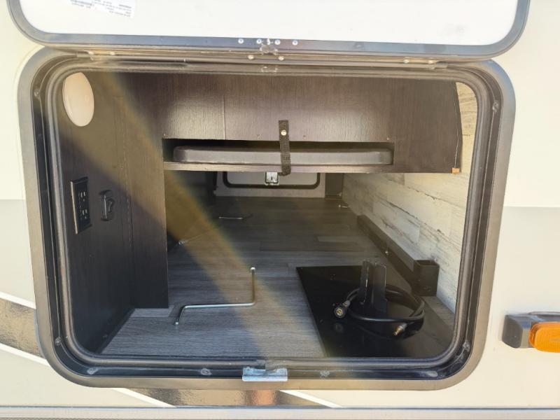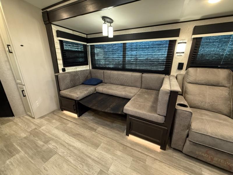 Bring the whole family along in this spacious travel trailer. You will love visiting outside while the chef of your group prepares breakfast on the outdoor kitchen, plus there is a 21' power awning to shade you from the sun. If the weather isn't cooperating, head inside and dine around the U-shaped dinette. There is also a tri-fold sofa here, a fireplace, and an LED TV for movies. This model conveniently has dual entry doors so you can enter in through the main living area, or into the front private bedroom. The bedroom also features a queen bed, dual wardrobes, and a closet to keep your items organized. Start camping today!