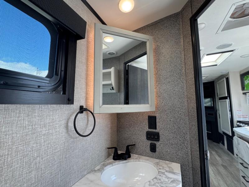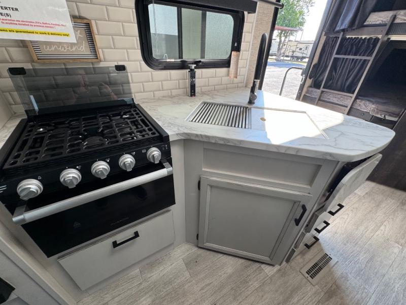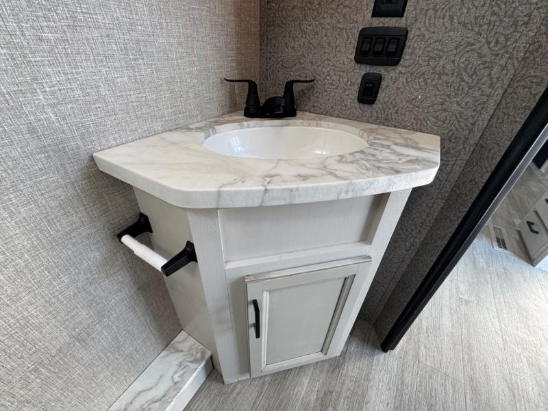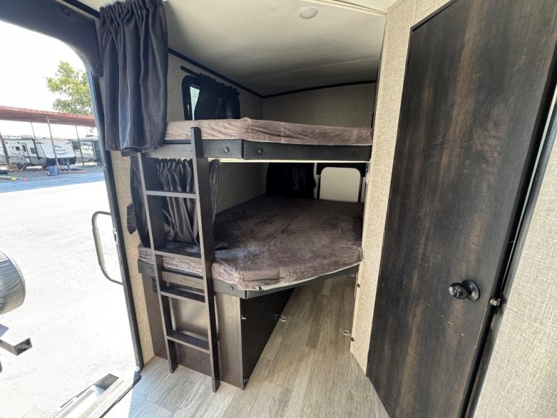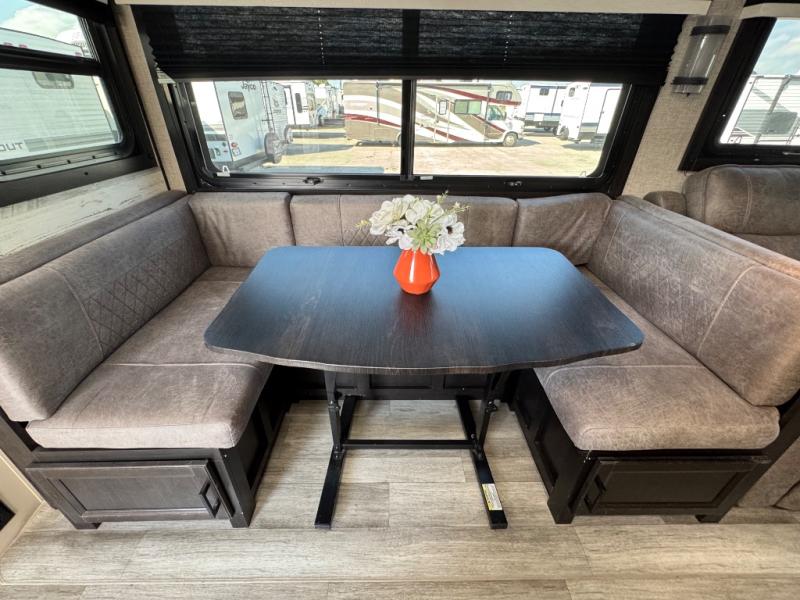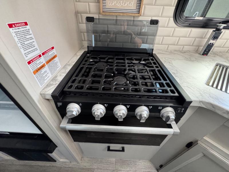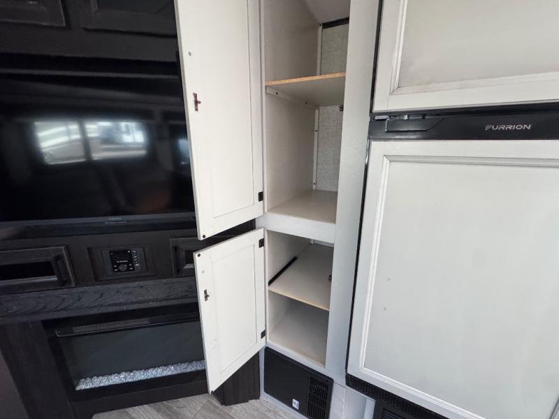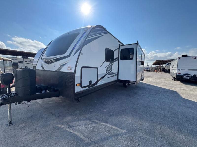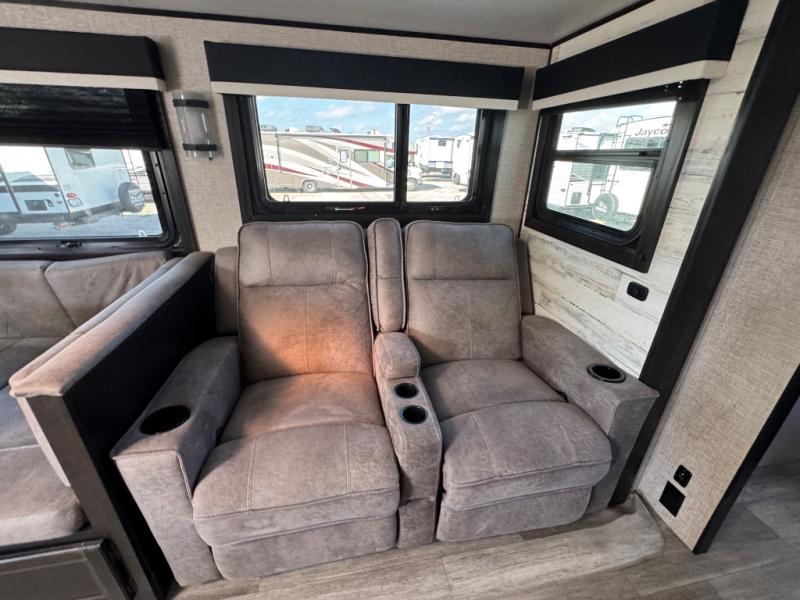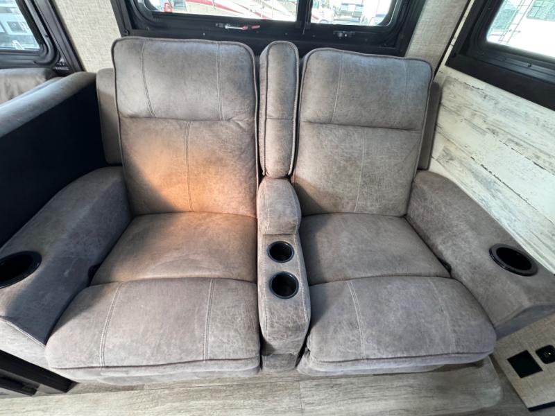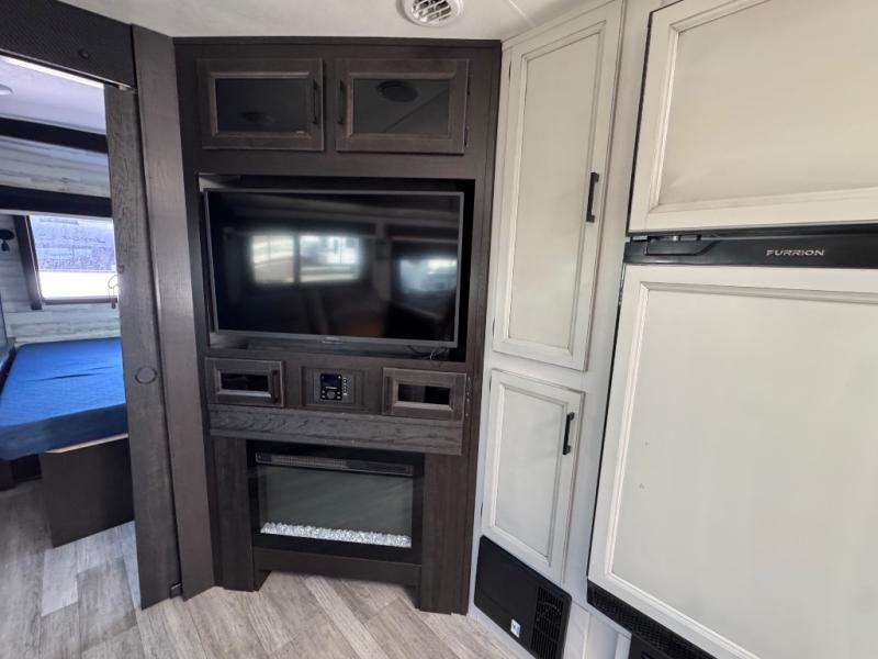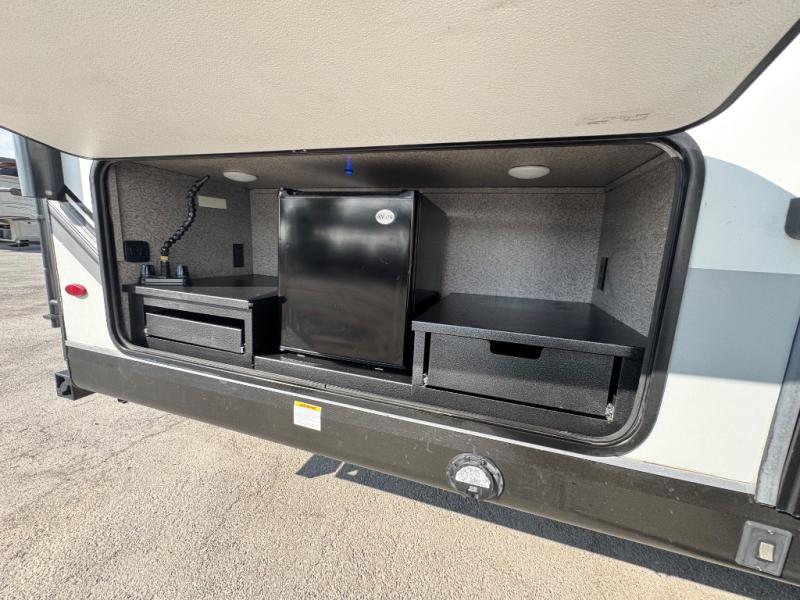 Bring the whole family along in this spacious travel trailer. You will love visiting outside while the chef of your group prepares breakfast on the outdoor kitchen, plus there is a 21' power awning to shade you from the sun. If the weather isn't cooperating, head inside and dine around the U-shaped dinette. There is also a tri-fold sofa here, a fireplace, and an LED TV for movies. This model conveniently has dual entry doors so you can enter in through the main living area, or into the front private bedroom. The bedroom also features a queen bed, dual wardrobes, and a closet to keep your items organized. Start camping today!