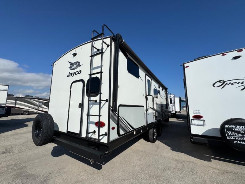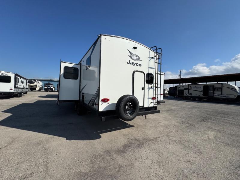The lightweight White Hawk travel trailers by Jayco will blow you away with their roomy interiors, luxurious amenities, and durable construction. The Magnum Truss Roof System can withstand 50% more weight than the competition, and the Stronghold VBL lamination is the lightest, yet strongest in the industry. Each model includes the JAYCOMMAND "Smart RV" system with a tire pressure monitor system, plus American-made Goodyear tires for maximum durability and carrying capacity. You will love the sleek look of the front molded fiberglass cap with an automotive windshield and blue LED accent lighting, along with the frameless windows and automotive-style aluminum rims. The White Hawk travel trailers also include an arched interior ceiling, a kitchen skylight with a shade, residential vinyl flooring with cold crack resistance, and an electric fireplace.