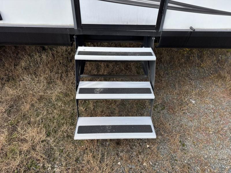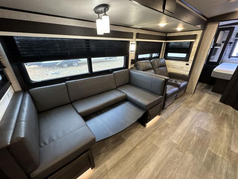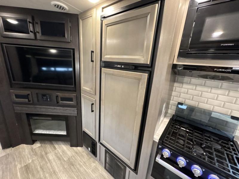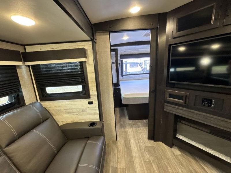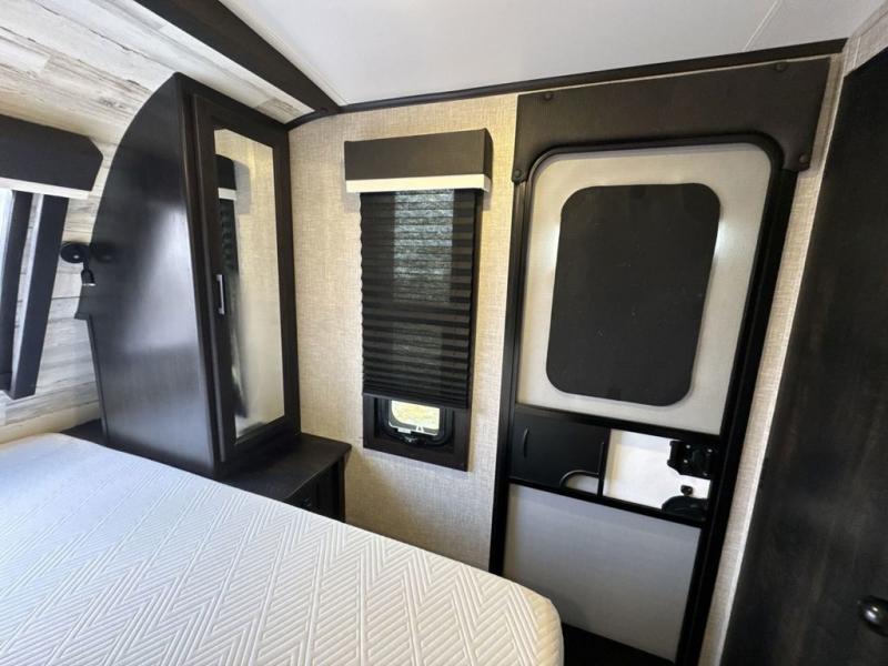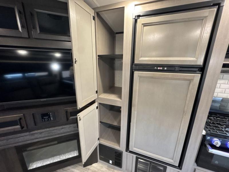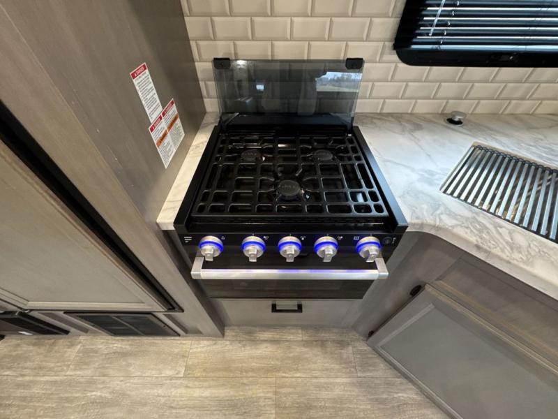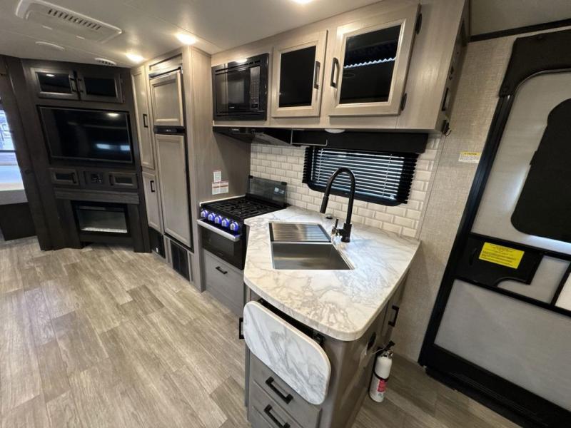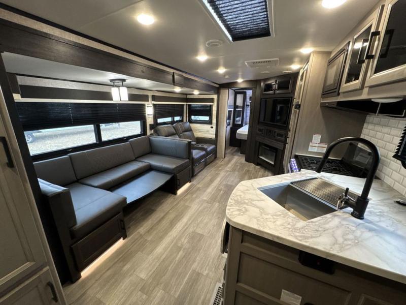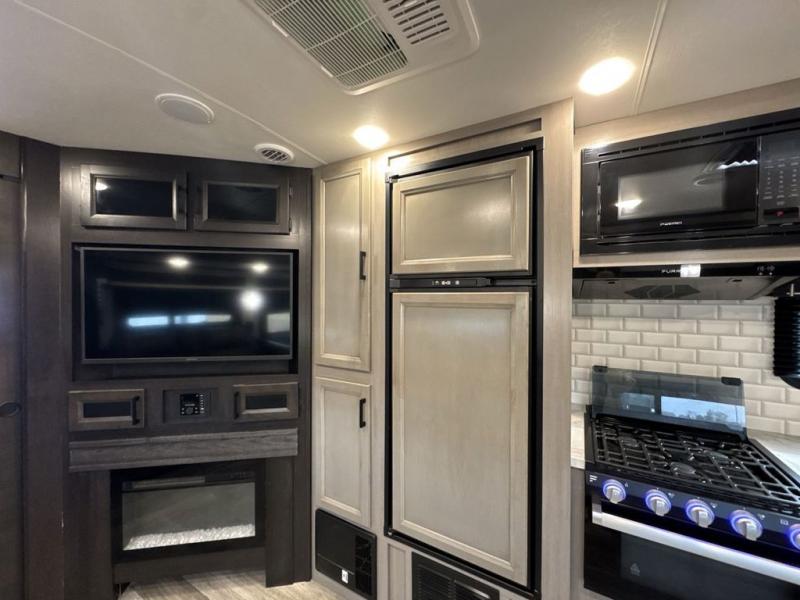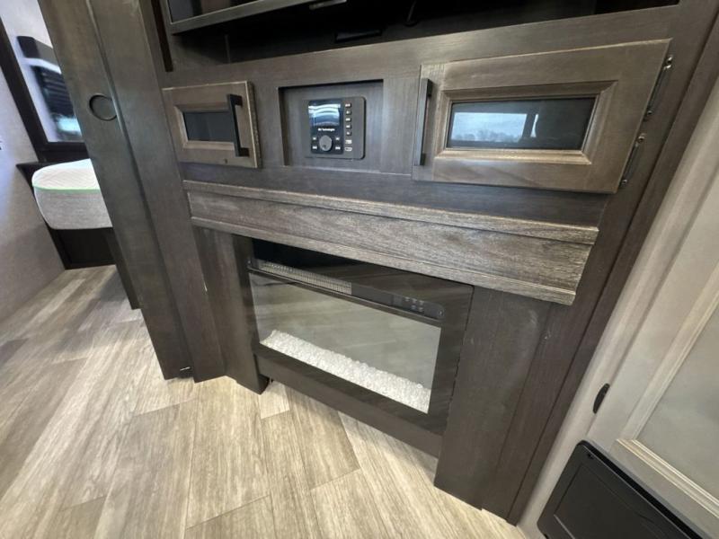 Bring the whole family along in this spacious travel trailer. You will love visiting outside while the chef of your group prepares breakfast on the outdoor kitchen, plus there is a 21' power awning to shade you from the sun. If the weather isn't cooperating, head inside and dine around the U-shaped dinette. There is also a tri-fold sofa here, a fireplace, and an LED TV for movies. This model conveniently has dual entry doors so you can enter in through the main living area, or into the front private bedroom. The bedroom also features a queen bed, dual wardrobes, and a closet to keep your items organized. Start camping today!