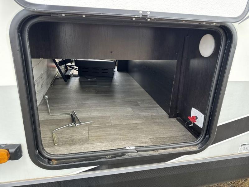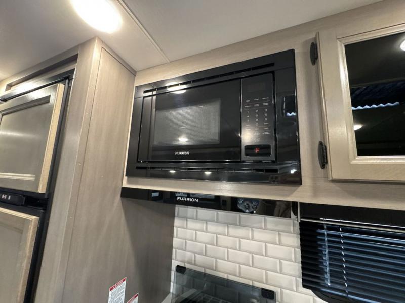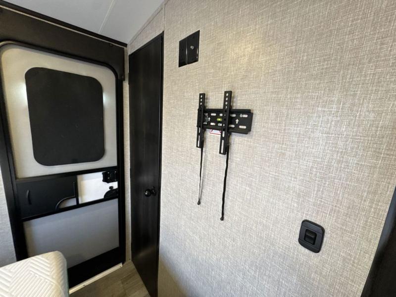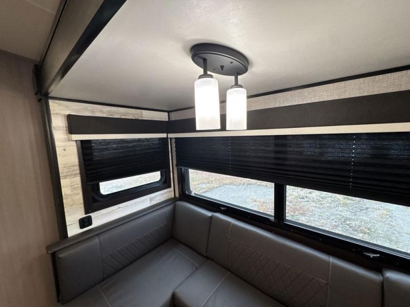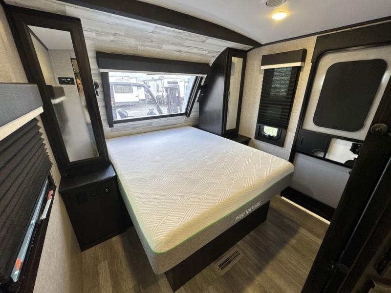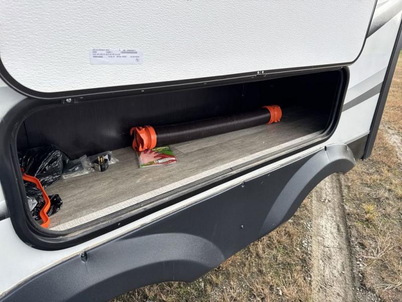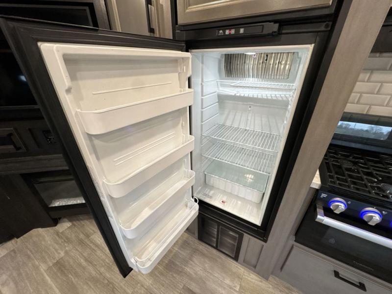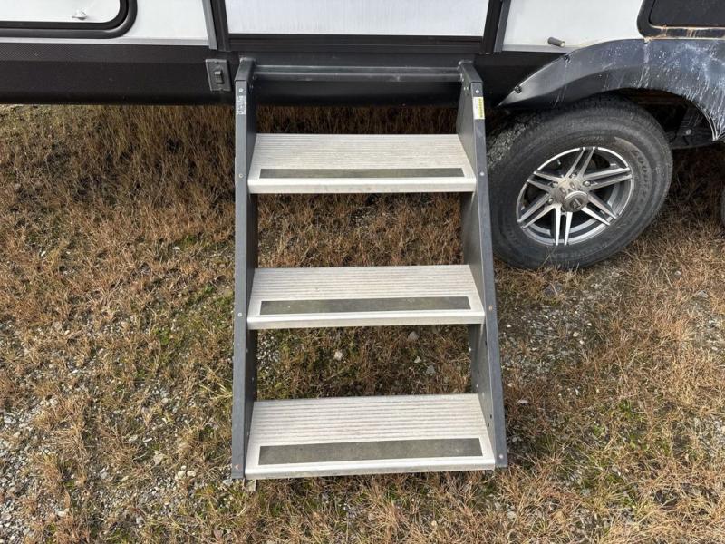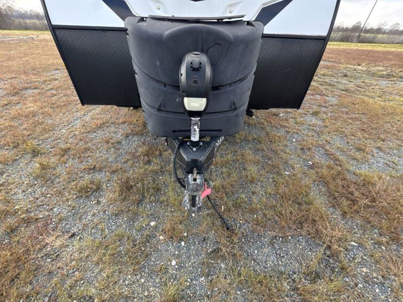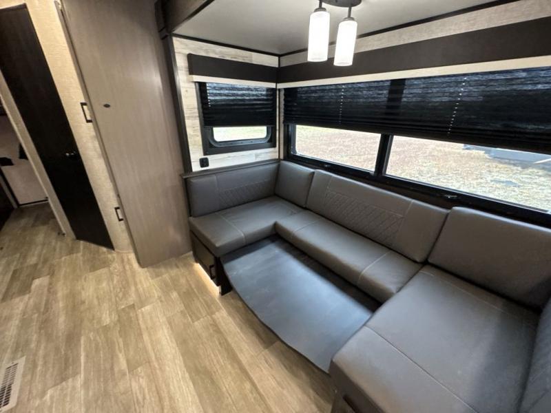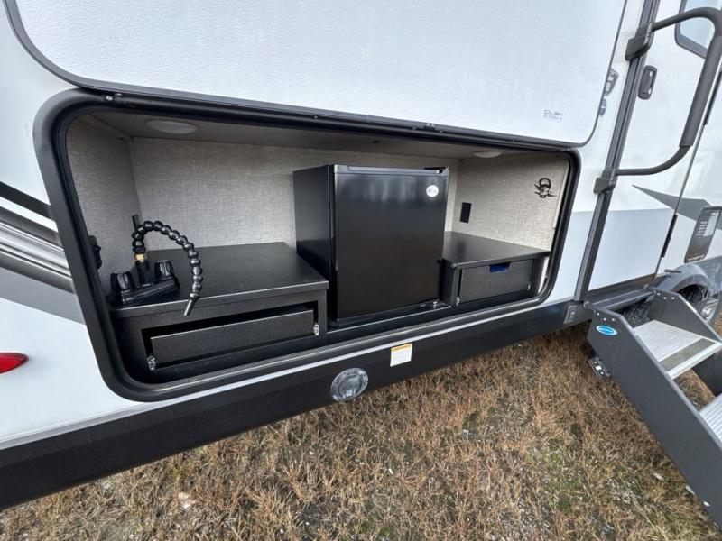 Bring the whole family along in this spacious travel trailer. You will love visiting outside while the chef of your group prepares breakfast on the outdoor kitchen, plus there is a 21' power awning to shade you from the sun. If the weather isn't cooperating, head inside and dine around the U-shaped dinette. There is also a tri-fold sofa here, a fireplace, and an LED TV for movies. This model conveniently has dual entry doors so you can enter in through the main living area, or into the front private bedroom. The bedroom also features a queen bed, dual wardrobes, and a closet to keep your items organized. Start camping today!