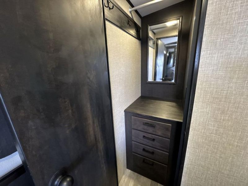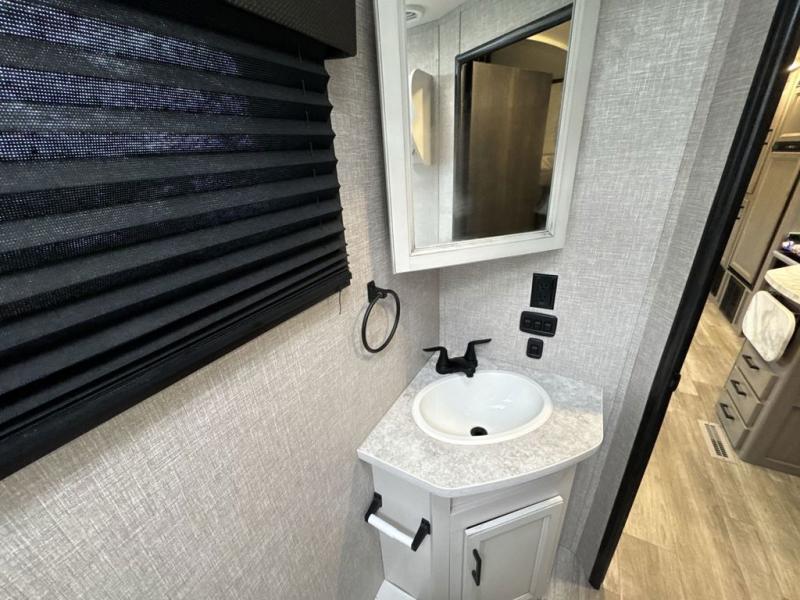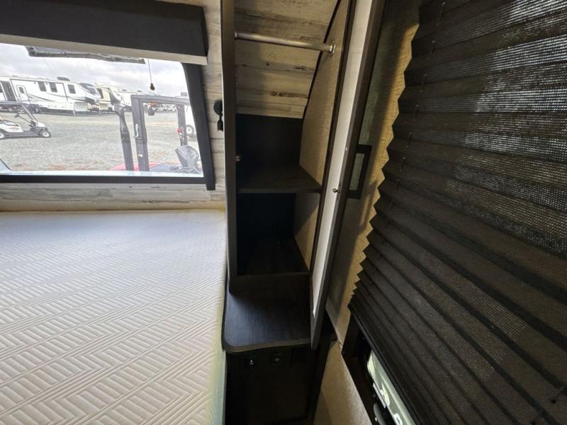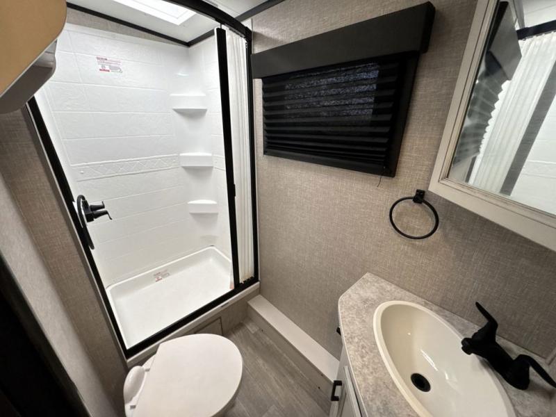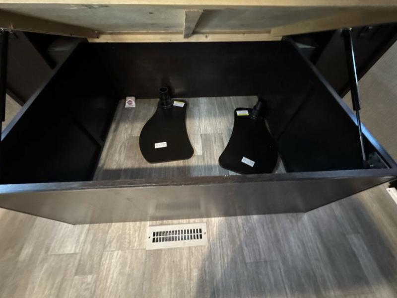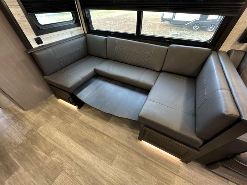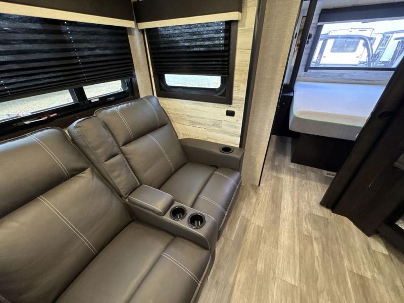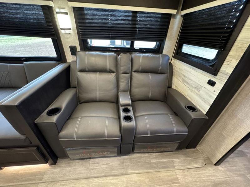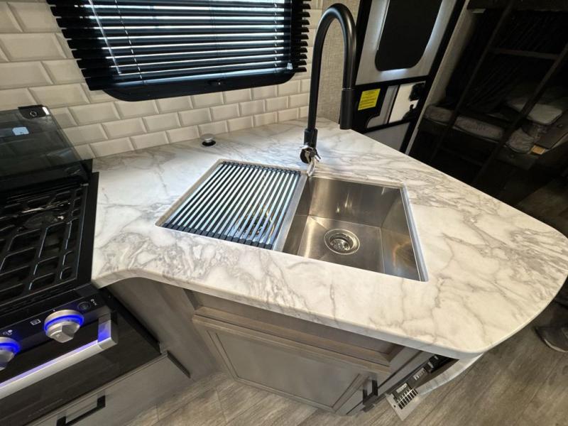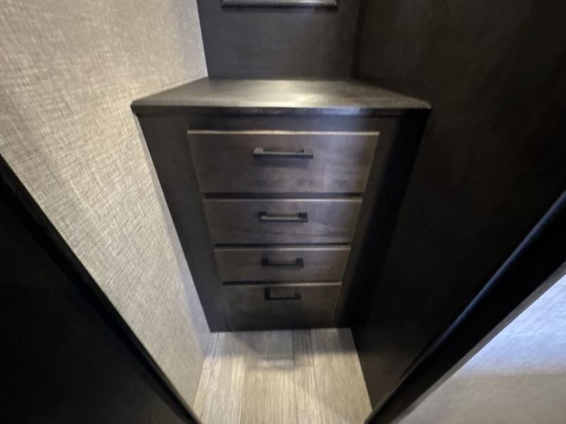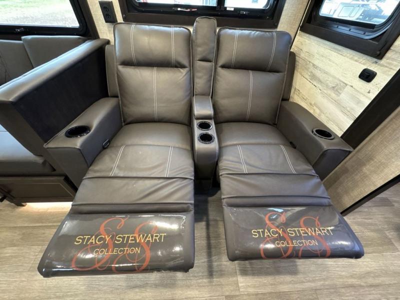Bring the whole family along in this spacious travel trailer. You will love visiting outside while the chef of your group prepares breakfast on the outdoor kitchen, plus there is a 21' power awning to shade you from the sun. If the weather isn't cooperating, head inside and dine around the U-shaped dinette. There is also a tri-fold sofa here, a fireplace, and an LED TV for movies. This model conveniently has dual entry doors so you can enter in through the main living area, or into the front private bedroom. The bedroom also features a queen bed, dual wardrobes, and a closet to keep your items organized. Start camping today!