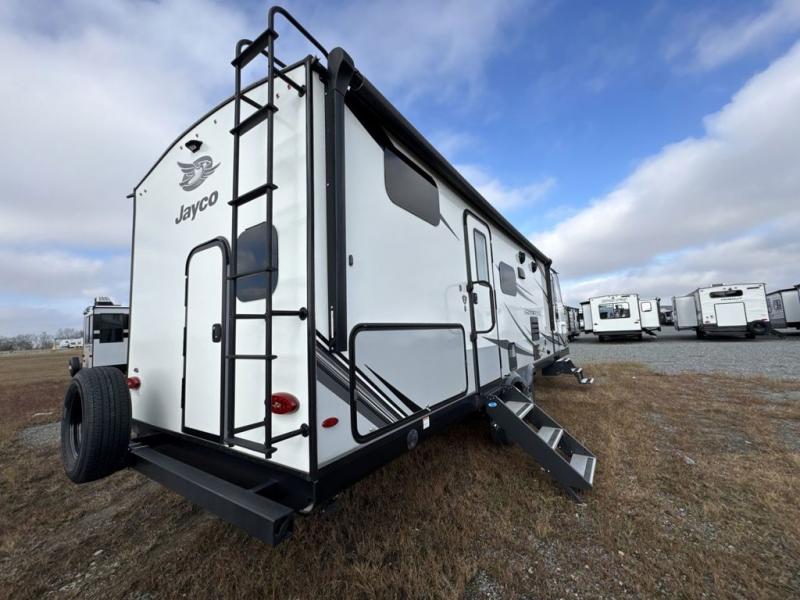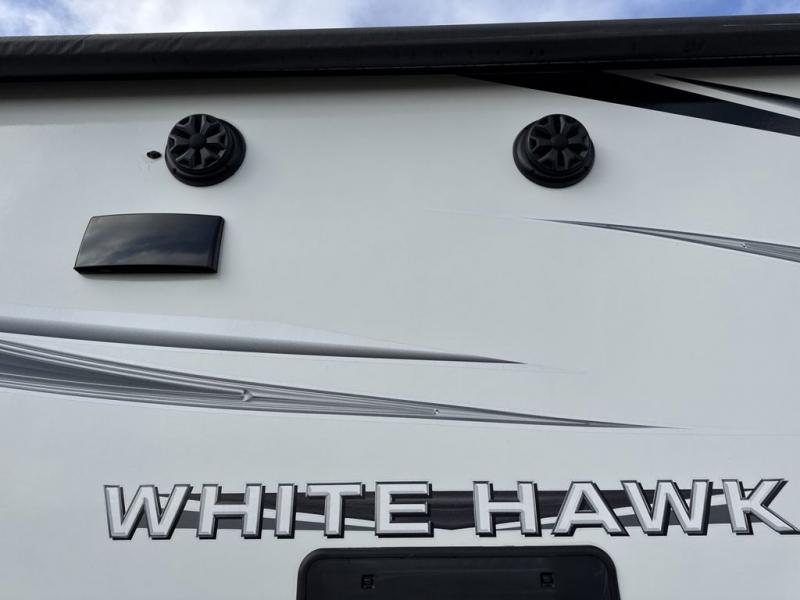 The lightweight White Hawk travel trailers by Jayco will blow you away with their roomy interiors, luxurious amenities, and durable construction. The Magnum Truss Roof System can withstand 50% more weight than the competition, and the Stronghold VBL lamination is the lightest, yet strongest in the industry. Each model includes the JAYCOMMAND "Smart RV" system with a tire pressure monitor system, plus American-made Goodyear tires for maximum durability and carrying capacity. You will love the sleek look of the front molded fiberglass cap with an automotive windshield and blue LED accent lighting, along with the frameless windows and automotive-style aluminum rims. The White Hawk travel trailers also include an arched interior ceiling, a kitchen skylight with a shade, residential vinyl flooring with cold crack resistance, and an electric fireplace.