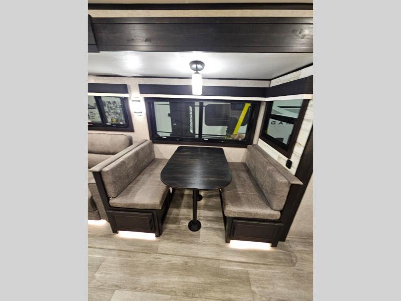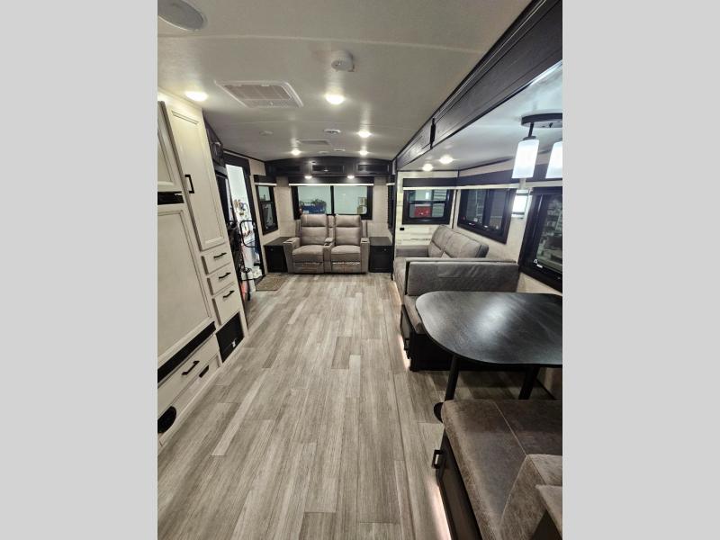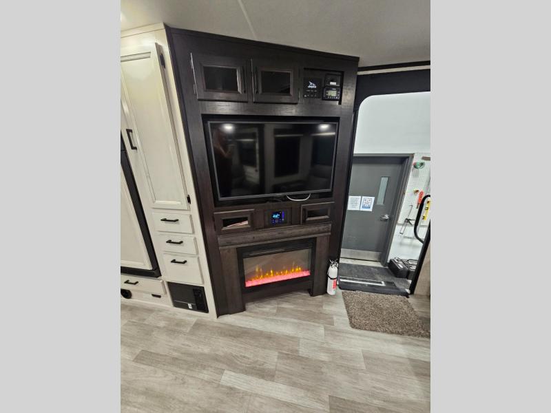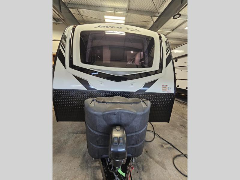 How does a dual entry travel trailer sound with sleeping space for five? Pack up and head to the lake because this model is the one! Once you arrive at your destination, set up the 20' power awning and a enjoy a cold drink in your camp chair. There is a convenient Jayport with an LP quick connect if you want to hook up your gas grill you brought along, and plenty of outside storage to bring along the fishing poles. Inside, your crew can relax on the tri-fold sofa, the booth dinette, or the rear theater seat, which is in great view of the LED TV and fireplace. Preparing meals will be easy in this White Hawk kitchen with plenty of counter space, a three burner cooktop, plus a microwave oven. The full bath includes a linen closet to store clean towels and a medicine cabinet to bring along your necessities. And don't overlook the front private bedroom with a queen bed, dual wardrobes, and its own exterior entry door for convenience!