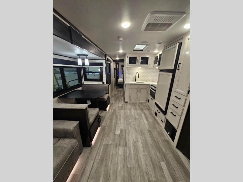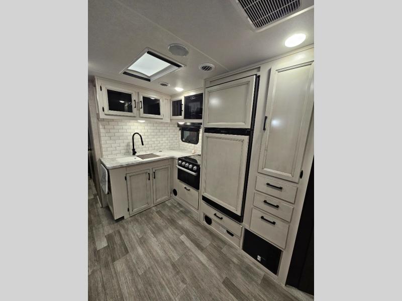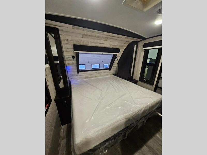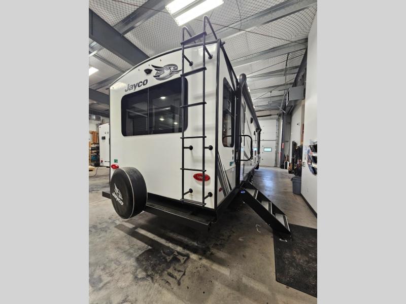 The lightweight White Hawk travel trailers by Jayco will blow you away with their roomy interiors, luxurious amenities, and durable construction. The Magnum Truss Roof System can withstand 50% more weight than the competition, and the Stronghold VBL lamination is the lightest, yet strongest in the industry. Each model includes the JAYCOMMAND "Smart RV" system with a tire pressure monitor system, plus American-made Goodyear tires for maximum durability and carrying capacity. You will love the sleek look of the front molded fiberglass cap with an automotive windshield and blue LED accent lighting, along with the frameless windows and automotive-style aluminum rims. The White Hawk travel trailers also include an arched interior ceiling, a kitchen skylight with a shade, residential vinyl flooring with cold crack resistance, and an electric fireplace.