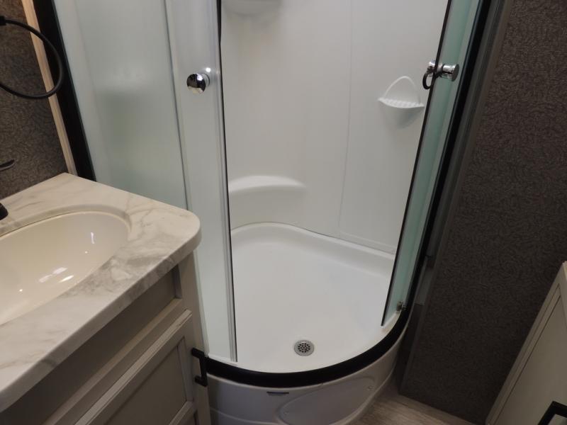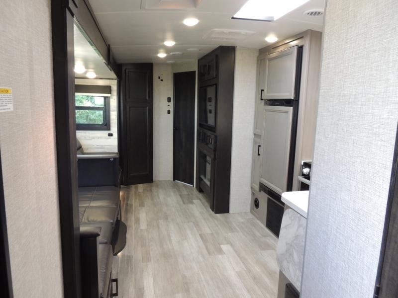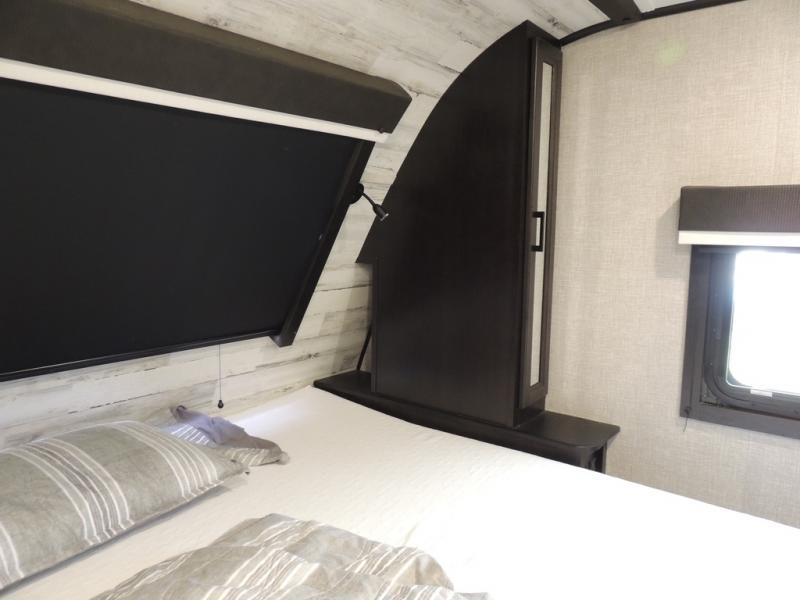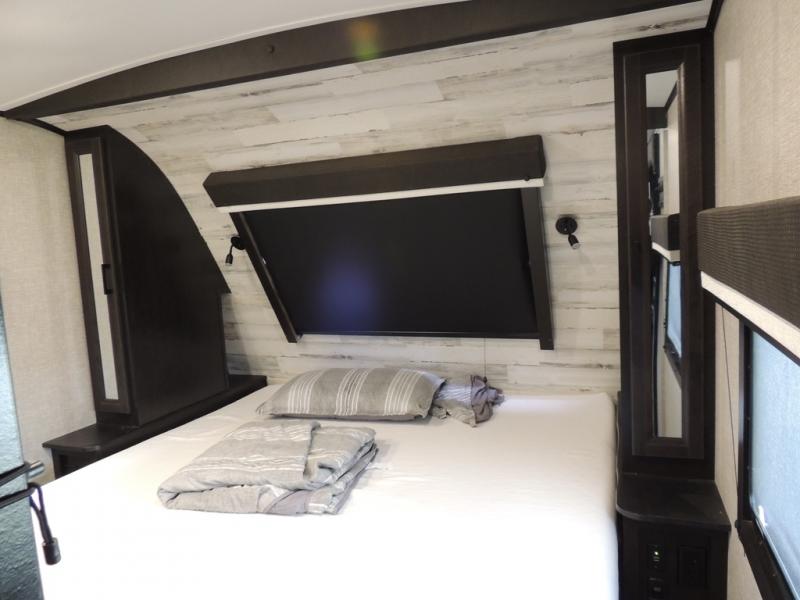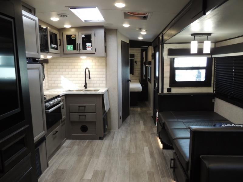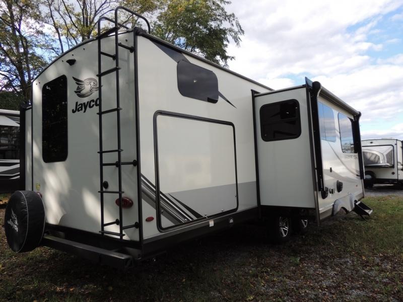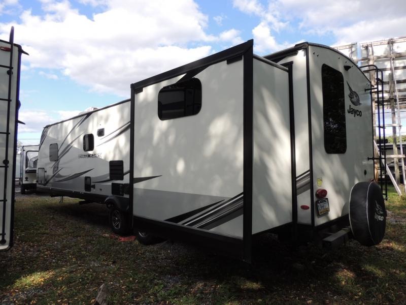 The lightweight White Hawk travel trailers by Jayco will blow you away with their roomy interiors, luxurious amenities, and durable construction. The Magnum Truss Roof System can withstand 50% more weight than the competition, and the Stronghold VBL lamination is the lightest, yet strongest in the industry. Each model includes the JAYCOMMAND "Smart RV" system with a tire pressure monitor system, plus American-made Goodyear tires for maximum durability and carrying capacity. You will love the sleek look of the front molded fiberglass cap with an automotive windshield and blue LED accent lighting, along with the frameless windows and automotive-style aluminum rims. The White Hawk travel trailers also include an arched interior ceiling, a kitchen skylight with a shade, residential vinyl flooring with cold crack resistance, and an electric fireplace.
