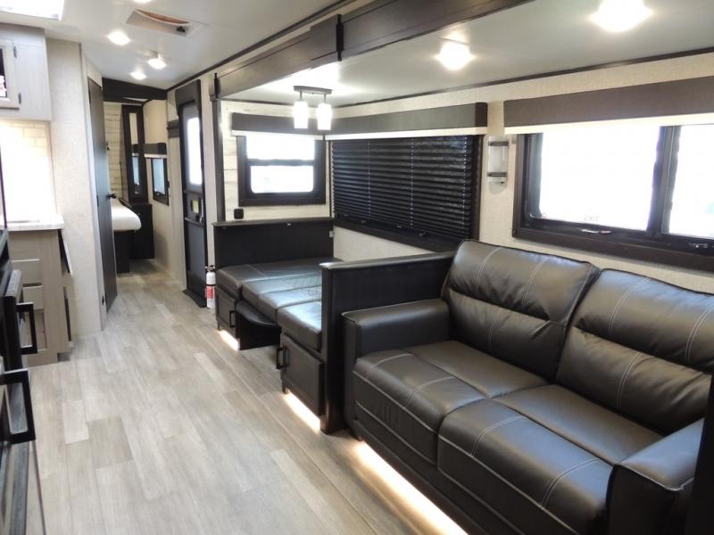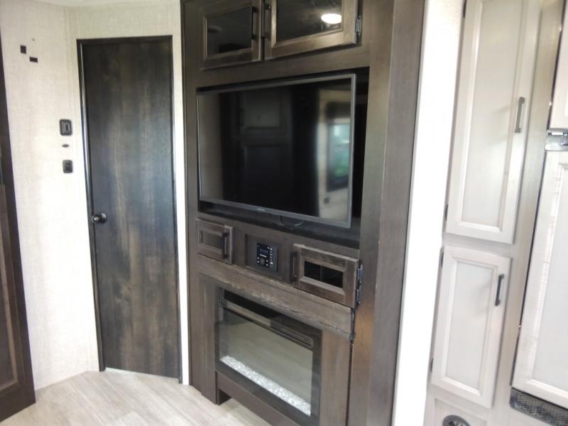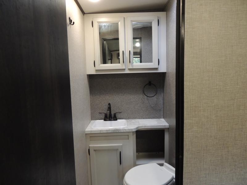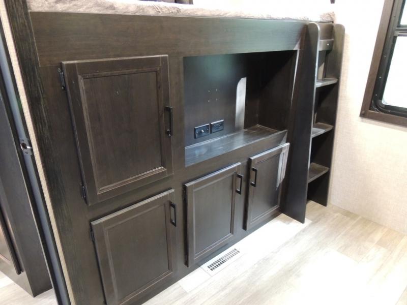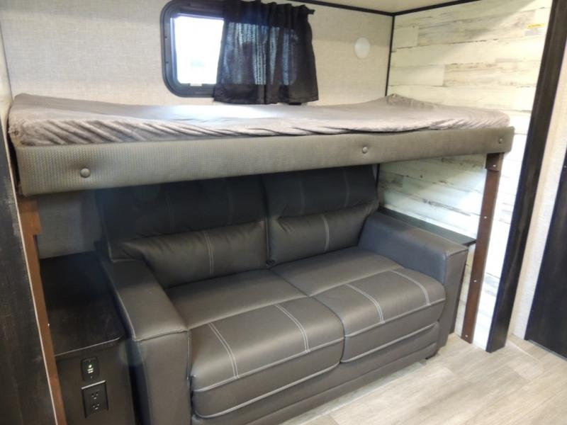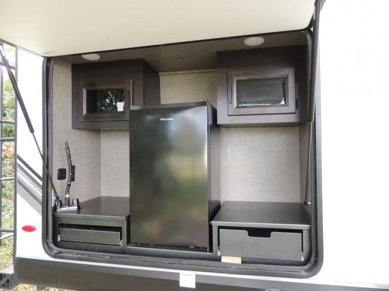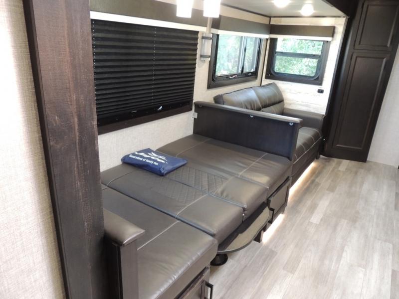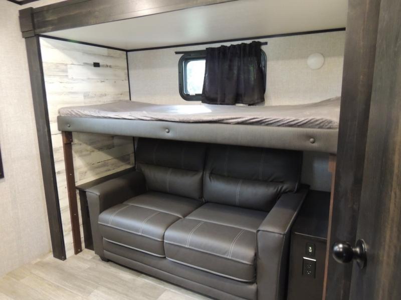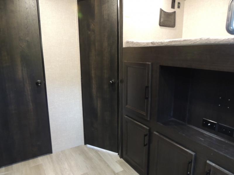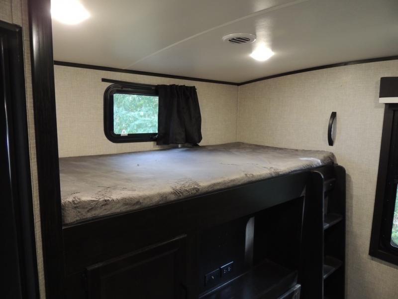 Family camping trips just got sweeter in this double slide out travel trailer that can sleep nine to ten people each night. You will enjoy your own private bedroom up front with a queen bed and three wardrobes. Your guests can make themselves comfortable in the rear private bunkhouse suite that includes two bunks, a tri-fold sofa, plus a convenient half bath! The full bath includes a radius shower with a skylight, a medicine cabinet, plus a linen closet for clean towels. This model includes a three burner cooktop and a microwave oven indoors to prepare meals, plus there is an outdoor kitchen for a sunrise breakfast. There are even two power awnings for maximum protection from the hot summer sun!