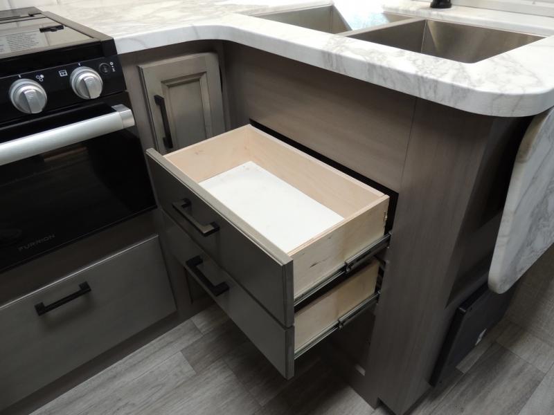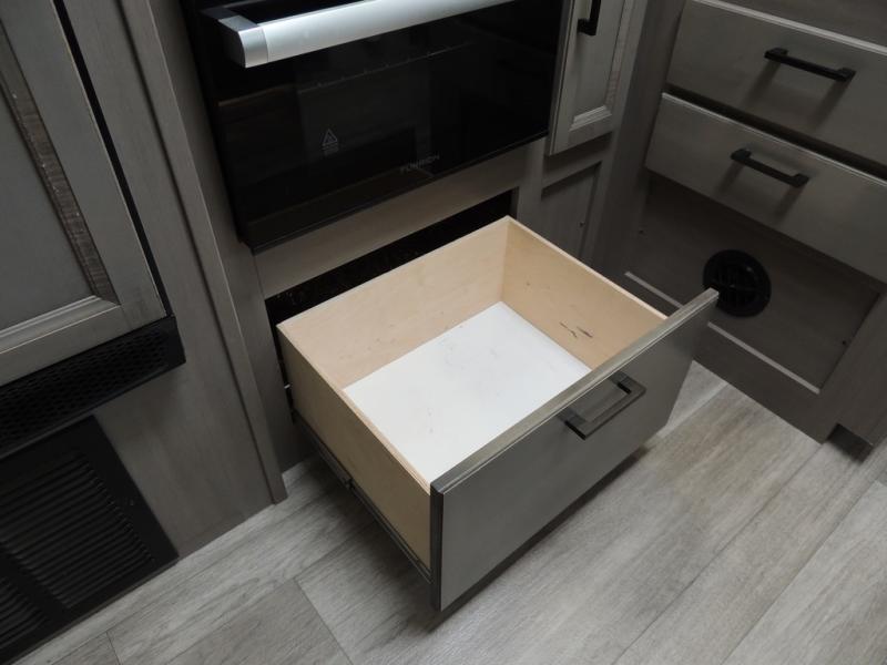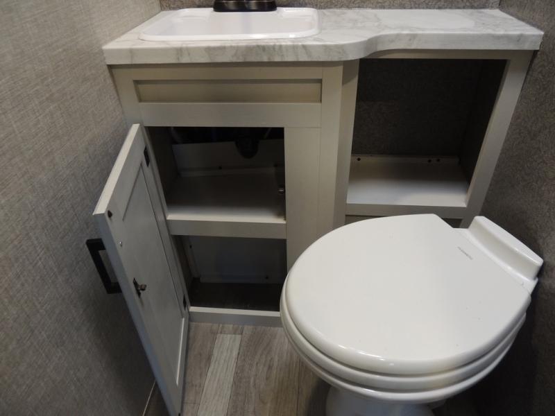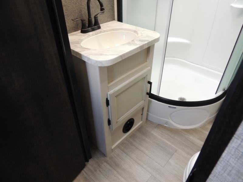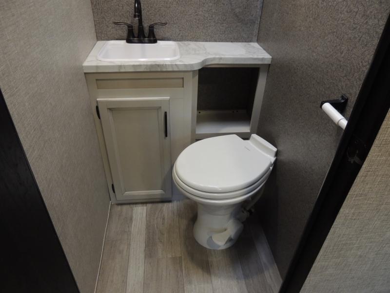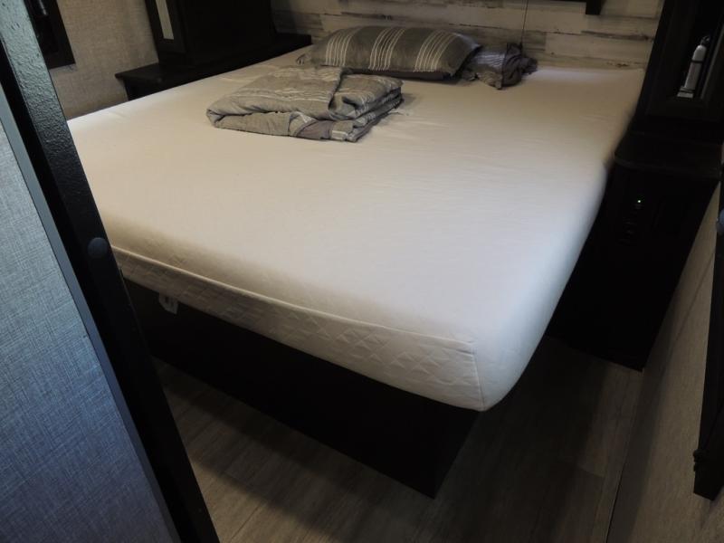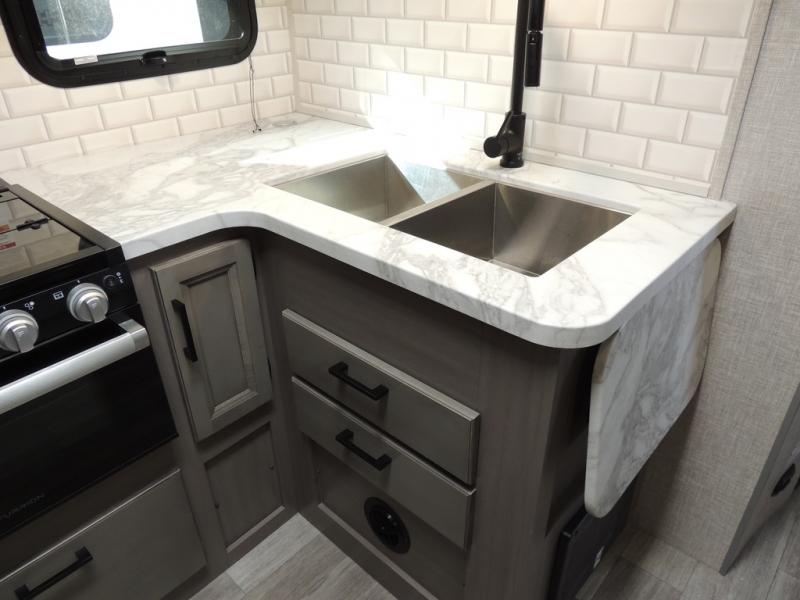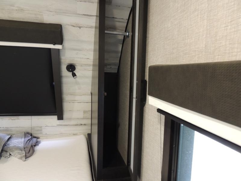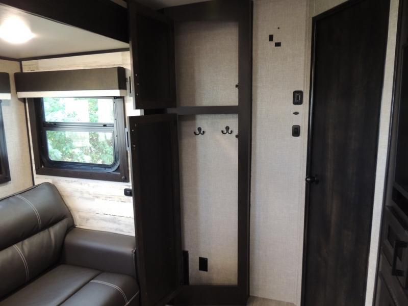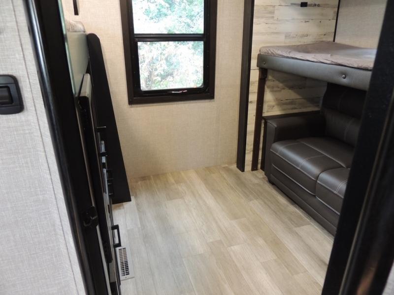 Family camping trips just got sweeter in this double slide out travel trailer that can sleep nine to ten people each night. You will enjoy your own private bedroom up front with a queen bed and three wardrobes. Your guests can make themselves comfortable in the rear private bunkhouse suite that includes two bunks, a tri-fold sofa, plus a convenient half bath! The full bath includes a radius shower with a skylight, a medicine cabinet, plus a linen closet for clean towels. This model includes a three burner cooktop and a microwave oven indoors to prepare meals, plus there is an outdoor kitchen for a sunrise breakfast. There are even two power awnings for maximum protection from the hot summer sun!