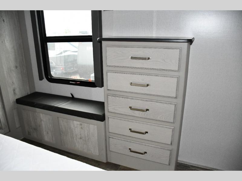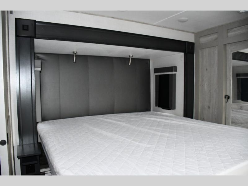 • Private front bedroom with king bed slide, underbed storage, bench, and master closet with washer/dryer prep