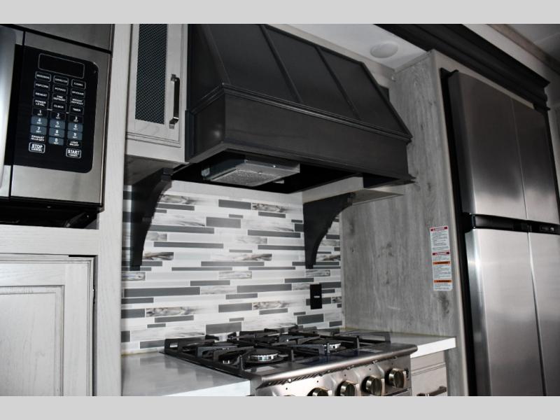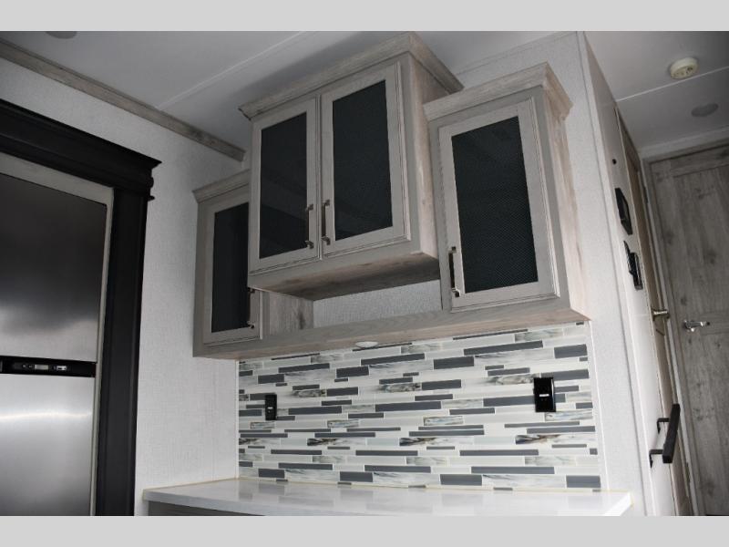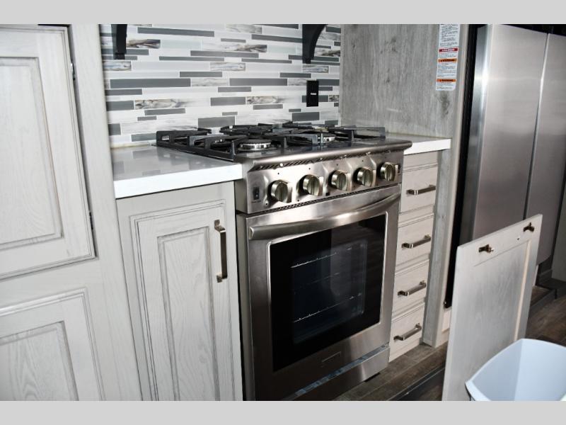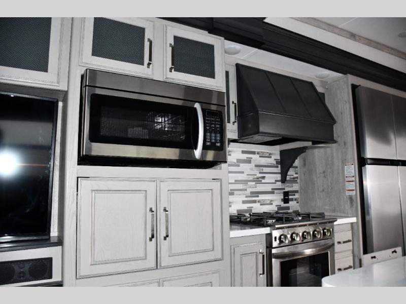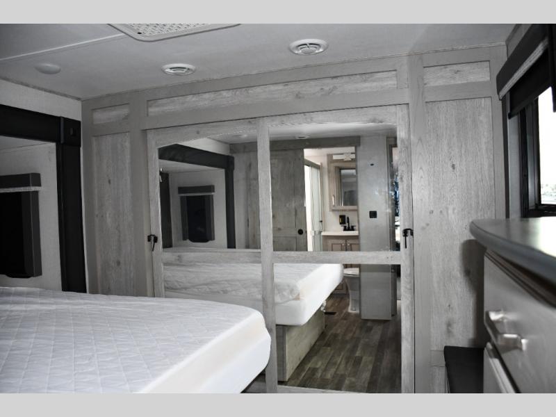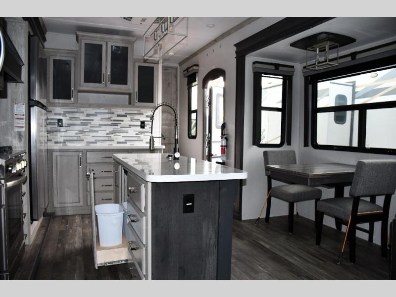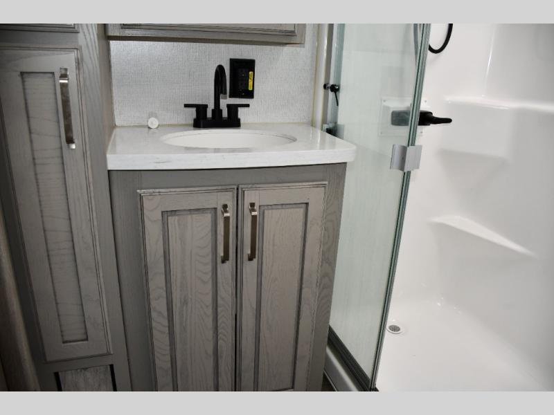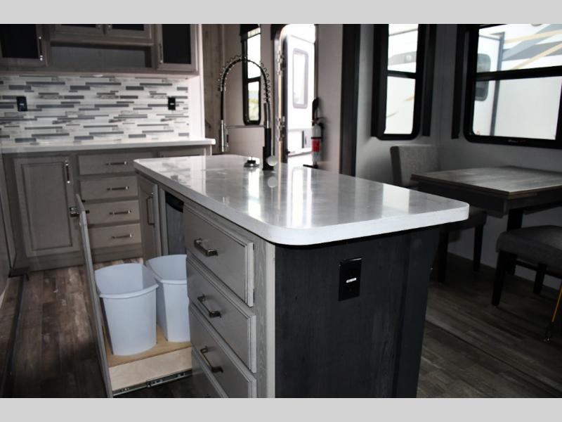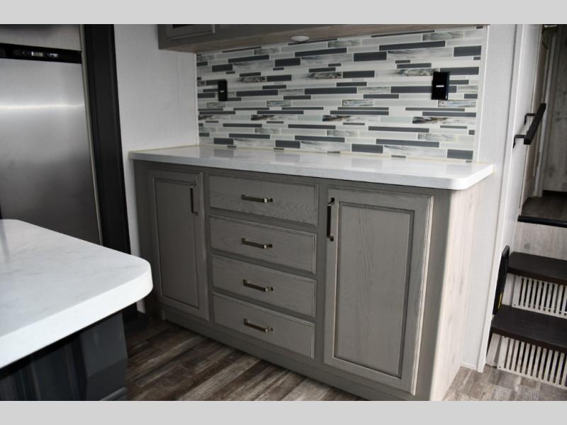 With expansive counter space, a center island, and a full-size refrigerator, meal prep feels more like home than an RV. Whether you’re making a quick snack for the road or hosting friends at the campsite, this kitchen has room for it all. The hutch provides extra storage for dishes and cookware, while modern finishes elevate the look and feel of the entire space.
