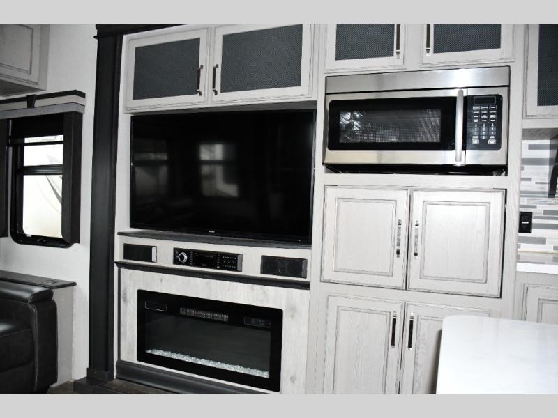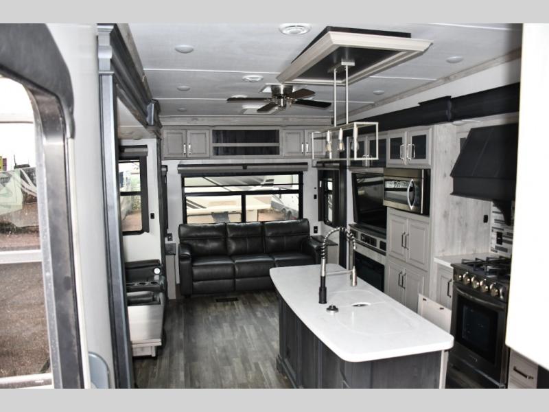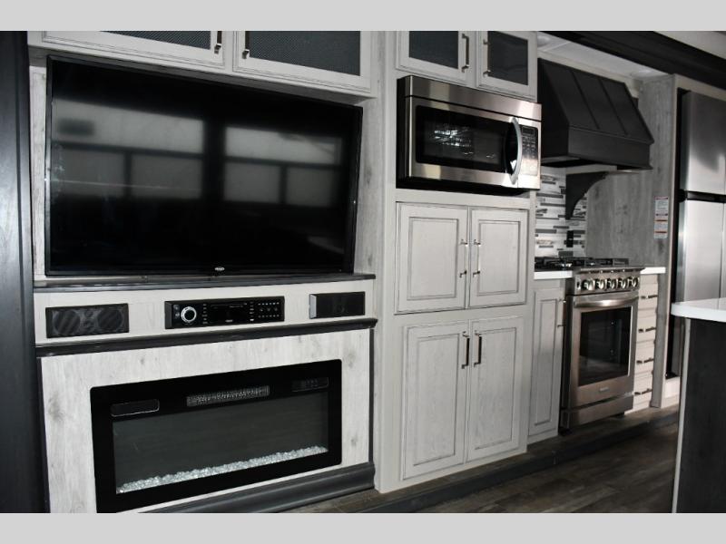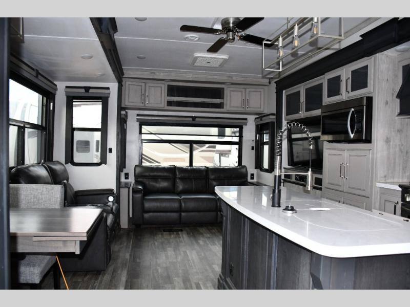 Keystone Alpine fifth wheels are known for luxury that lasts. With 100" wide-body construction, high ceilings, and almost 7' tall slides, you’ll enjoy an open and residential feel. Frameless panoramic windows bring the outdoors in, while in-floor heating vents keep air flowing efficiently, just like at home. Heated basement storage ensures your gear is safe and usable in any season, whether you’re camping in the desert heat or the cool mountain air.