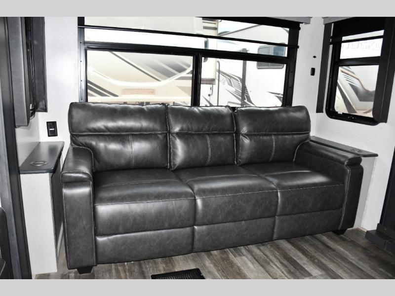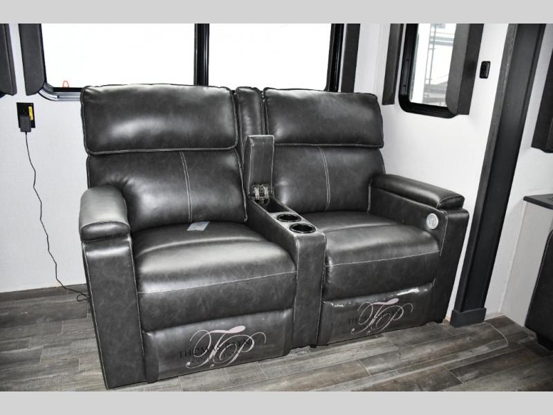 • Rear living area with hide-a-bed sofa sleeper and Thomas Payne theater seating with heat, massage, LED lights, and USB charging