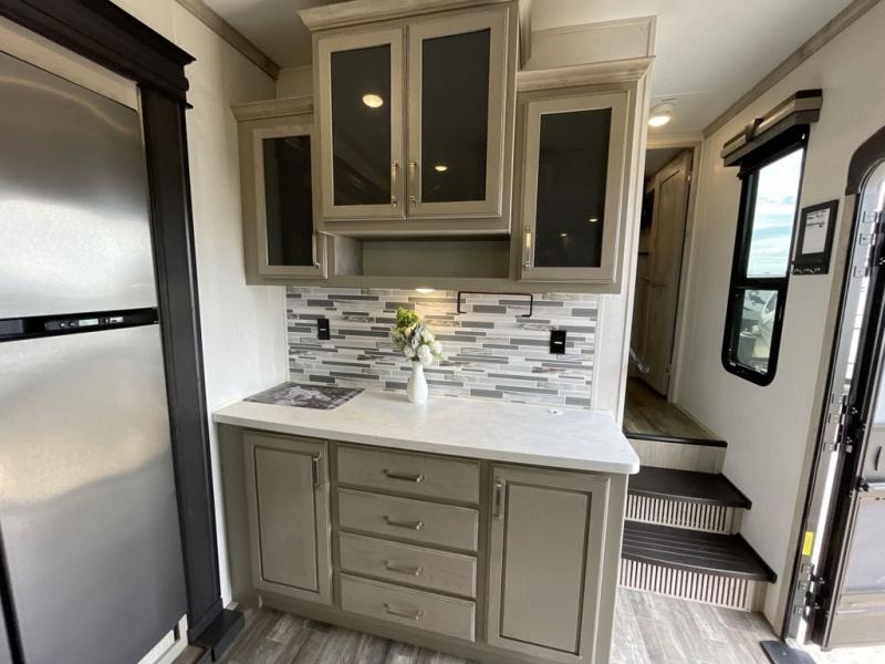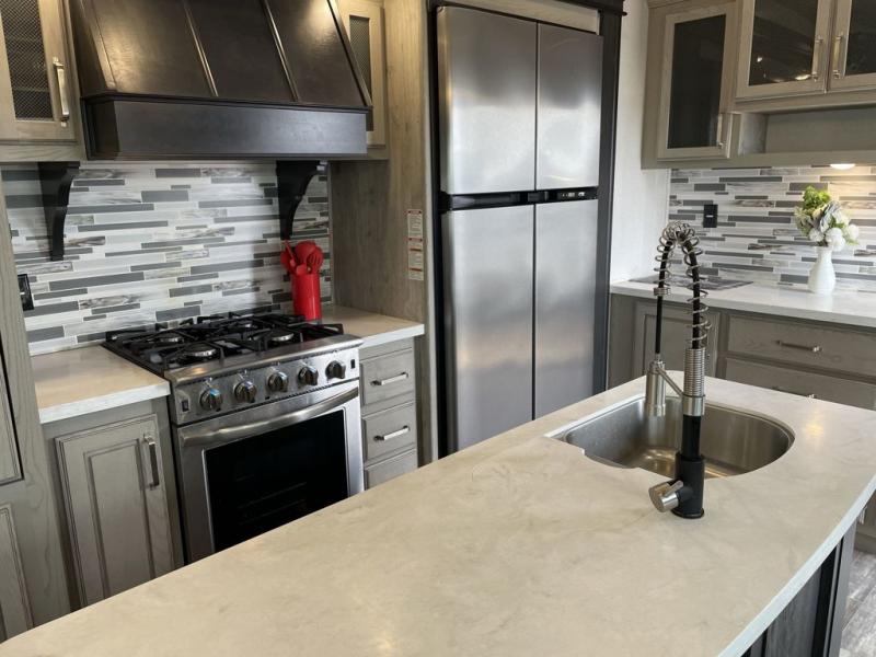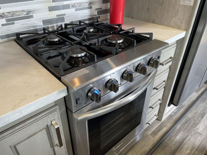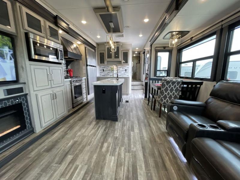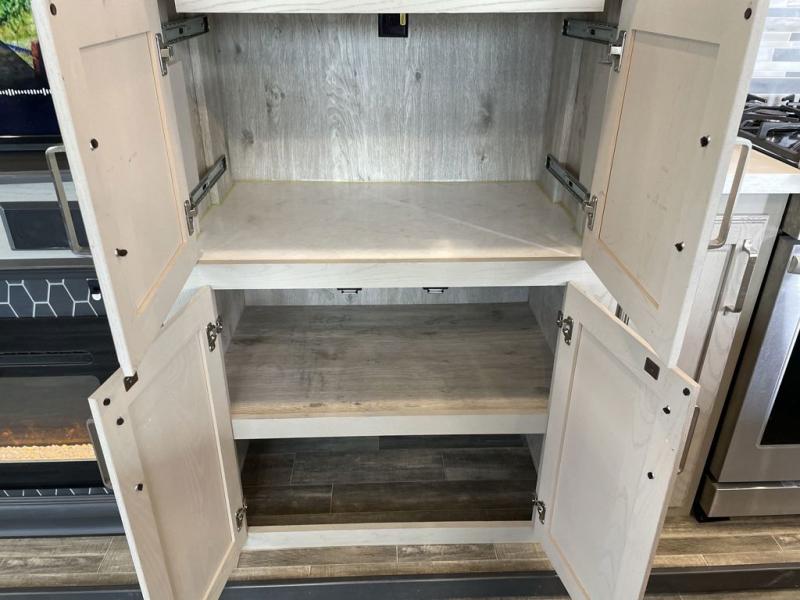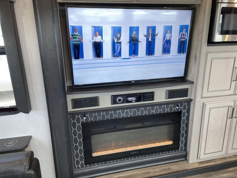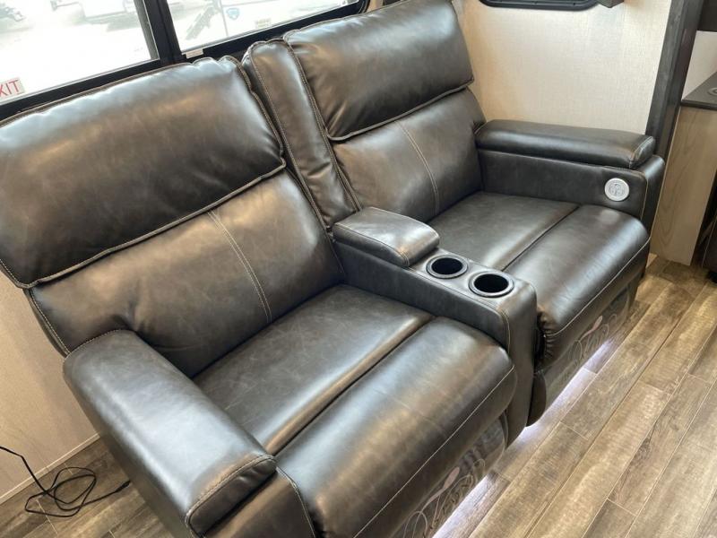 You will feel right at home camping in this fifth wheel! The chef will have lots of countertop space to prepare their best meals along with a kitchen island, a hutch to store your dishes, and a 18 cu. ft. gas/electric refrigerator to store any leftovers. The free standing dinette offers a comfortable place to enjoy your meals then play a card game or you can relax on the hide-a-bed sofa sleeper or the Thomas Payne theater seating equipped with heat, massage, LED lights, and a USB charging station across from the entertainment center with a 40" fireplace and a 50" TV. The dual entry bathroom has a shower with a seat and is easy for everyone to access especially those staying in the front private bedroom. The bedroom also has a king bed slide with storage underneath for extra blankets, a bench next to a chest, and a front master closet that is prepped to add an optional washer and dryer for clean clothes throughout your entire trip!