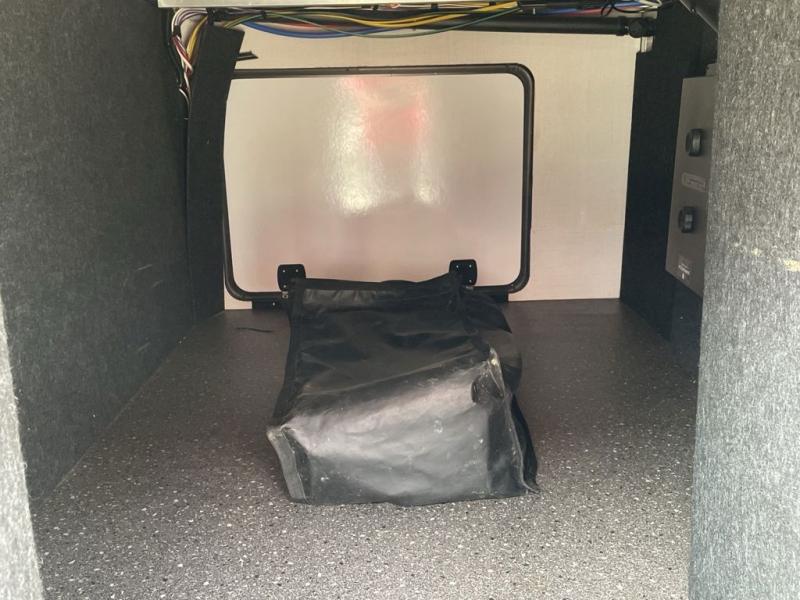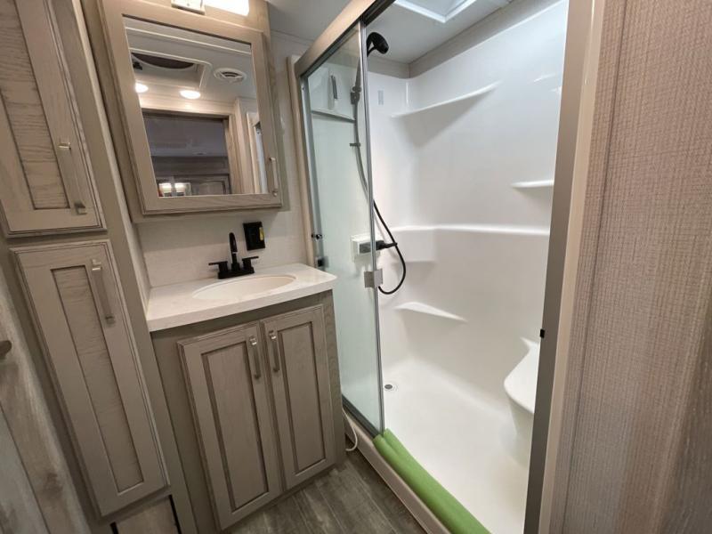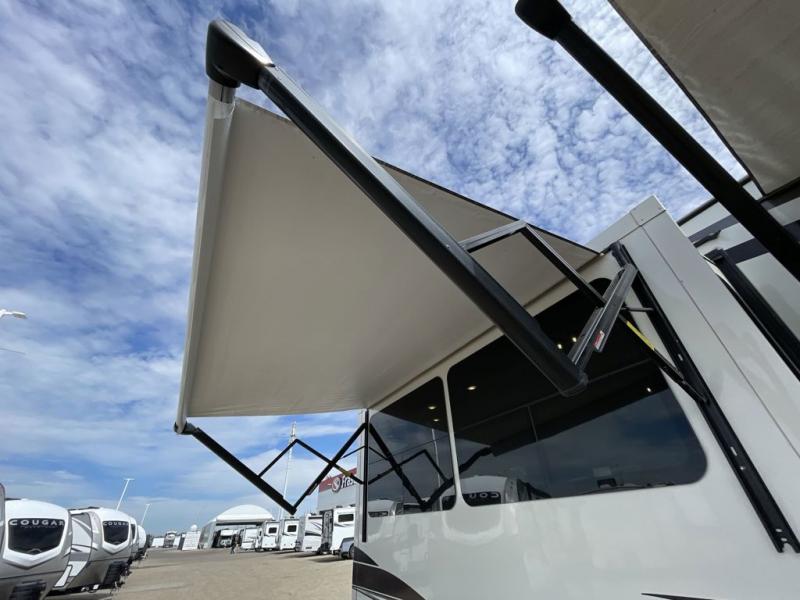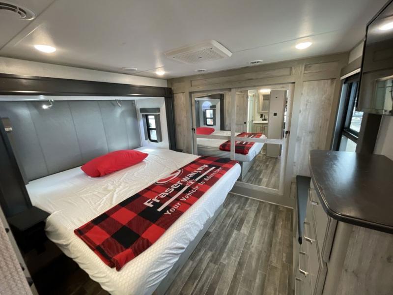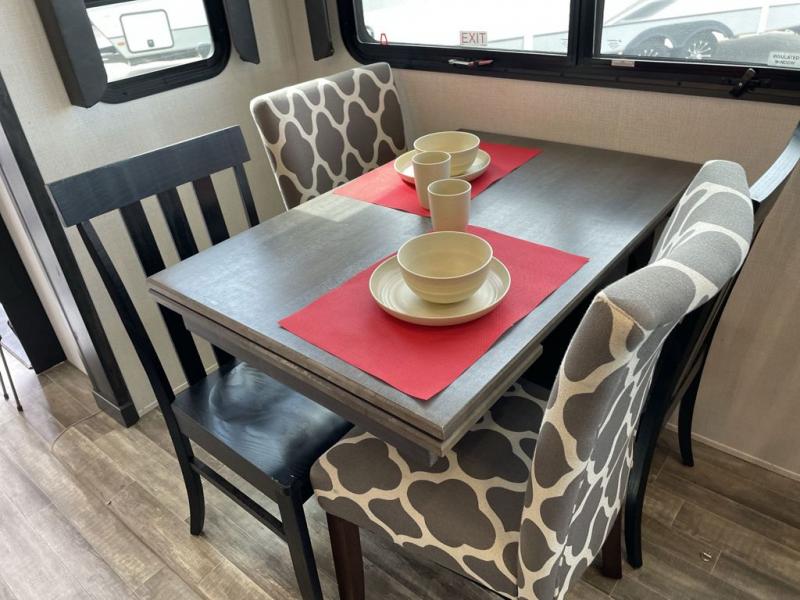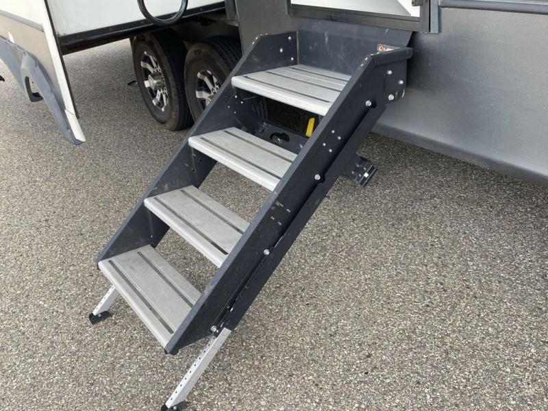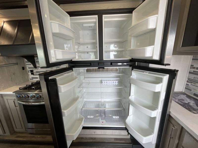 You will feel right at home camping in this fifth wheel! The chef will have lots of countertop space to prepare their best meals along with a kitchen island, a hutch to store your dishes, and a 18 cu. ft. gas/electric refrigerator to store any leftovers. The free standing dinette offers a comfortable place to enjoy your meals then play a card game or you can relax on the hide-a-bed sofa sleeper or the Thomas Payne theater seating equipped with heat, massage, LED lights, and a USB charging station across from the entertainment center with a 40" fireplace and a 50" TV. The dual entry bathroom has a shower with a seat and is easy for everyone to access especially those staying in the front private bedroom. The bedroom also has a king bed slide with storage underneath for extra blankets, a bench next to a chest, and a front master closet that is prepped to add an optional washer and dryer for clean clothes throughout your entire trip!