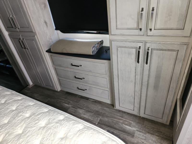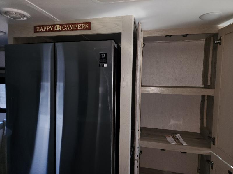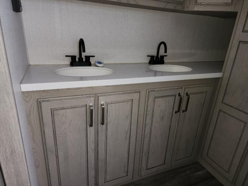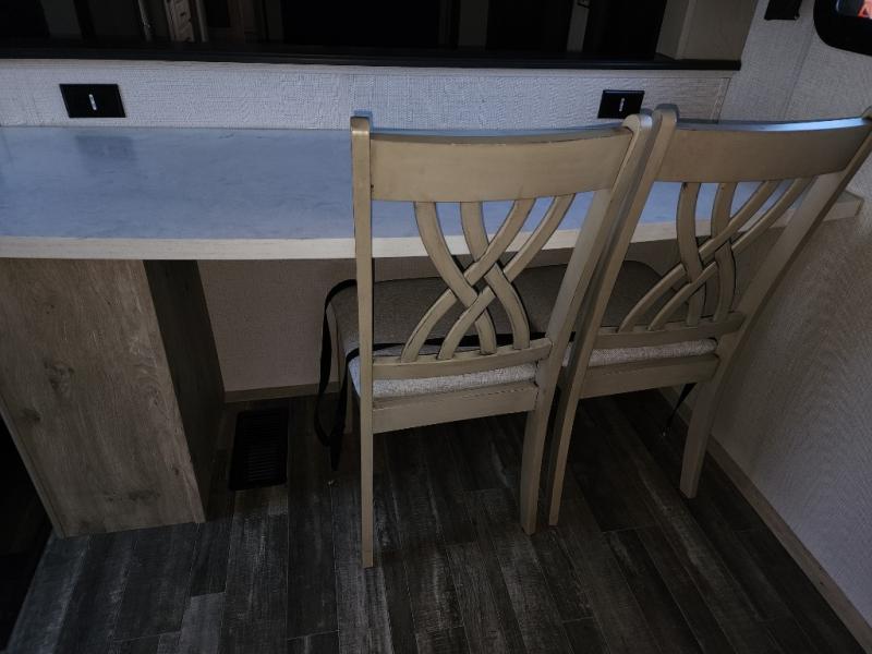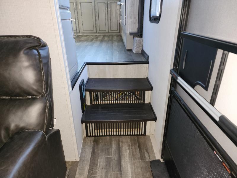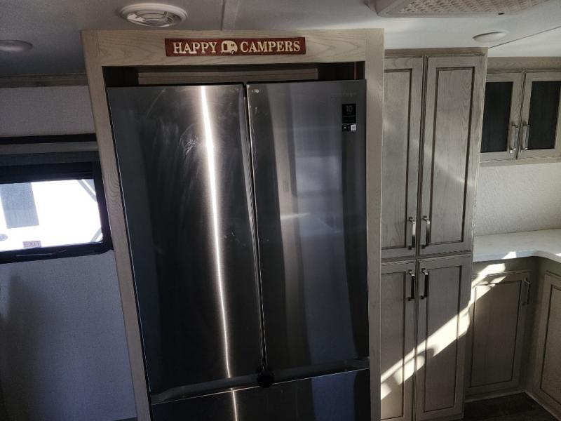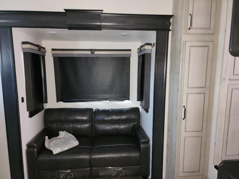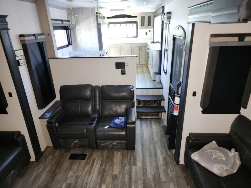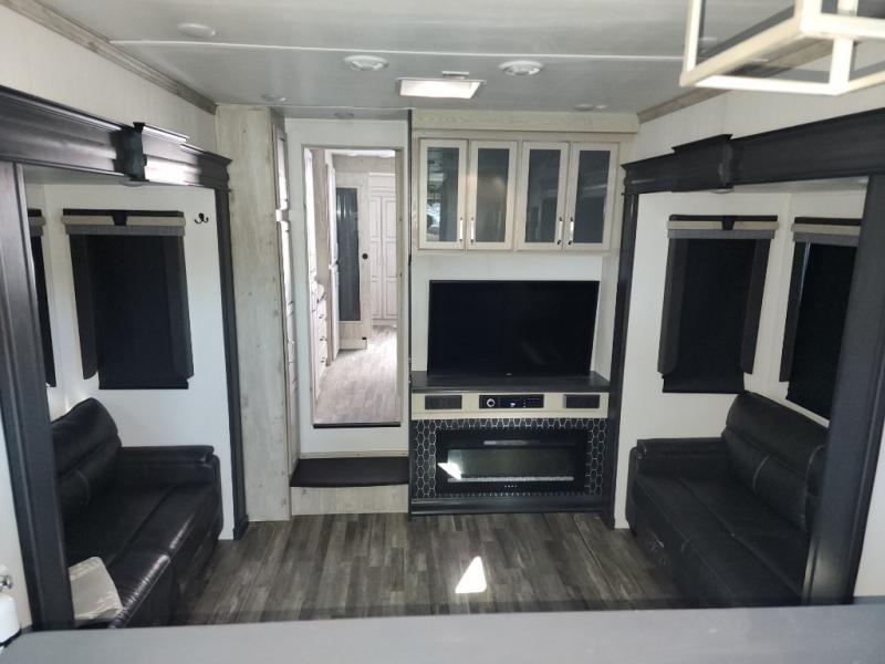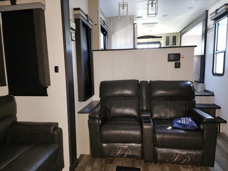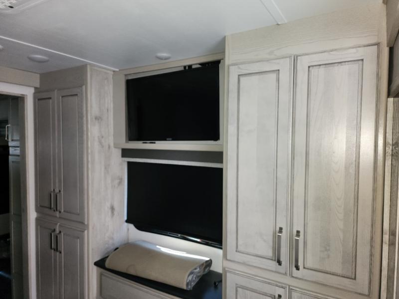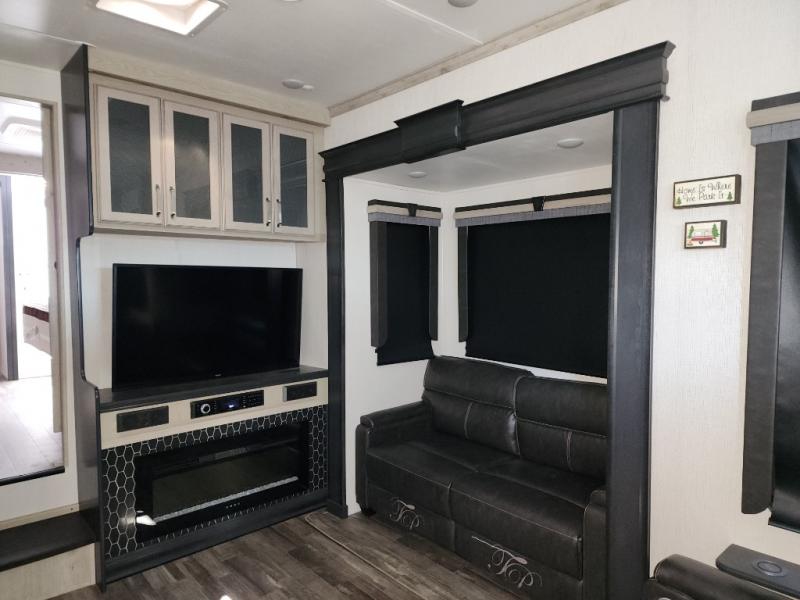 The chef of your group will love cooking in the front kitchen of this fifth wheel! The kitchen not only has extra countertop space to prepare your meals, a convection microwave, and 18 cu. ft. gas/electric refrigerator, but also a bar top with two bar stools overlooking the middle living area. Inside the living area is opposing tri-fold sofa sleeper slides that can be converted for extra sleeping spaces and Thomas Payne theater seating with heat, massage, LED lights, and a USB charging station across from an entertainment center with a 40" fireplace and 50" TV. The master suite has a king bed slide that has storage underneath and a chest with wardrobes on either side, plus access to the full rear bathroom which has a walk-in shower, a dual sink vanity for two to get ready at once, and an area prepped to add an optional washer and dryer!