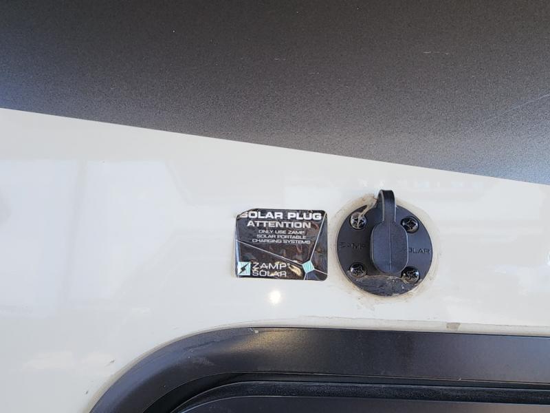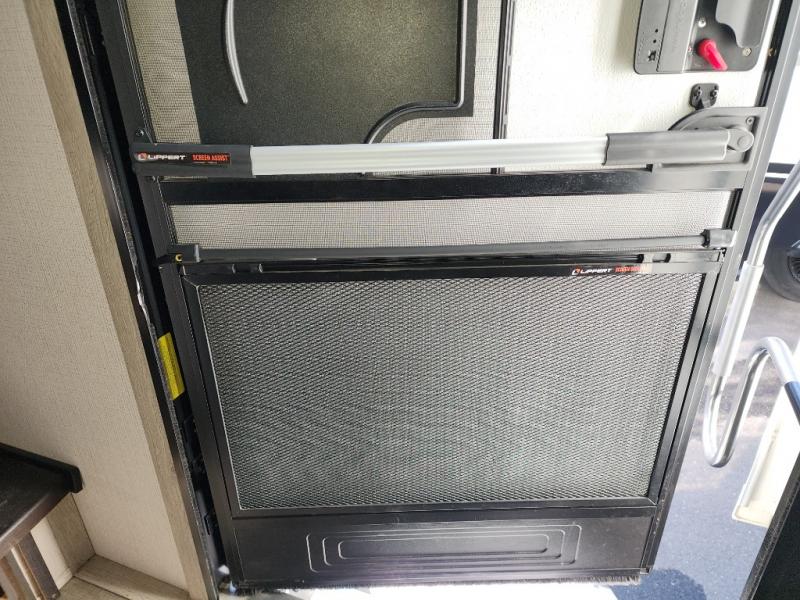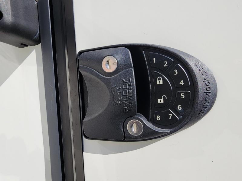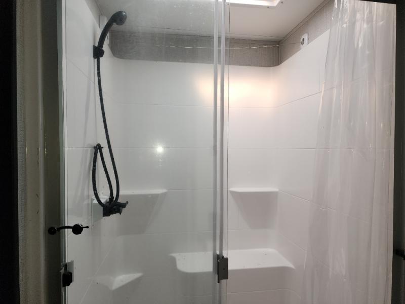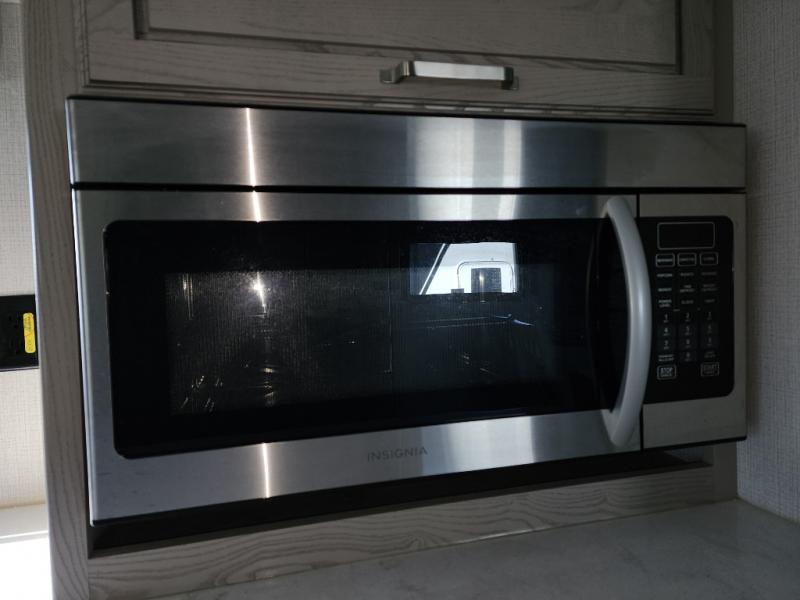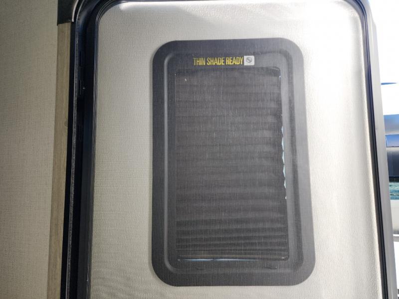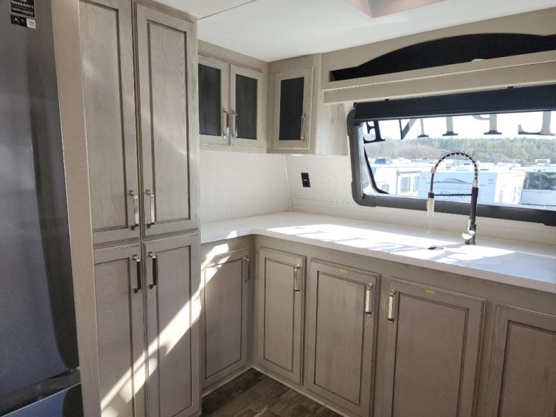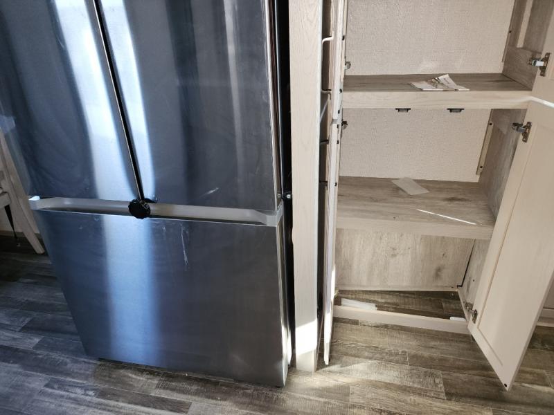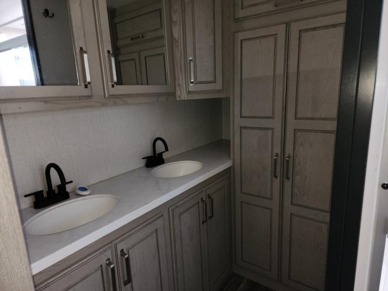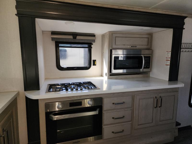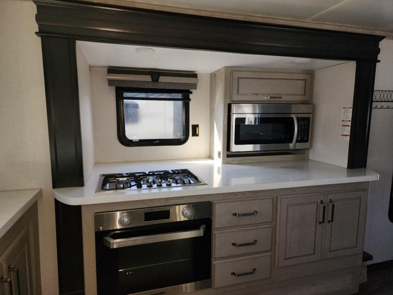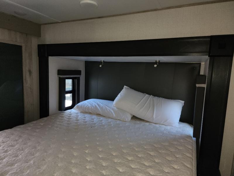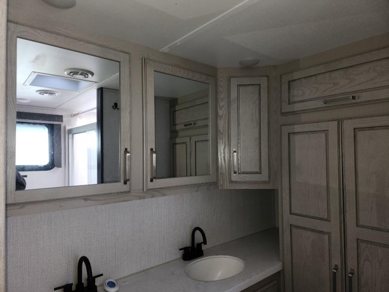 The chef of your group will love cooking in the front kitchen of this fifth wheel! The kitchen not only has extra countertop space to prepare your meals, a convection microwave, and 18 cu. ft. gas/electric refrigerator, but also a bar top with two bar stools overlooking the middle living area. Inside the living area is opposing tri-fold sofa sleeper slides that can be converted for extra sleeping spaces and Thomas Payne theater seating with heat, massage, LED lights, and a USB charging station across from an entertainment center with a 40" fireplace and 50" TV. The master suite has a king bed slide that has storage underneath and a chest with wardrobes on either side, plus access to the full rear bathroom which has a walk-in shower, a dual sink vanity for two to get ready at once, and an area prepped to add an optional washer and dryer!