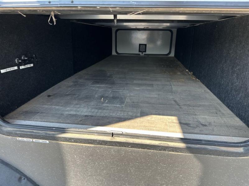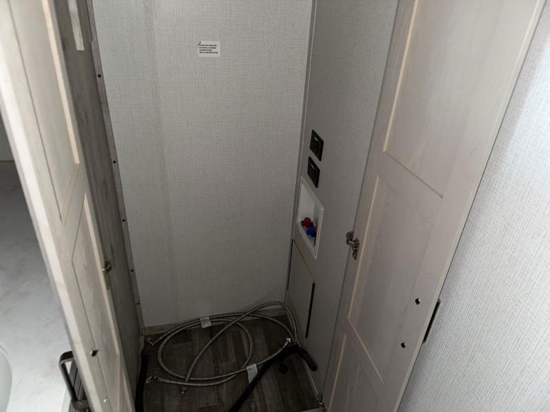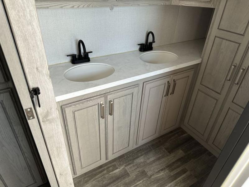 The chef of your group will love cooking in the front kitchen of this fifth wheel! The kitchen not only has extra countertop space to prepare your meals, a convection microwave, and 18 cu. ft. gas/electric refrigerator, but also a bar top with two bar stools overlooking the middle living area. Inside the living area is opposing tri-fold sofa sleeper slides that can be converted for extra sleeping spaces and Thomas Payne theater seating with heat, massage, LED lights, and a USB charging station across from an entertainment center with a 40" fireplace and 50" TV. The master suite has a king bed slide that has storage underneath and a chest with wardrobes on either side, plus access to the full rear bathroom which has a walk-in shower, a dual sink vanity for two to get ready at once, and an area prepped to add an optional washer and dryer!
