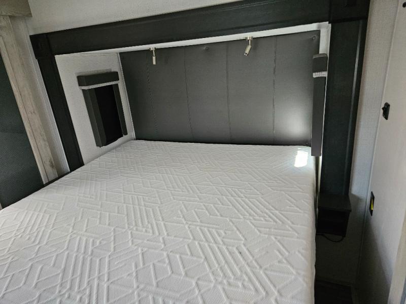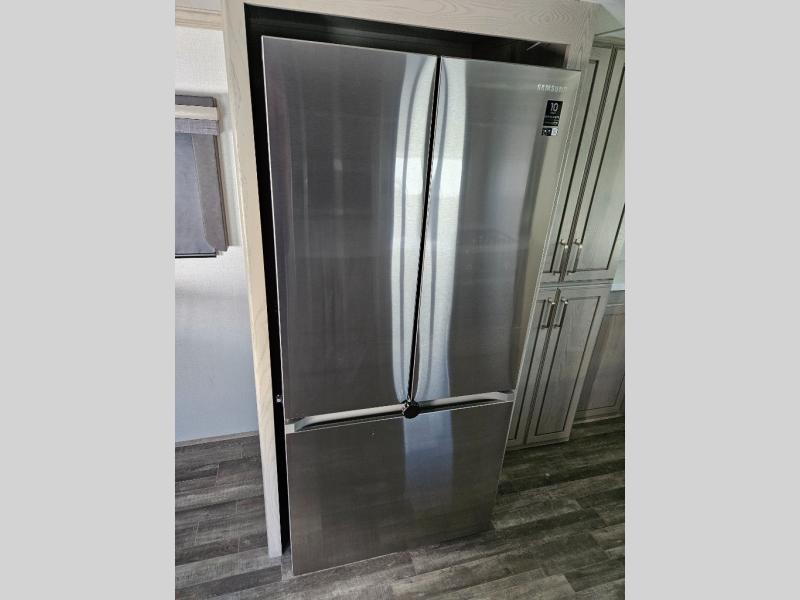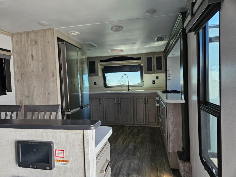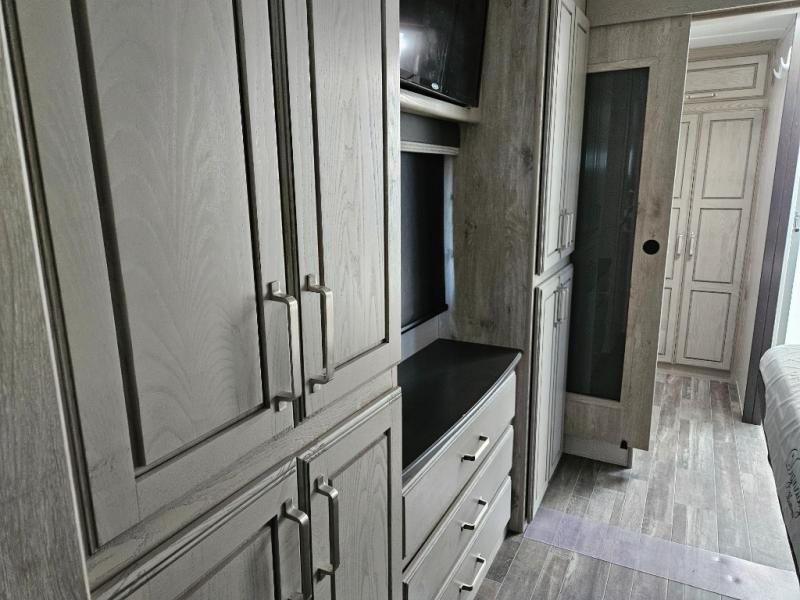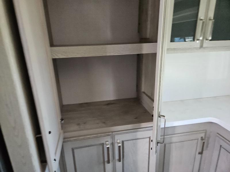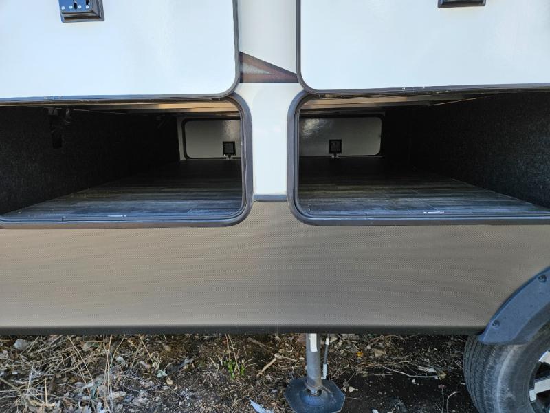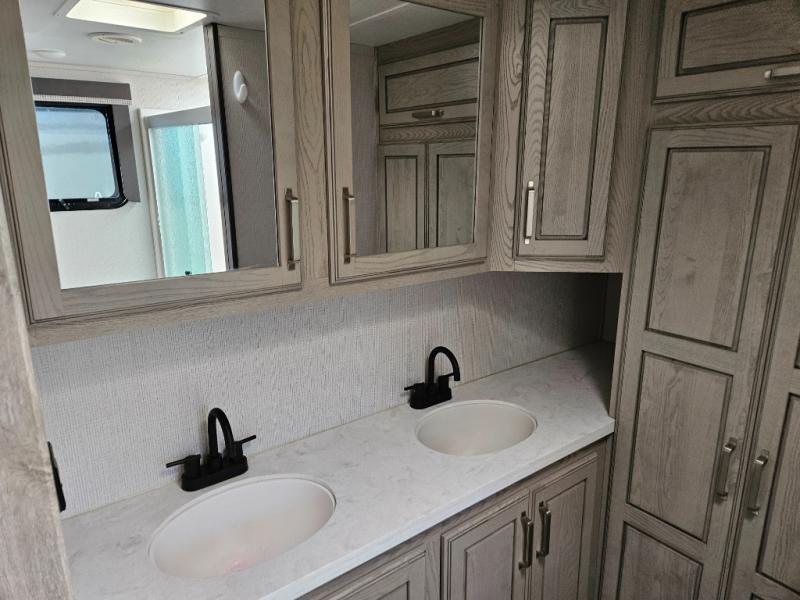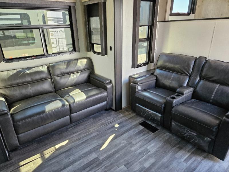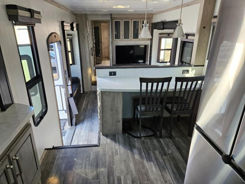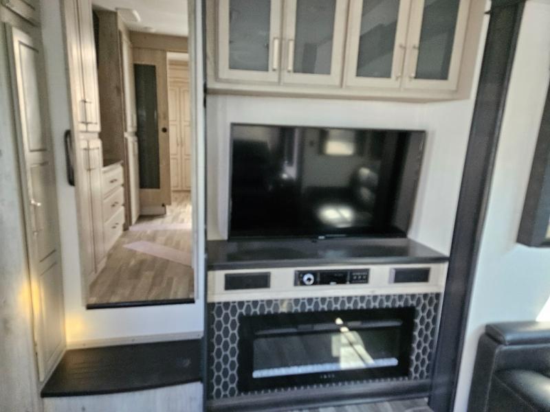 The chef of your group will love cooking in the front kitchen of this fifth wheel! The kitchen not only has extra countertop space to prepare your meals, a convection microwave, and 18 cu. ft. gas/electric refrigerator, but also a bar top with two bar stools overlooking the middle living area. Inside the living area is opposing tri-fold sofa sleeper slides that can be converted for extra sleeping spaces and Thomas Payne theater seating with heat, massage, LED lights, and a USB charging station across from an entertainment center with a 40" fireplace and 50" TV. The master suite has a king bed slide that has storage underneath and a chest with wardrobes on either side, plus access to the full rear bathroom which has a walk-in shower, a dual sink vanity for two to get ready at once, and an area prepped to add an optional washer and dryer!