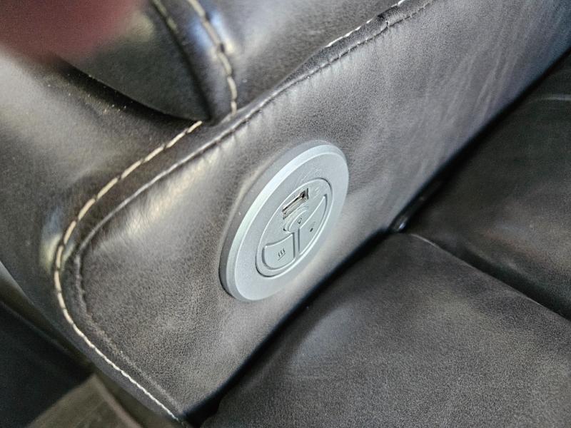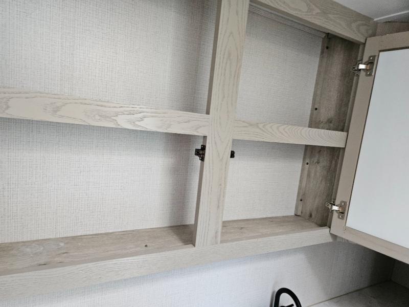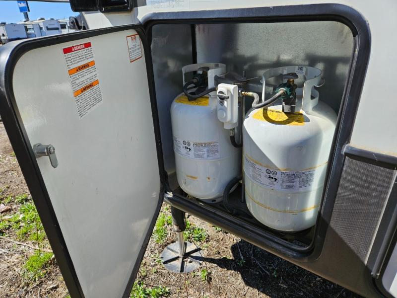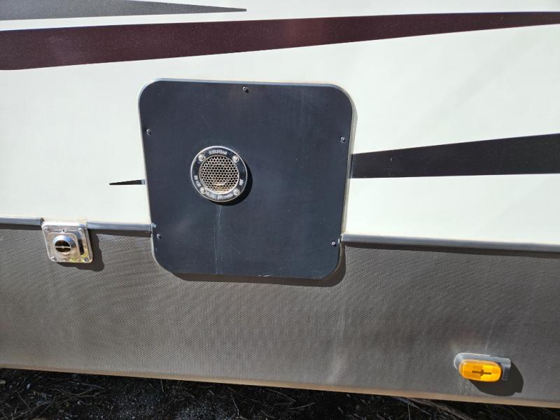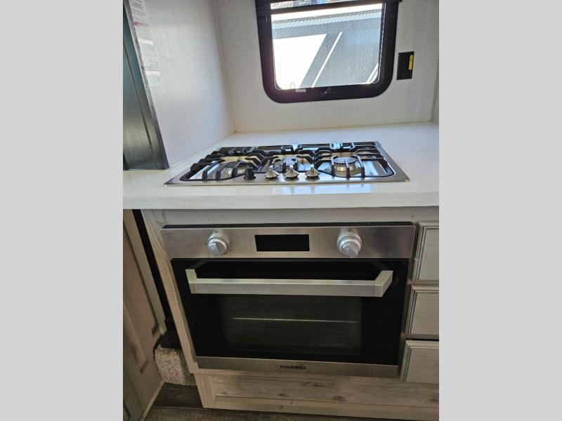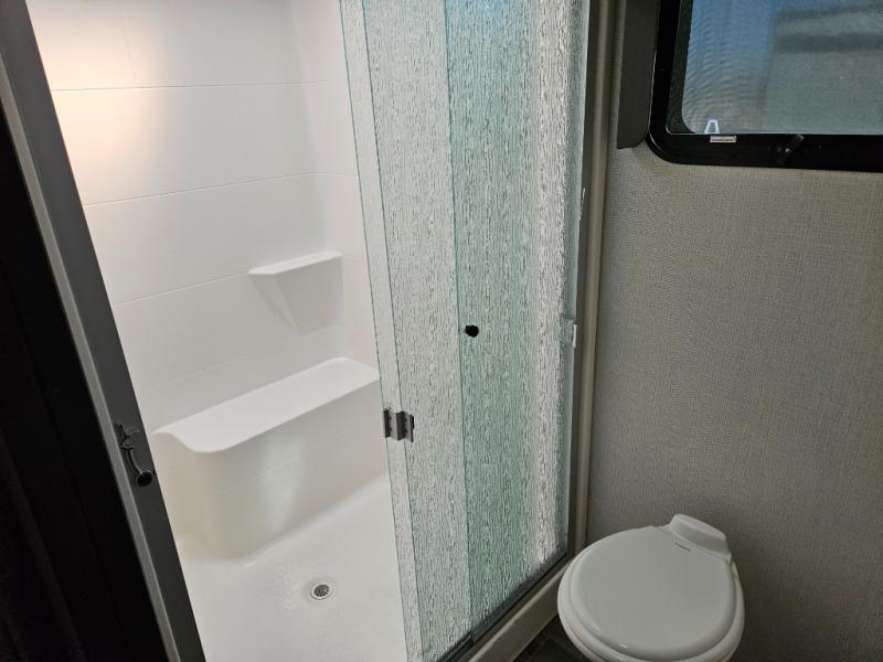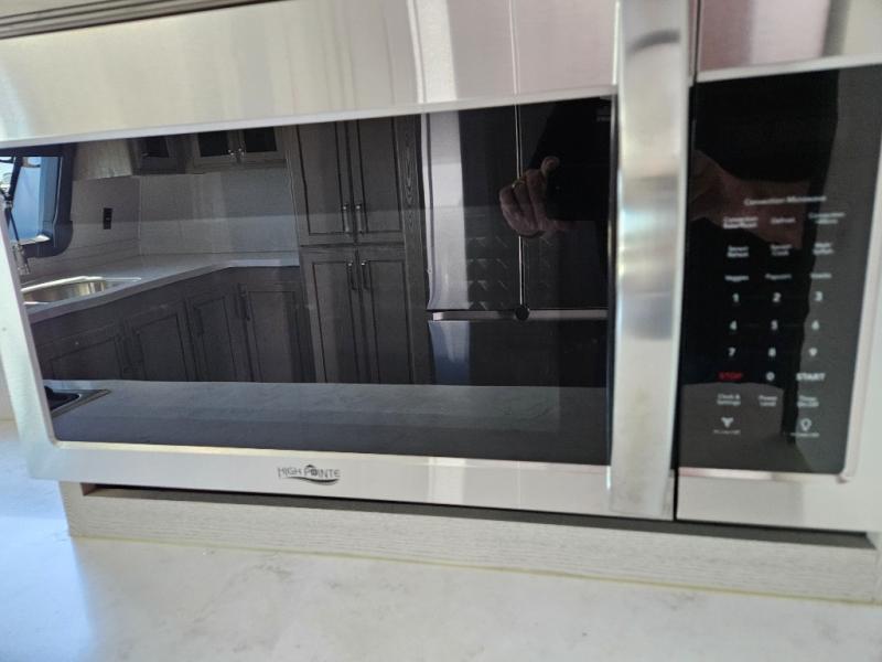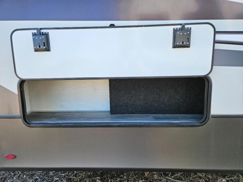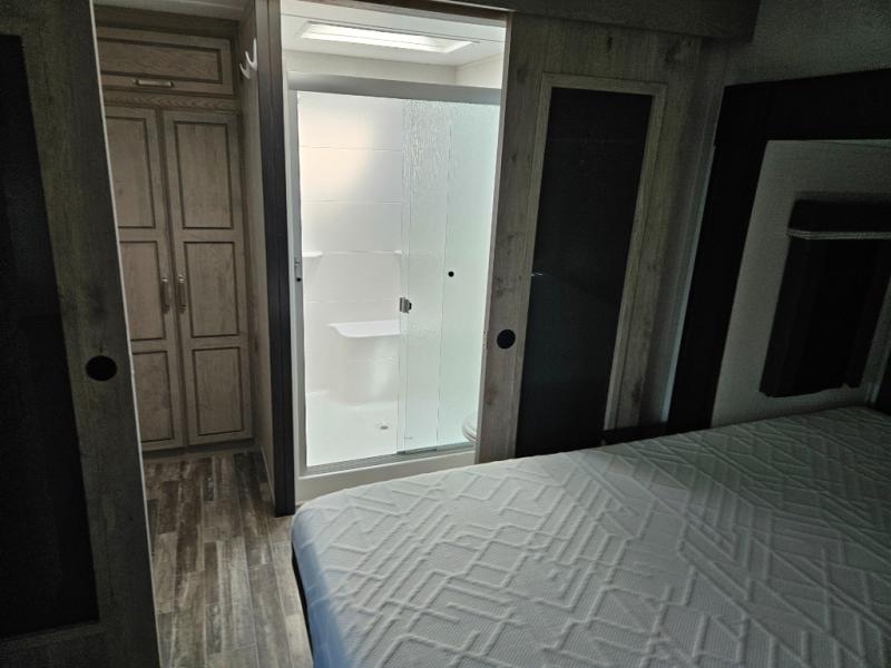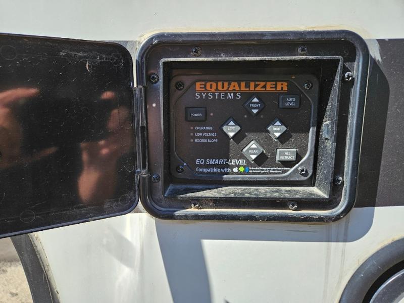 The chef of your group will love cooking in the front kitchen of this fifth wheel! The kitchen not only has extra countertop space to prepare your meals, a convection microwave, and 18 cu. ft. gas/electric refrigerator, but also a bar top with two bar stools overlooking the middle living area. Inside the living area is opposing tri-fold sofa sleeper slides that can be converted for extra sleeping spaces and Thomas Payne theater seating with heat, massage, LED lights, and a USB charging station across from an entertainment center with a 40" fireplace and 50" TV. The master suite has a king bed slide that has storage underneath and a chest with wardrobes on either side, plus access to the full rear bathroom which has a walk-in shower, a dual sink vanity for two to get ready at once, and an area prepped to add an optional washer and dryer!
