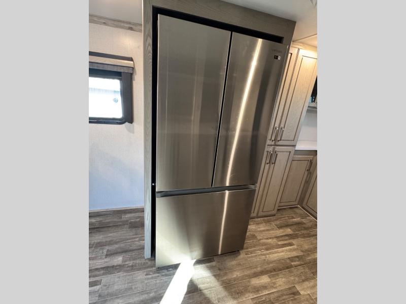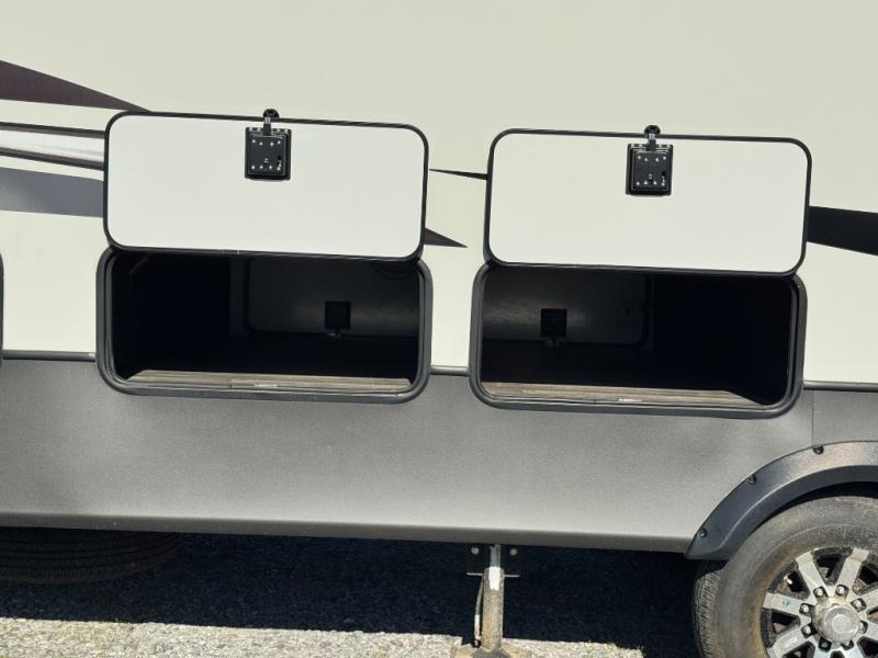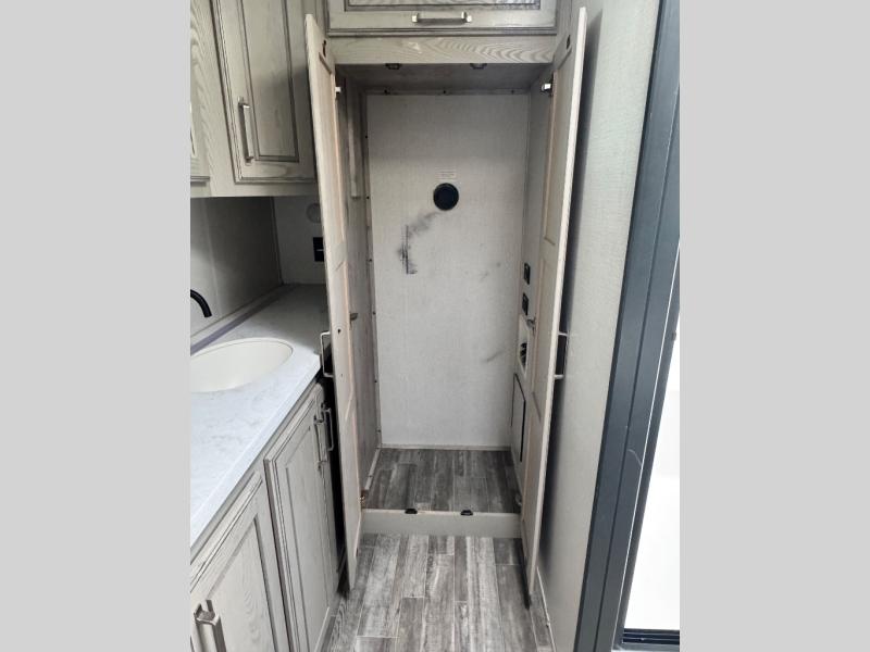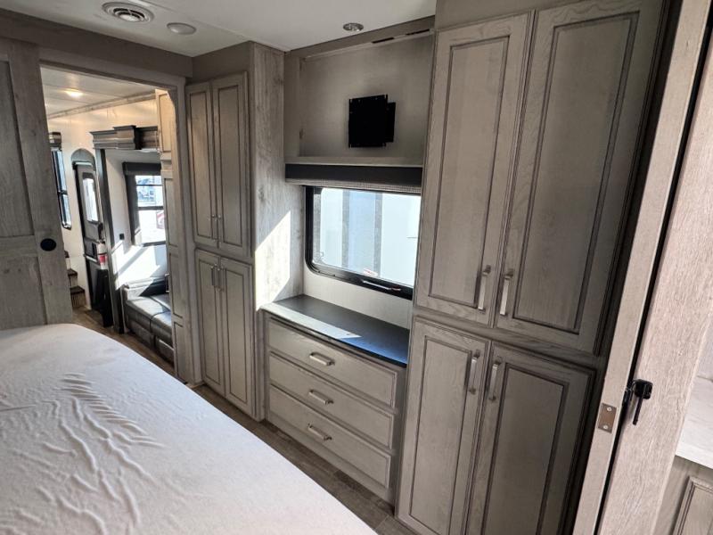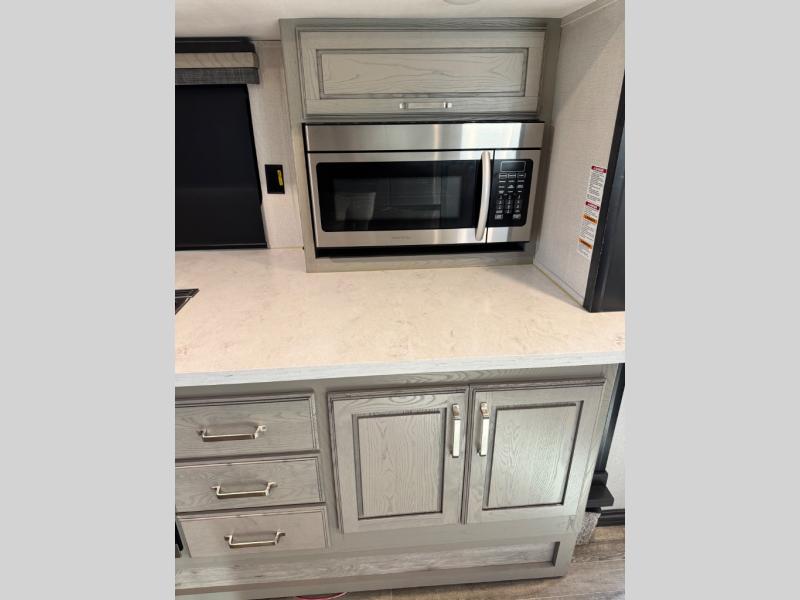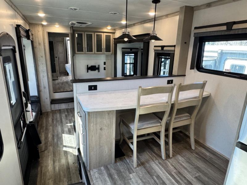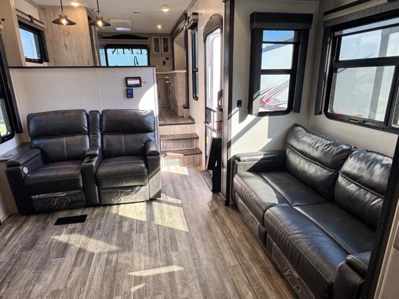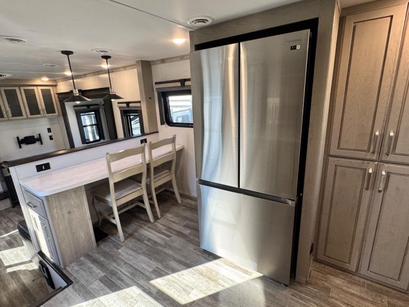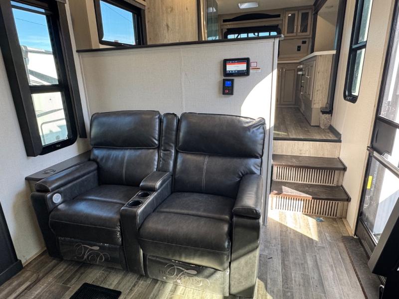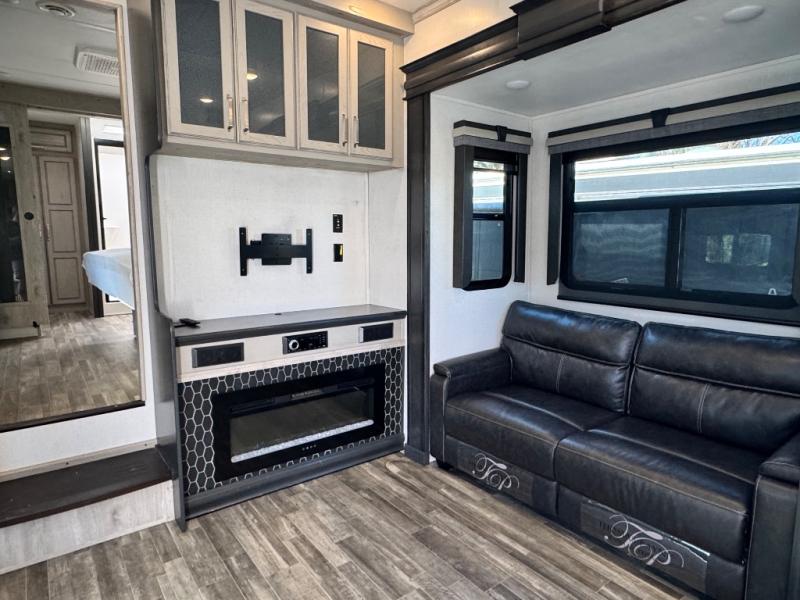 The chef of your group will love cooking in the front kitchen of this fifth wheel! The kitchen not only has extra countertop space to prepare your meals, a convection microwave, and 18 cu. ft. gas/electric refrigerator, but also a bar top with two bar stools overlooking the middle living area. Inside the living area is opposing tri-fold sofa sleeper slides that can be converted for extra sleeping spaces and Thomas Payne theater seating with heat, massage, LED lights, and a USB charging station across from an entertainment center with a 40" fireplace and 50" TV. The master suite has a king bed slide that has storage underneath and a chest with wardrobes on either side, plus access to the full rear bathroom which has a walk-in shower, a dual sink vanity for two to get ready at once, and an area prepped to add an optional washer and dryer!