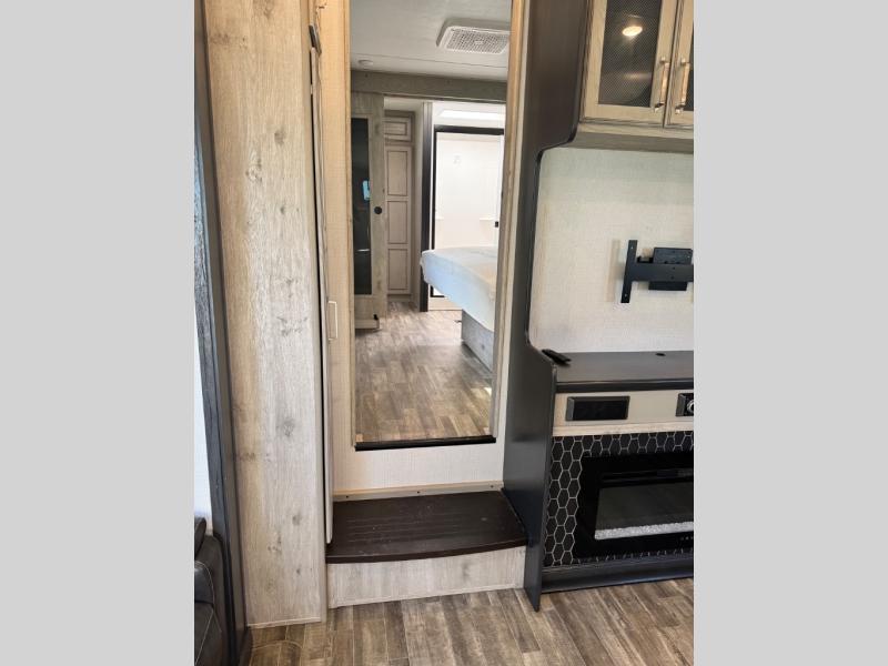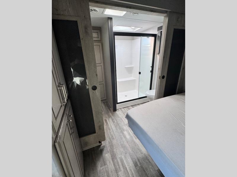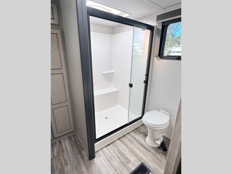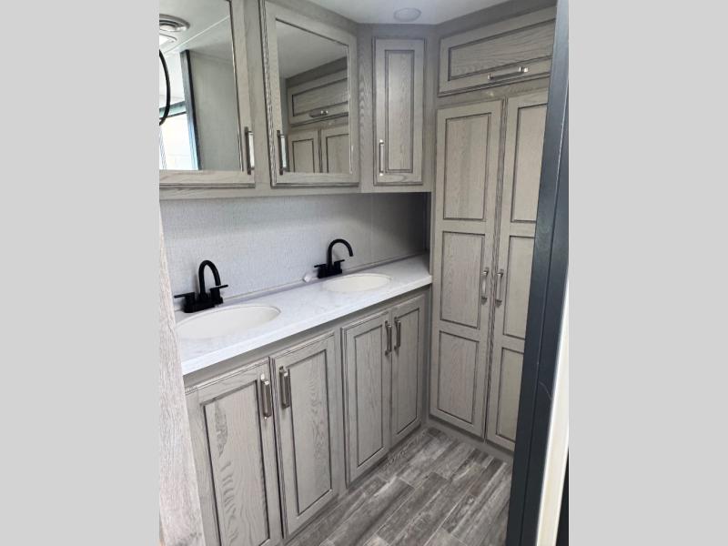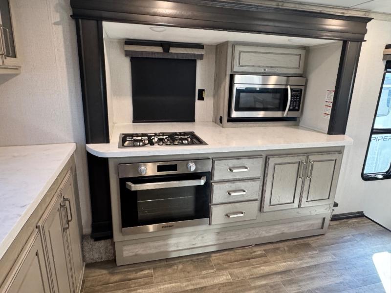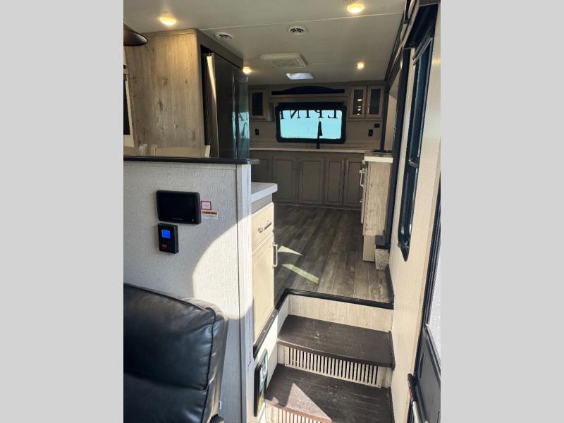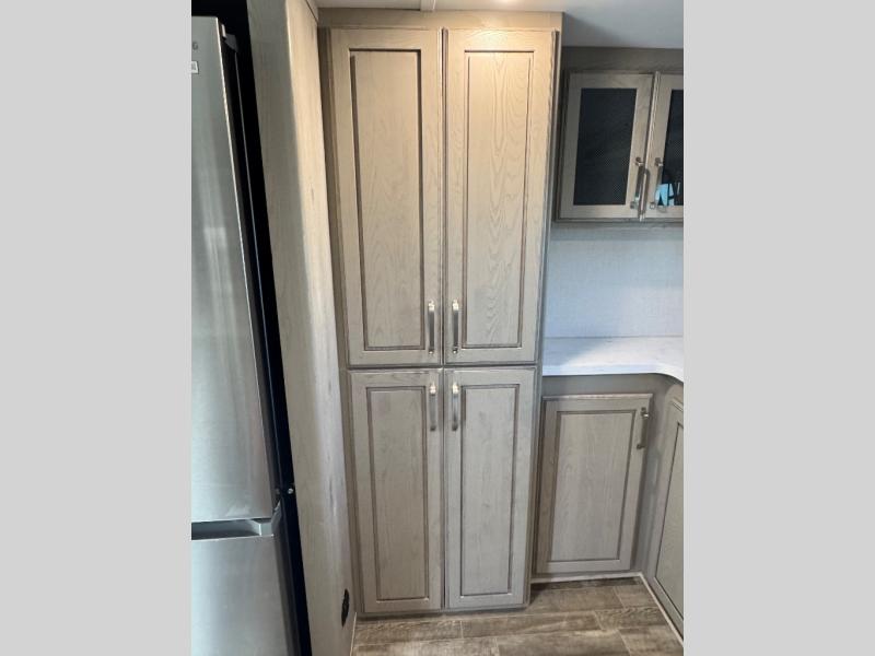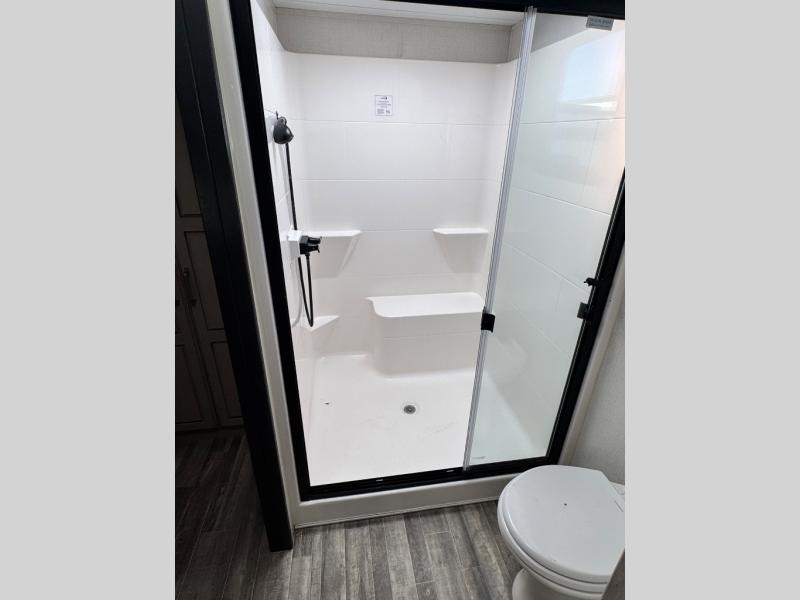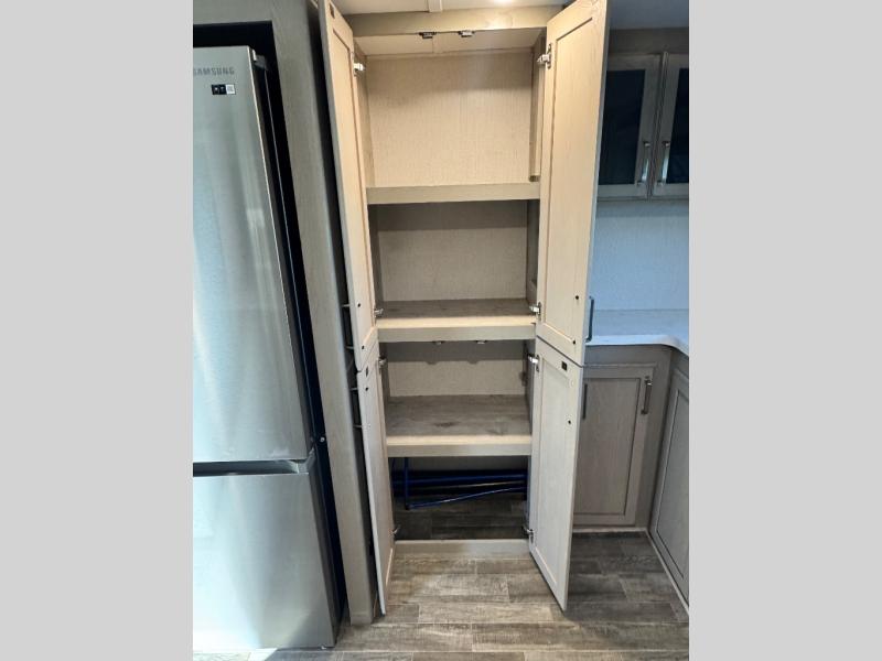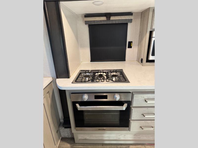 The chef of your group will love cooking in the front kitchen of this fifth wheel! The kitchen not only has extra countertop space to prepare your meals, a convection microwave, and 18 cu. ft. gas/electric refrigerator, but also a bar top with two bar stools overlooking the middle living area. Inside the living area is opposing tri-fold sofa sleeper slides that can be converted for extra sleeping spaces and Thomas Payne theater seating with heat, massage, LED lights, and a USB charging station across from an entertainment center with a 40" fireplace and 50" TV. The master suite has a king bed slide that has storage underneath and a chest with wardrobes on either side, plus access to the full rear bathroom which has a walk-in shower, a dual sink vanity for two to get ready at once, and an area prepped to add an optional washer and dryer!