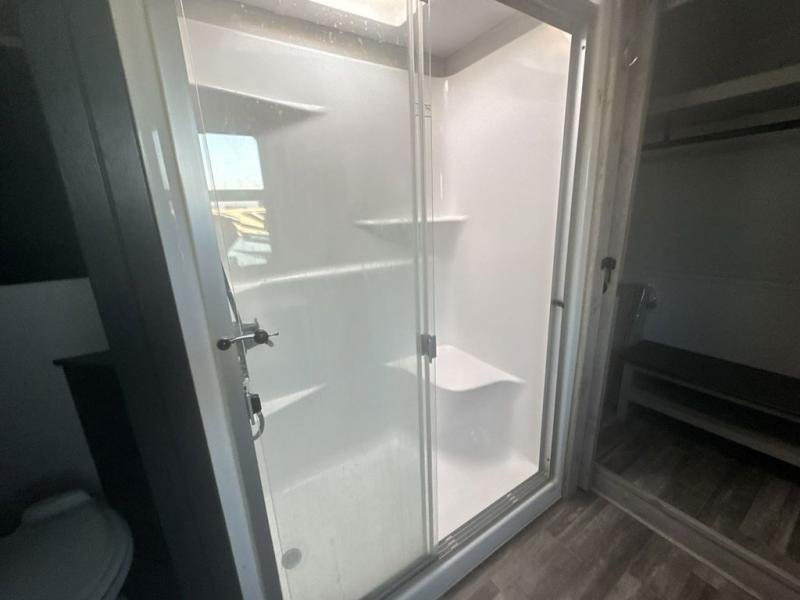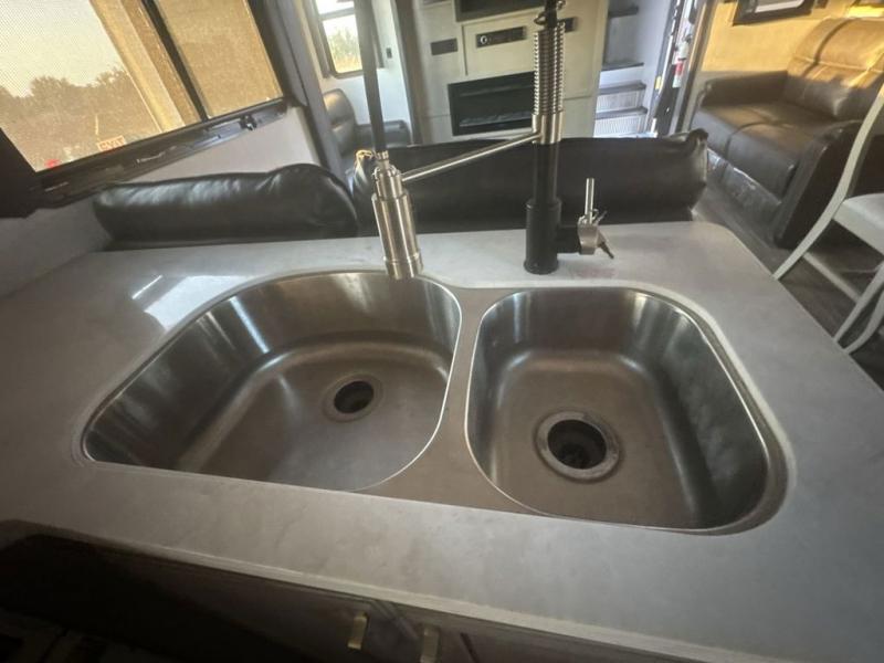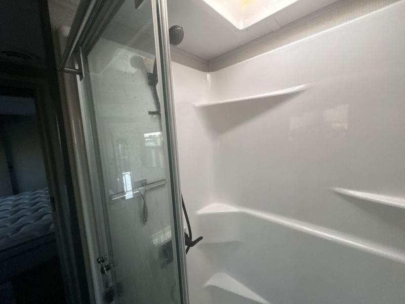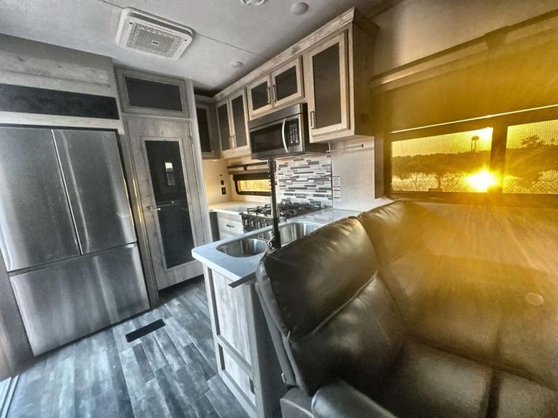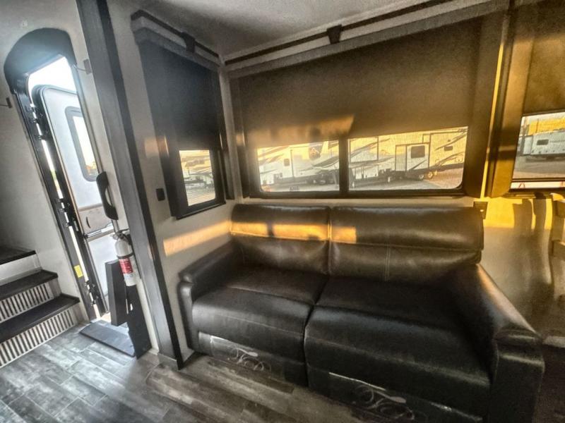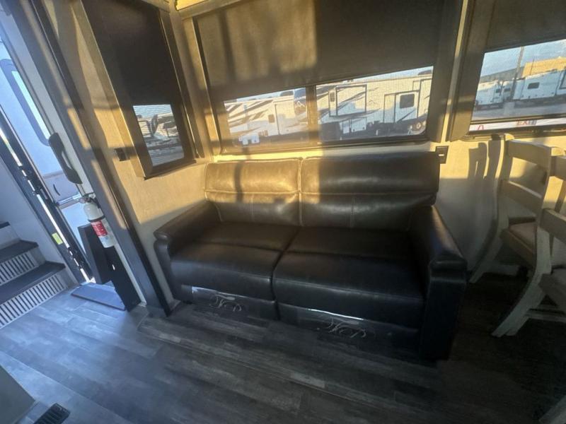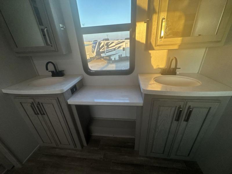 With a bath and a half, it's a clean decision to take this fifth wheel with you on your next camping trip! One of the dual entry doors leads directly into the rear kitchen which has a large pantry and a 18 cu. ft. gas/electric refrigerator to store your food items. The free standing dinette and tri-fold sofa sleeper slide and opposing tri-fold sofa sleeper slide opens up the middle living area for more walking around space. The half bathroom is conveniently next to the living area and has an area prepped to add the an optional washer and dryer for clean clothes throughout your entire trip. The master suite not only has a king bed slide with storage underneath and a bench next to a dresser, but also access into the front full bathroom which has a dual sink vanity, a shower with a seat, and a toilet with privacy walls!