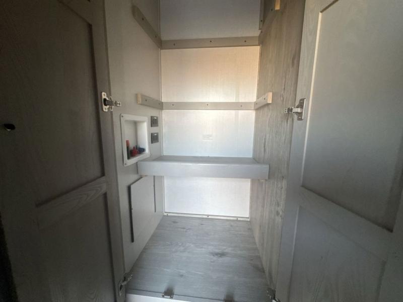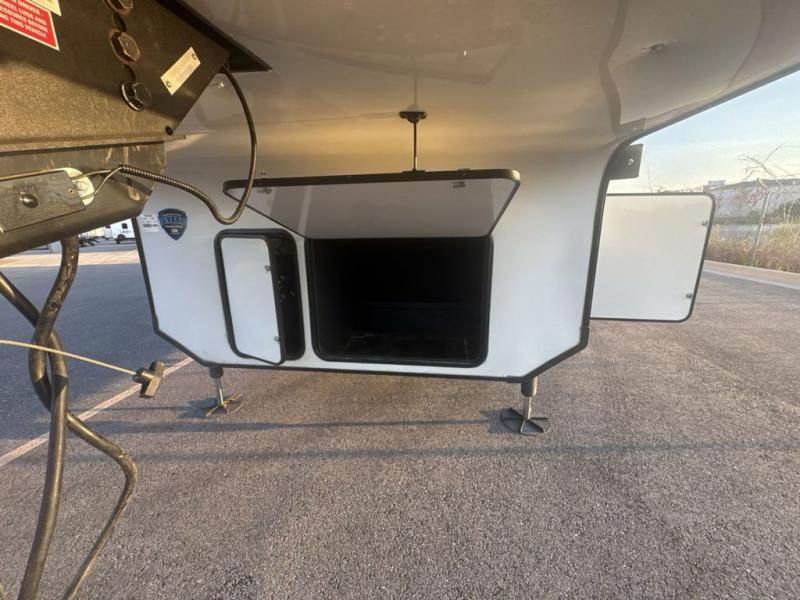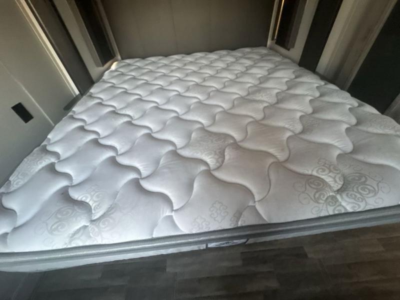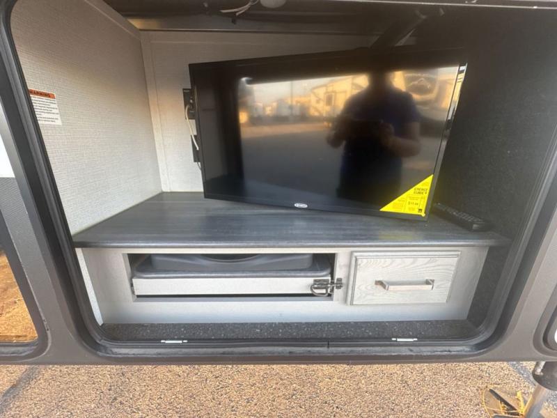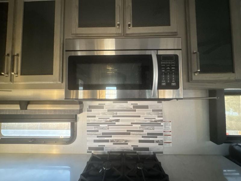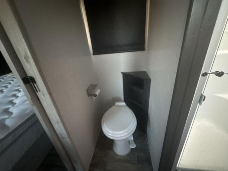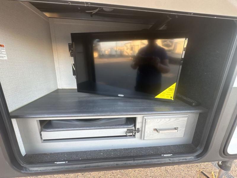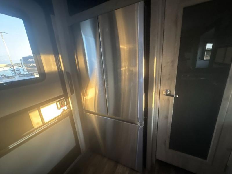 With a bath and a half, it's a clean decision to take this fifth wheel with you on your next camping trip! One of the dual entry doors leads directly into the rear kitchen which has a large pantry and a 18 cu. ft. gas/electric refrigerator to store your food items. The free standing dinette and tri-fold sofa sleeper slide and opposing tri-fold sofa sleeper slide opens up the middle living area for more walking around space. The half bathroom is conveniently next to the living area and has an area prepped to add the an optional washer and dryer for clean clothes throughout your entire trip. The master suite not only has a king bed slide with storage underneath and a bench next to a dresser, but also access into the front full bathroom which has a dual sink vanity, a shower with a seat, and a toilet with privacy walls!