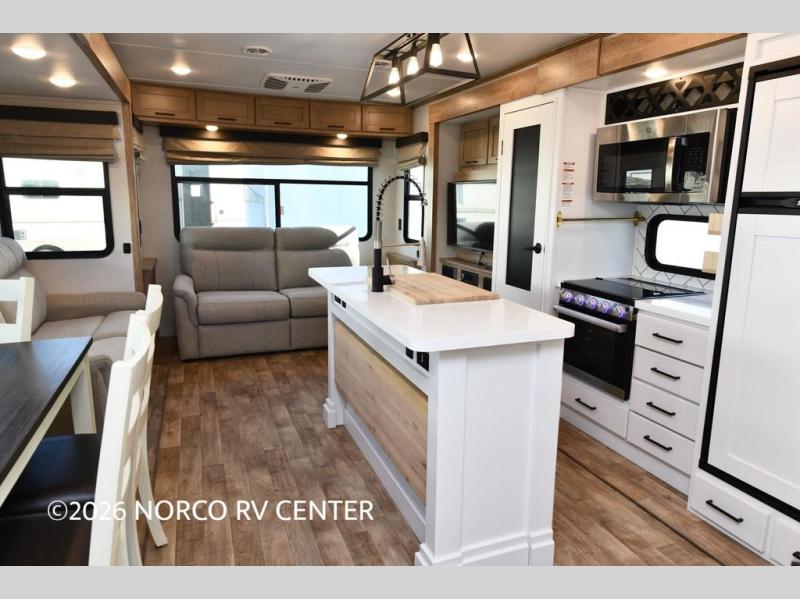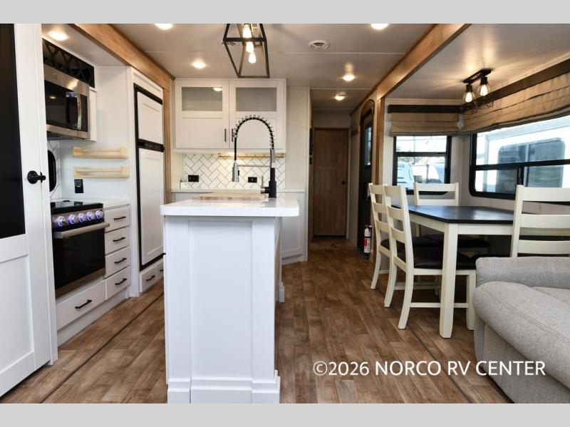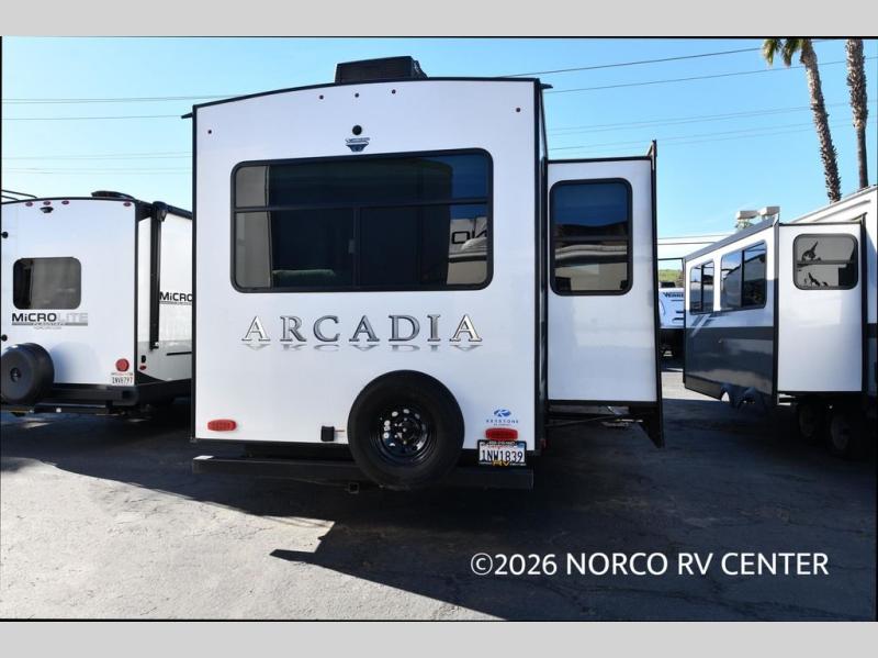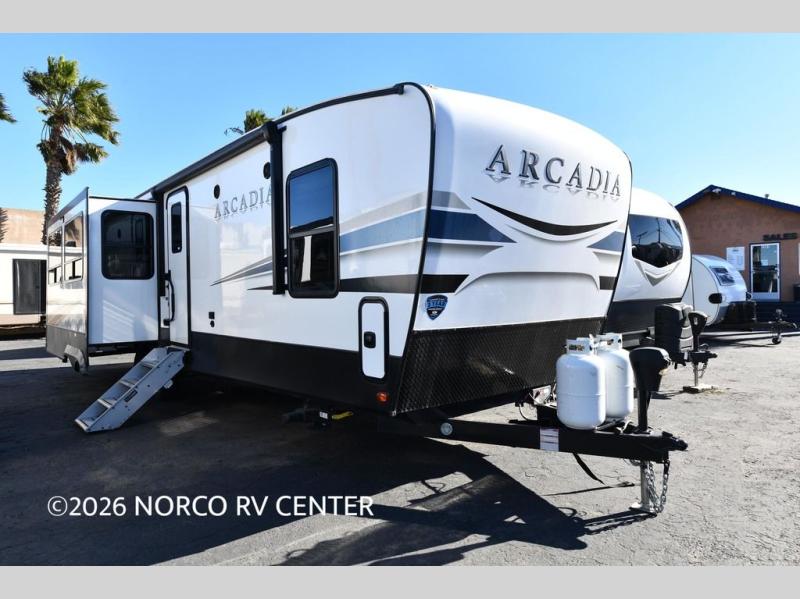 It's time to camp better with Keystone, and the Arcadia travel trailers and 3/4 ton fifth wheels allow you to do just that! There are many features that come standard you are sure to appreciate, like the Blade high-performance air flow system, the Tru-Fit slide construction, and the durable Hyper Deck flooring. Each model features the Curt Performance Package with HD axles with reinforced axle wall tube, HD forward self-adjusting brake assembly, a rubberized equalization suspension system, and more to create a smooth towing experience. You will enjoy an HD flat screen TV included with each model, plus there is a Winegard AIR 360 amplified omni-directional antenna and satellite and cable prep on all TV's to keep you entertained throughout your camping trips. The Arcadia kitchen features custom cabinetry with solid wood and painted cabinet doors, oversized drawers for maximum storage space, a stainless steel farmhouse style sink, plus many more comforts.