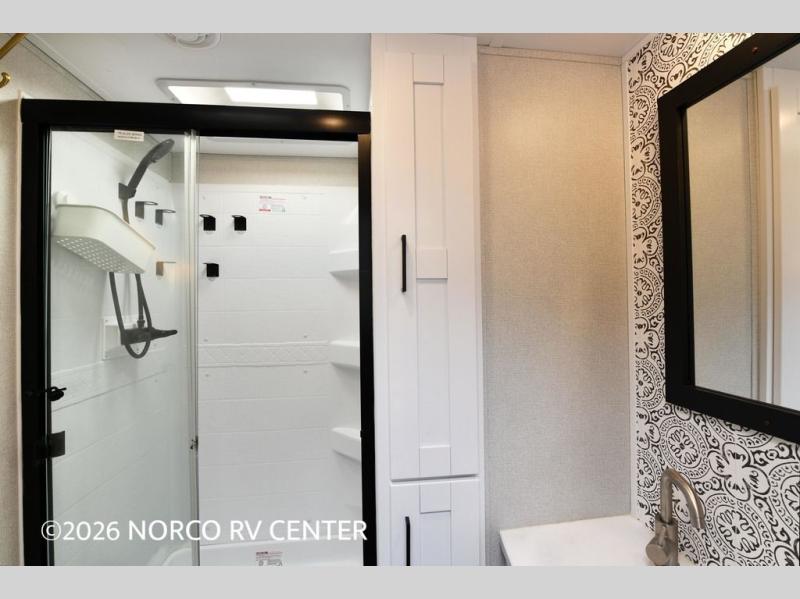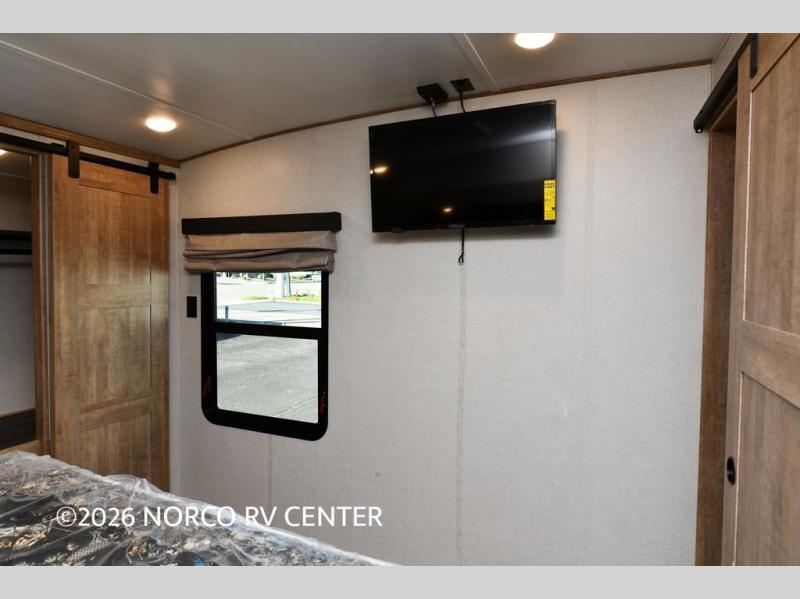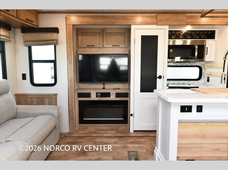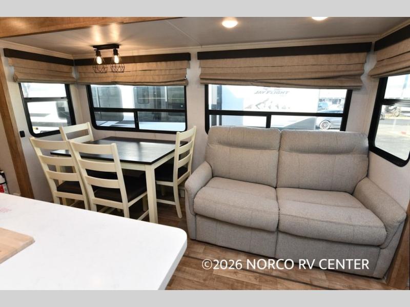 Camp in comfort with this travel trailer in tow! Once you arrive at the campground, set up the 11' power awning and enjoy a cold drink before heading out for the day. The chef of your group can prepare lunch at the kitchen island that includes a flip-up counter workstation, while the little ones play a game at the free-standing table. There is also theater seating here and a 40" TV with a fireplace for those cooler fall evenings. When it's time to call it a night, you will love the slide out California king bed with two drawers underneath, plus additional storage behind the drawers. There is a walk-in closet with wrap-around shelving, plus a bench seat and even more shelves for all your valuables.